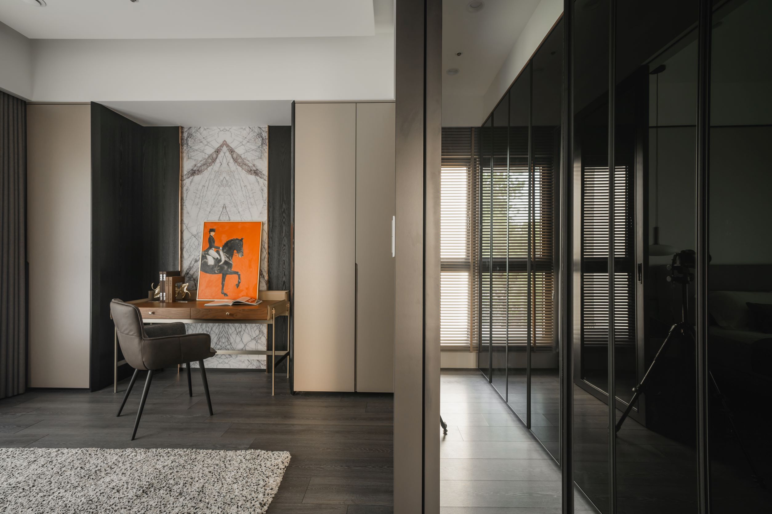 在流通的廊道中,餐廚空間上沒有隔間而是以中島設計將空間區隔,讓視覺上不會有阻斷的感覺,保持空間設計的通透感,並在牆面以鏡面的材質讓空間在視覺上有一種擴展的錯覺,同時結合照明設計讓裝潢風格有滿滿的輕奢體驗。