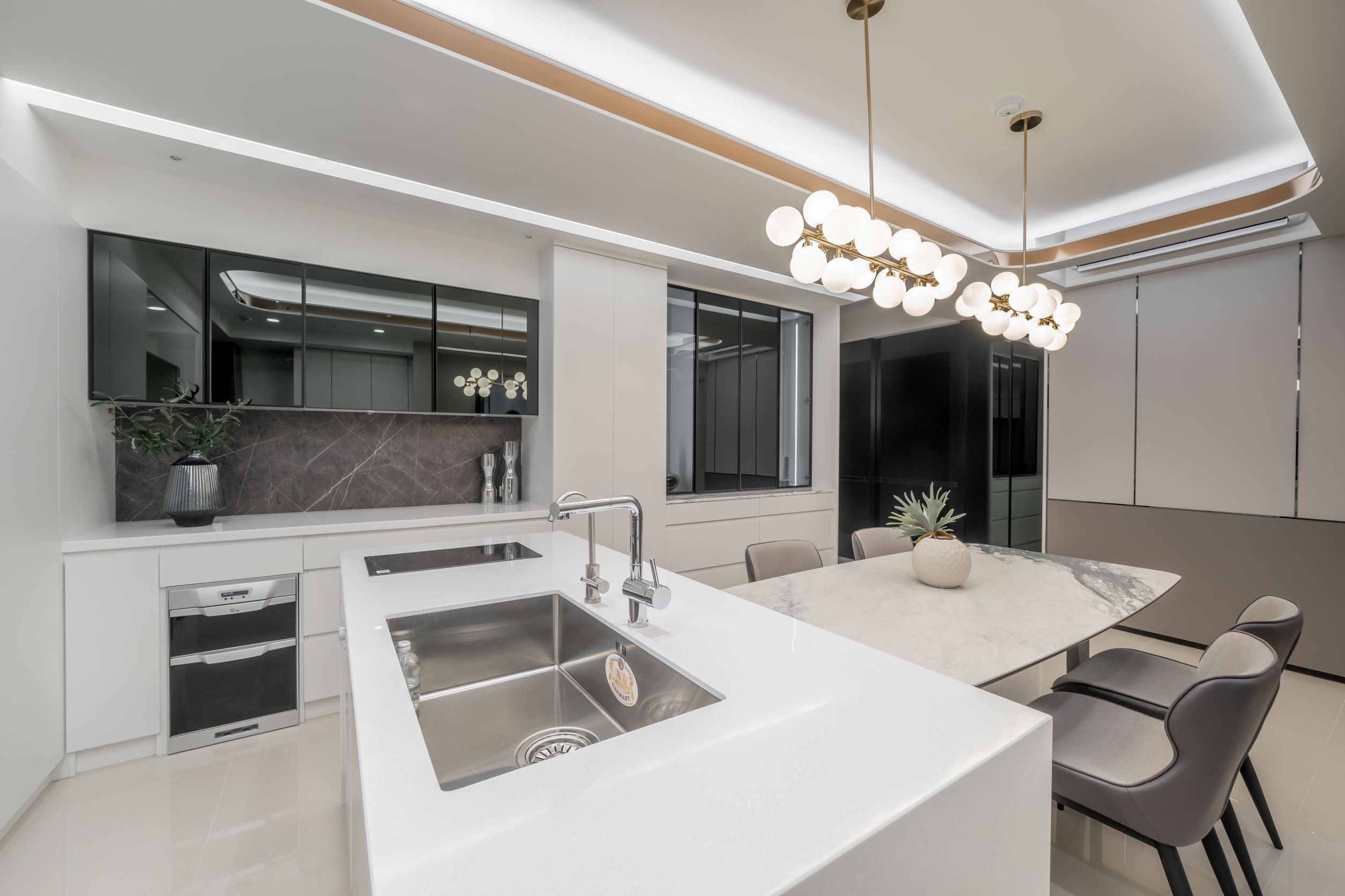 原本狹小的餐廚空間,透過拆除RC牆(鋼筋混泥牆),以開放式手法連結中島吧台與餐桌,並安排整面收納櫃,讓所有餐廚器具各得其所,使得整體更為寬敞舒適,加上輕盈夢幻的鍍金吊燈,為一家人創造充滿儀式感的用餐時光。