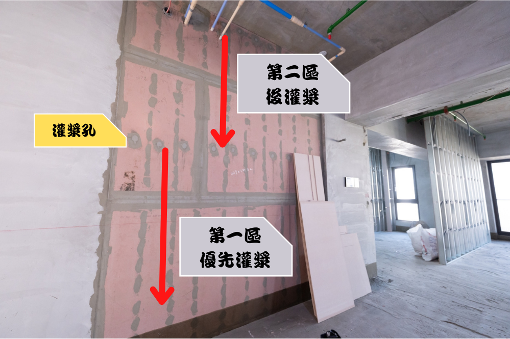 請注意,灌漿千萬不可以一次一個孔完成,由於灌漿壓力較大,一次填滿很有可能造成壓力過大將板材撐裂開,這個工千萬不能省。