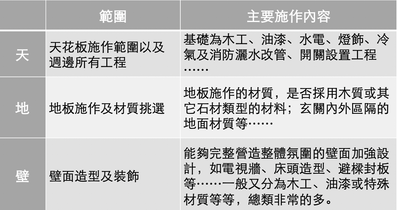 大坪數裝潢設計,天、地,壁的施作內容參考: