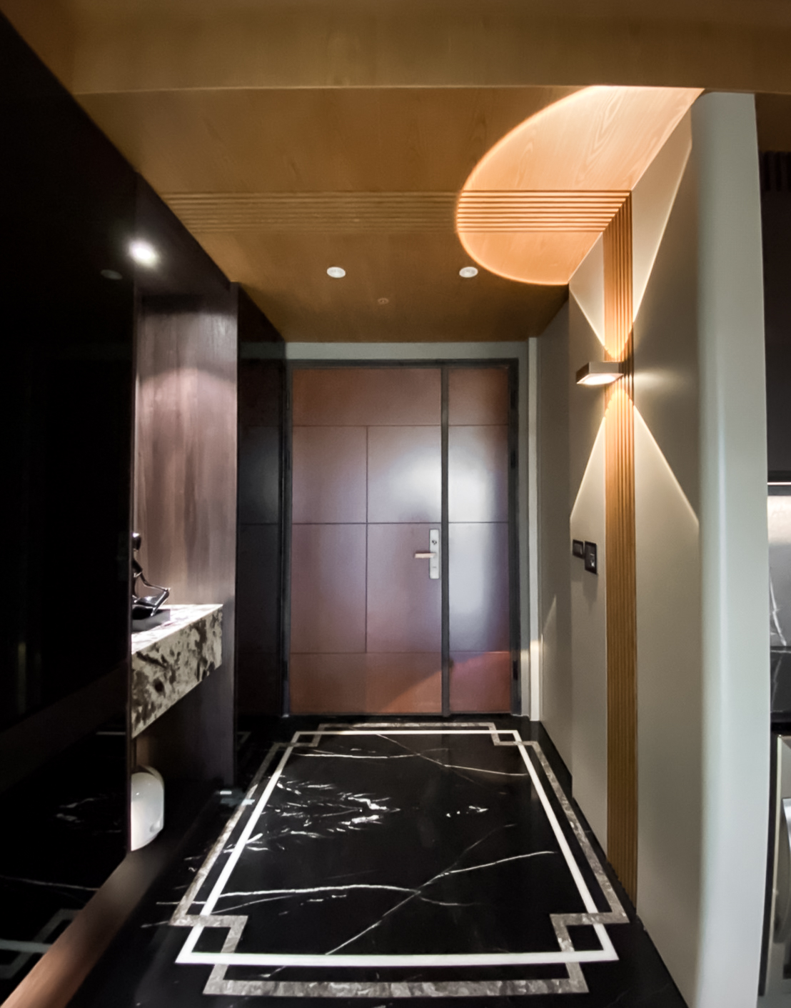 「當初其實有在思考要不要做屏風,總監以他的專業建議,沒有屏風比較開闊,因為想要做出內、外區隔的感覺,最後選擇了地板石材切割出空間,再加上一些燈光的應用,效果真的很滿意。」