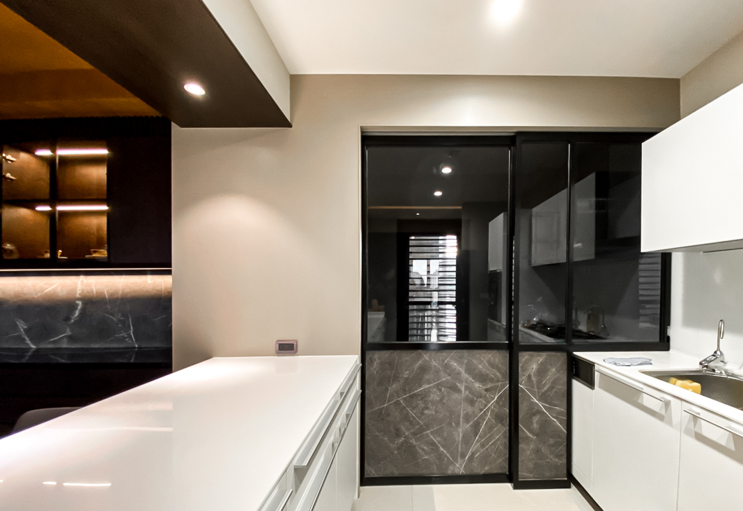 「當初大樓的原始標配為開放式廚房,也擔心家具會有一些油煙附著的問題,所以特別在瓦斯爐區規劃了拉門,讓熱炒區成為獨立的空間;這個拉門設計之後,因為水槽變成在拉門之外,對於炒菜料理的動線其實有點礙手礙腳的,一天要開開關關十幾次其實不方便。」