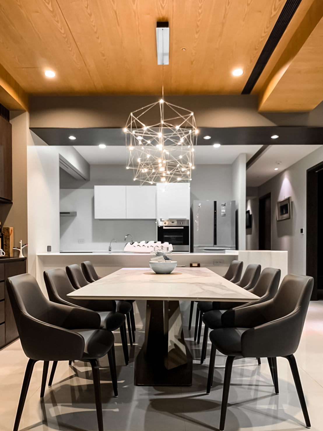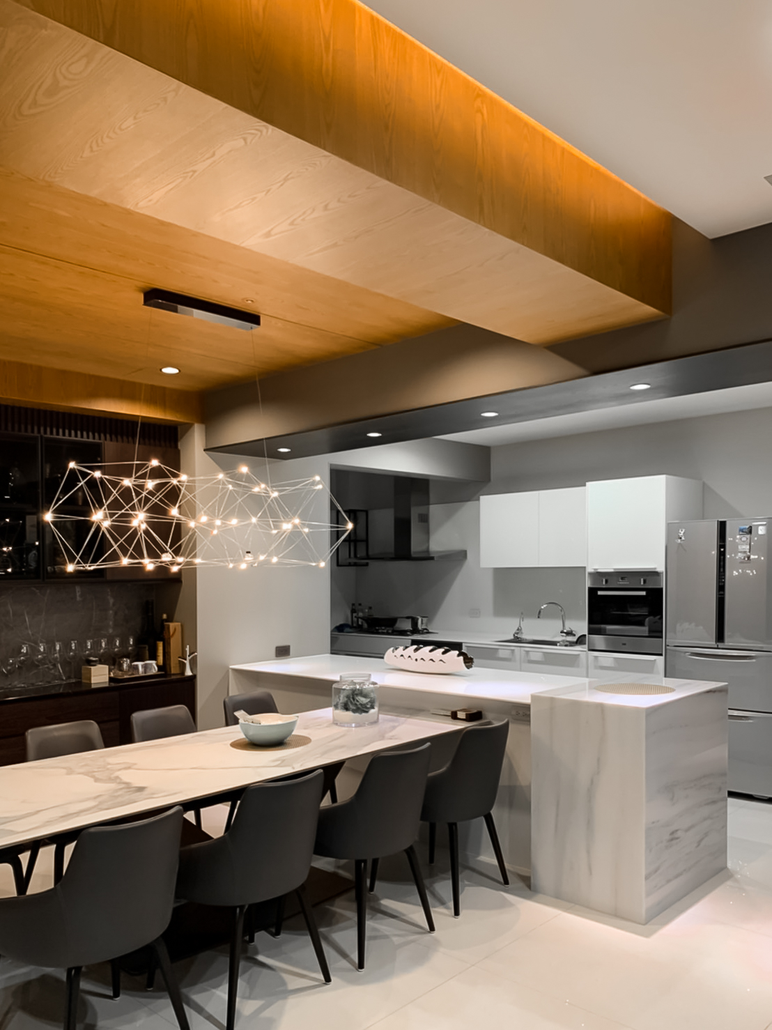 (同款石材讓中島及餐桌視覺延伸,搭配上軟裝燈飾讓餐廳區域更顯格調)