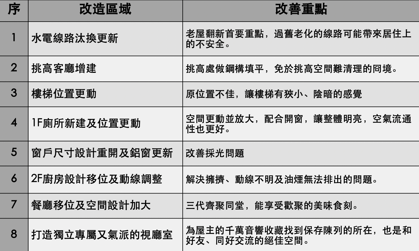 在與屋主深談後,將以一、二樓最重要的生活空間,改善關鍵問題: