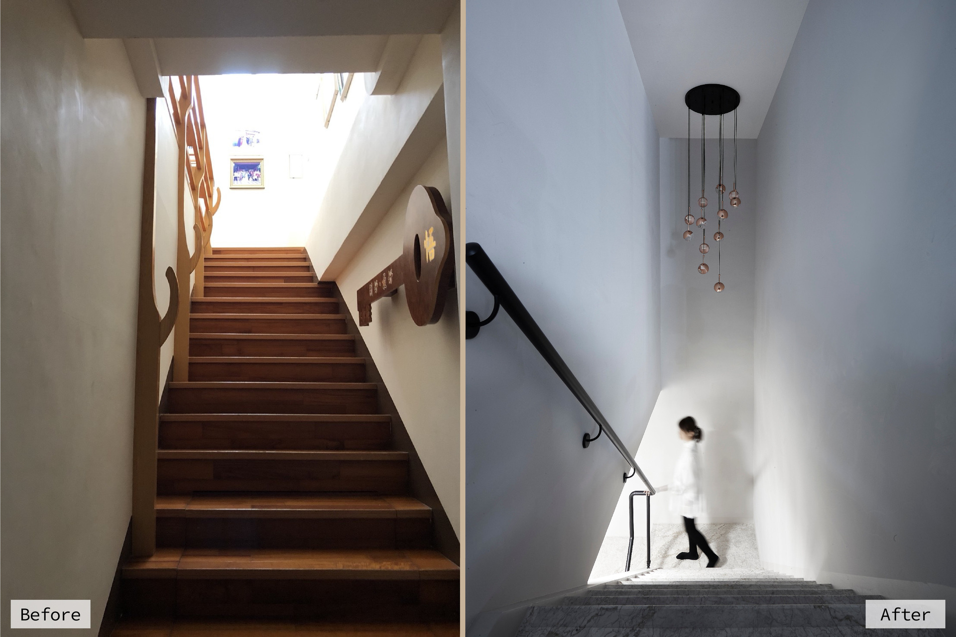 原本梯的設計在建築物的後方,故比較狹小幽暗,後來考量改裝需求,改到電梯邊和梯在一起,讓整體動線更流暢。