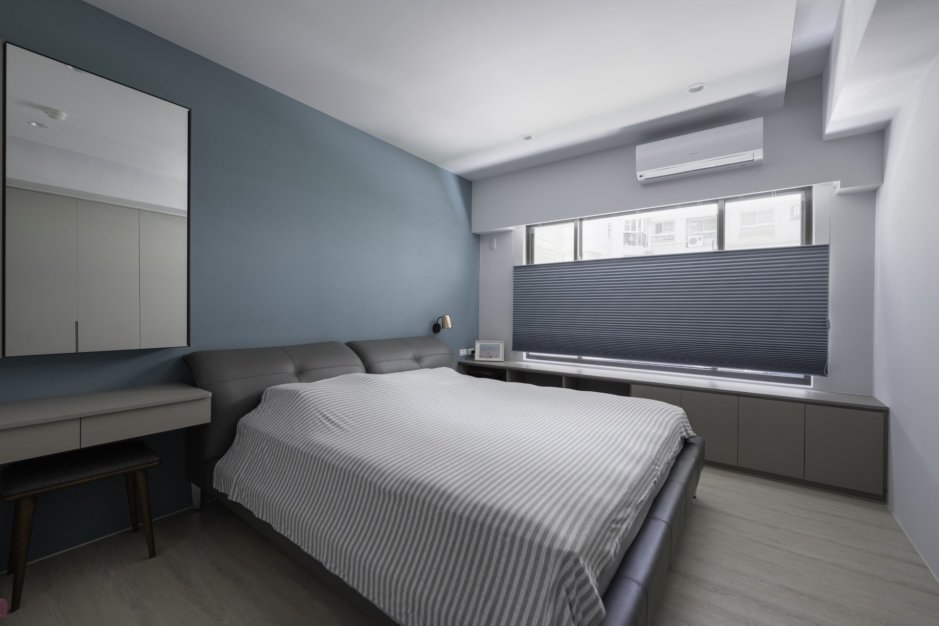 另還有女主需要的化妝台以及可放置小物的鏡櫃也通通都到位,衣櫃部份則採全系統櫃佈置,主色調以灰色搭配地板木紋,呈現臥室應用的明亮、舒適的感受。