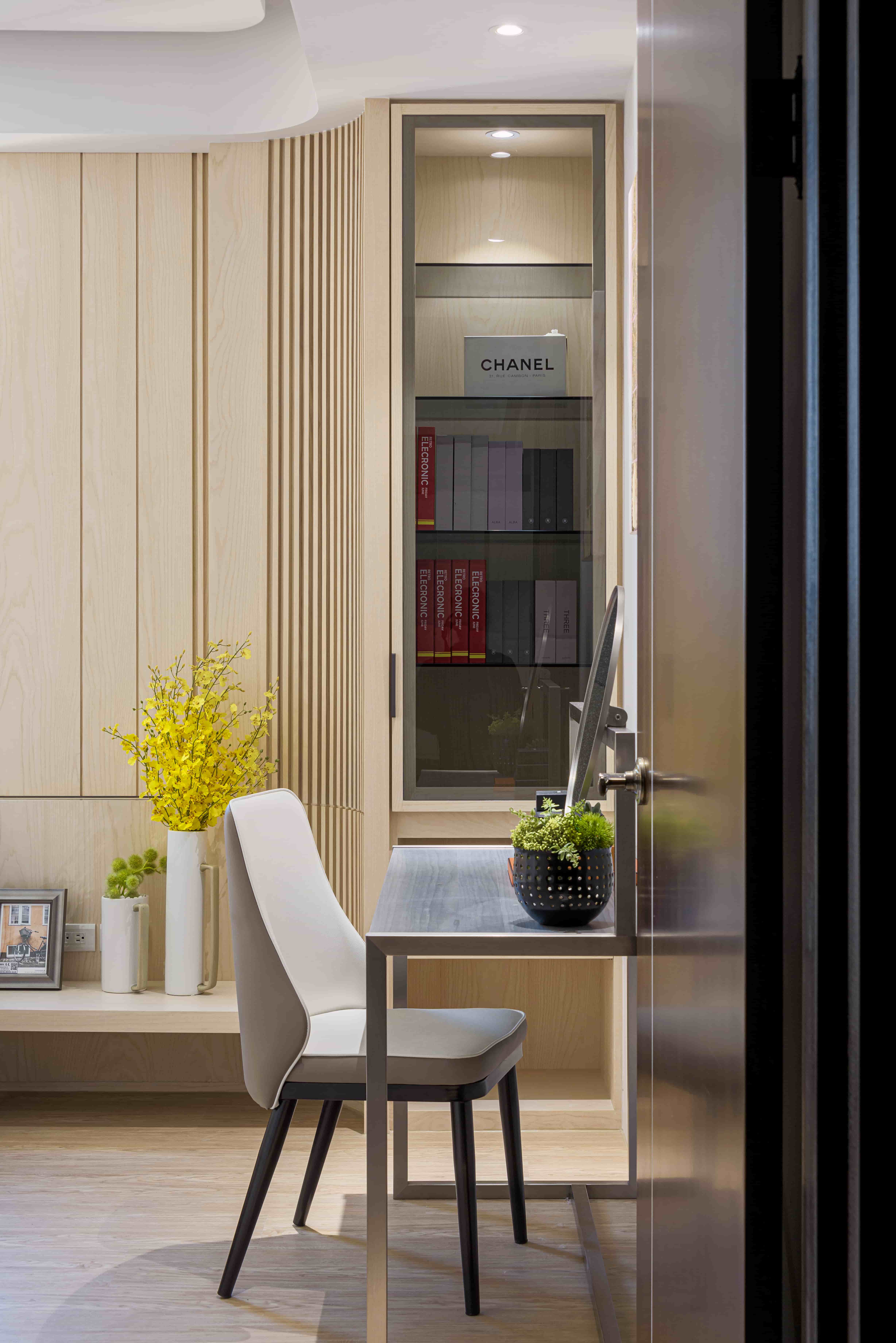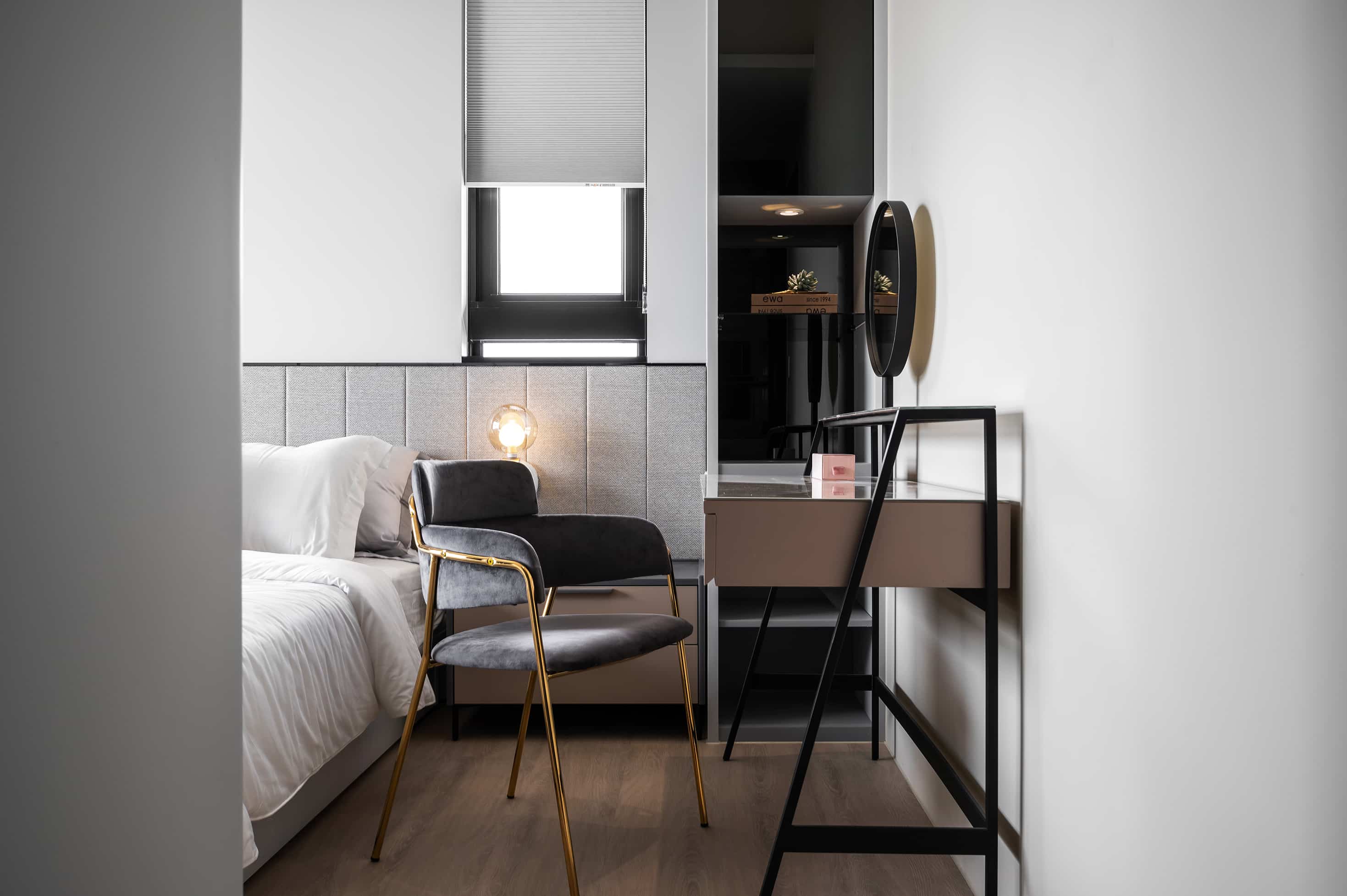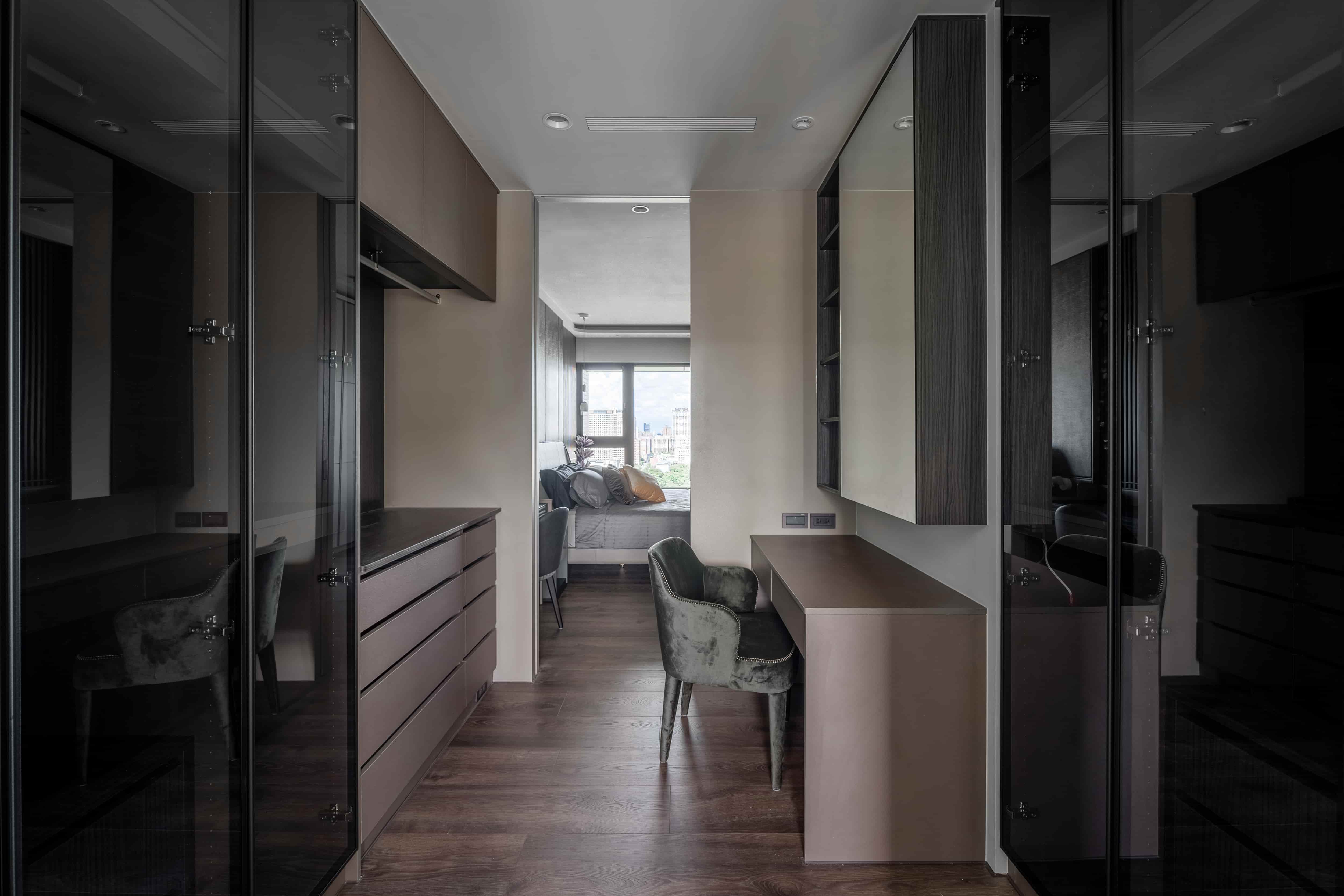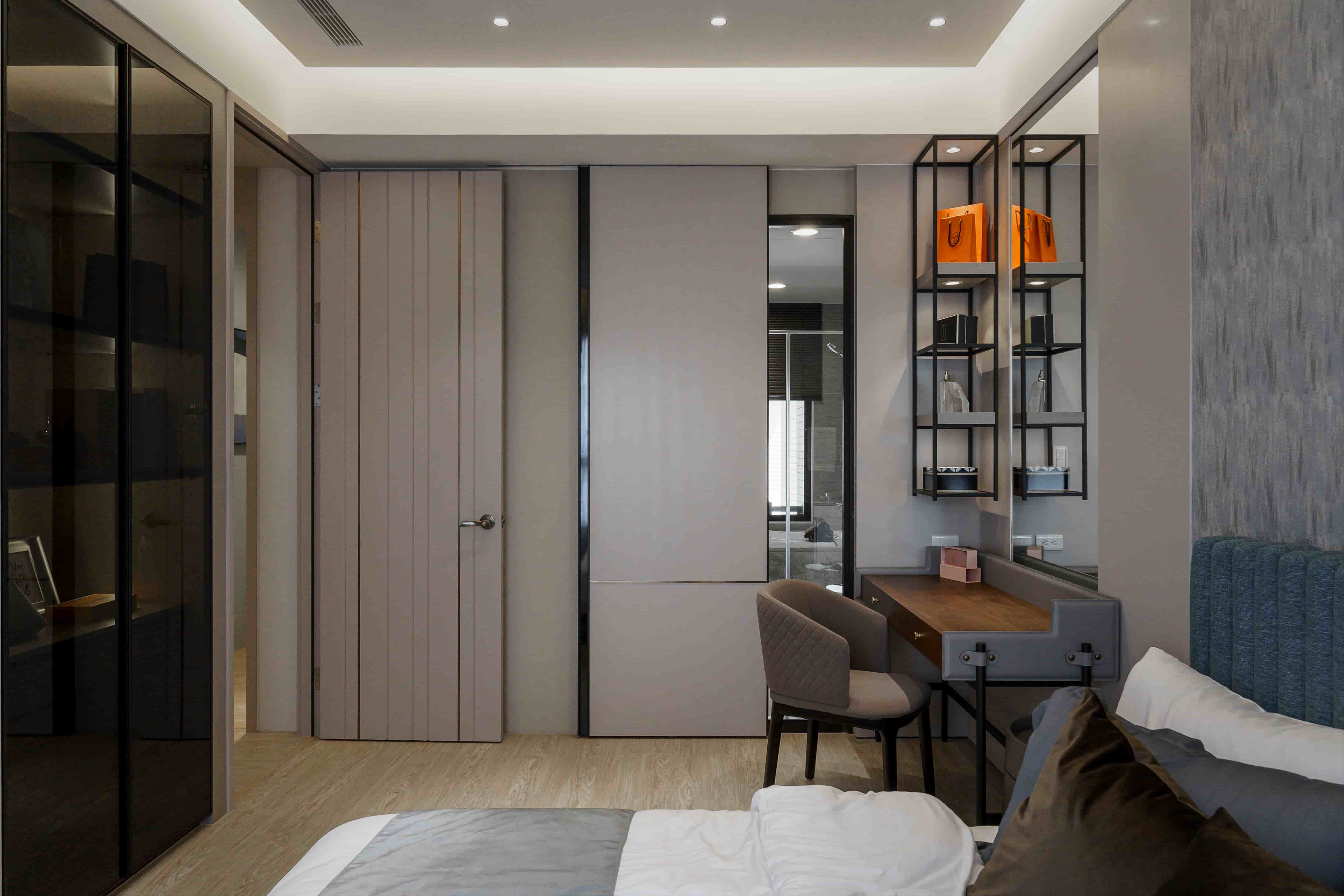化妝桌設計桌面以木皮材質為主,除了耐用性高之外,也和整體設計十分百搭。加上其鄰窗又靠近廁所的位置,不挑環境的木皮也是不錯的選擇。