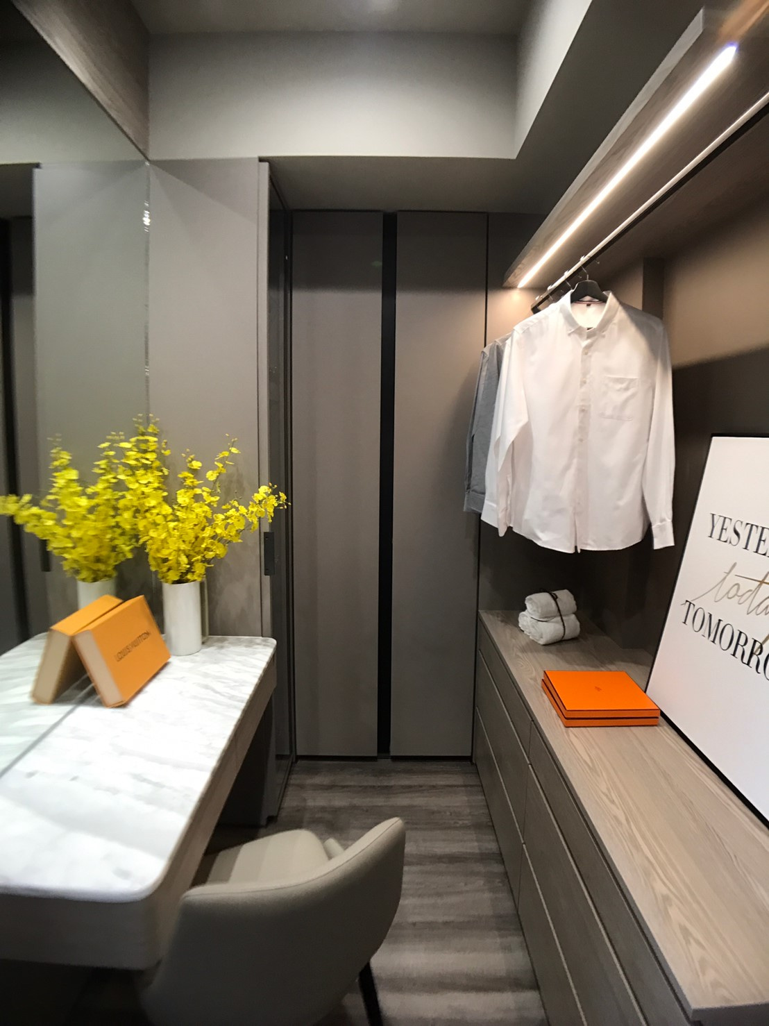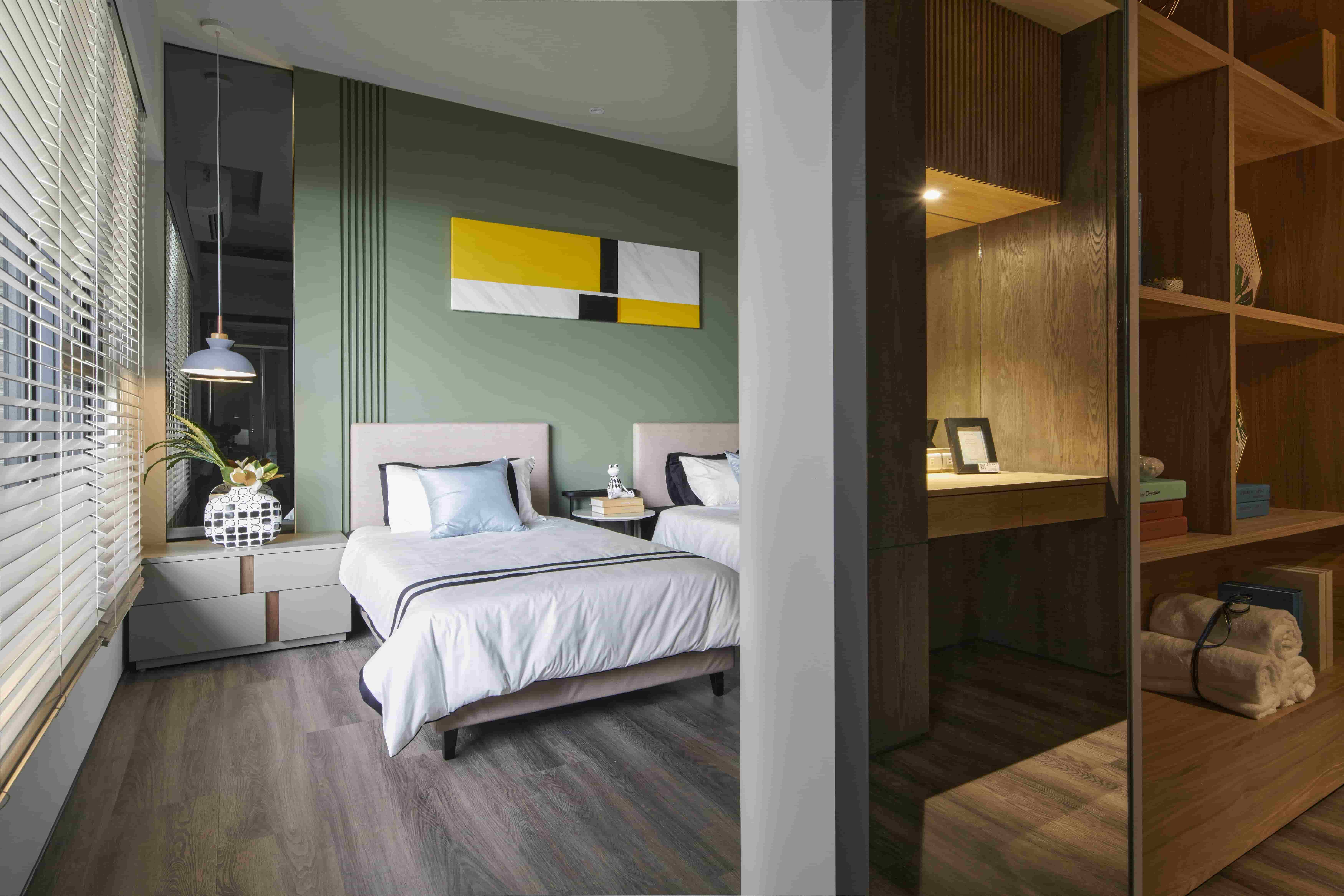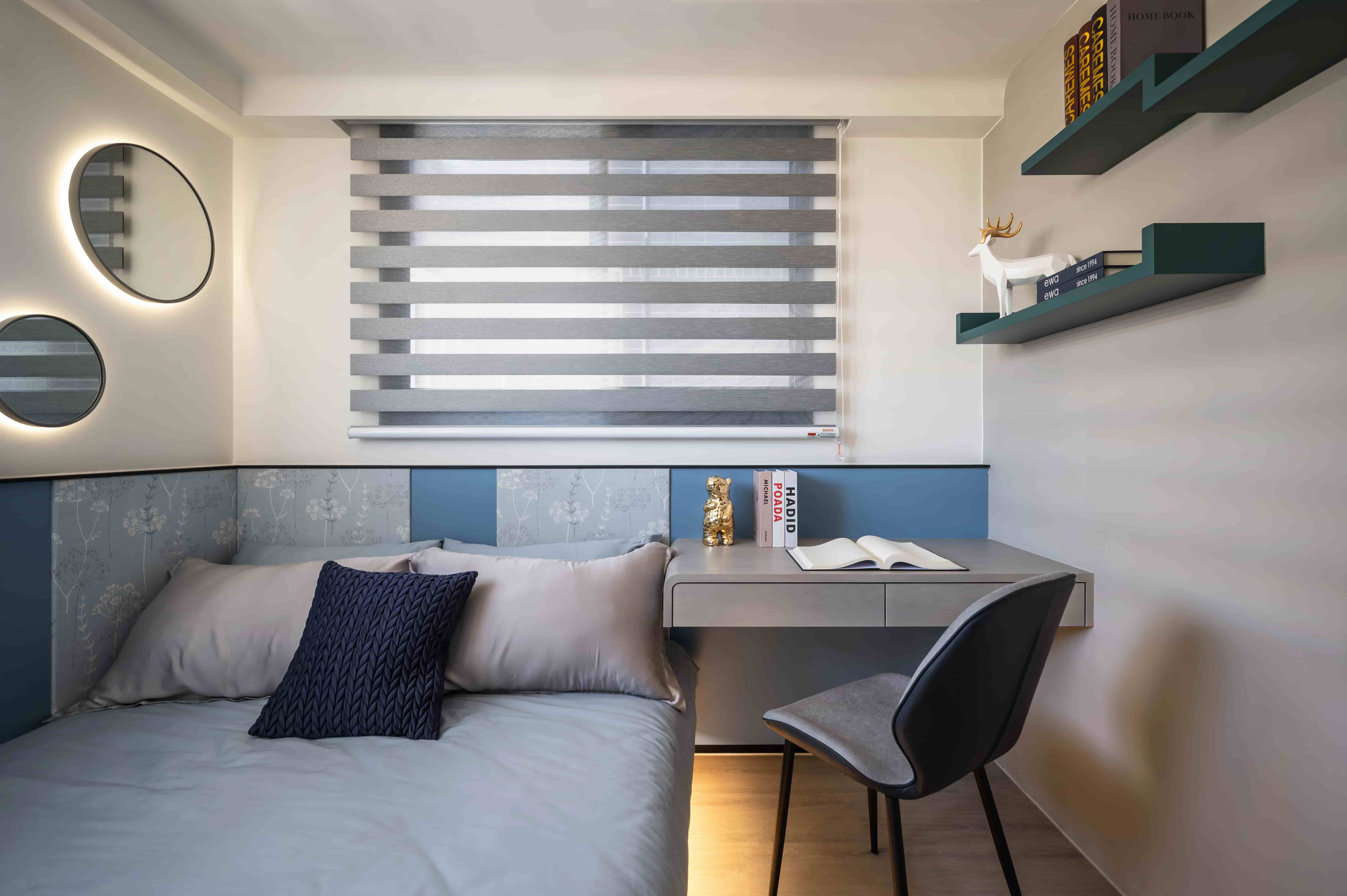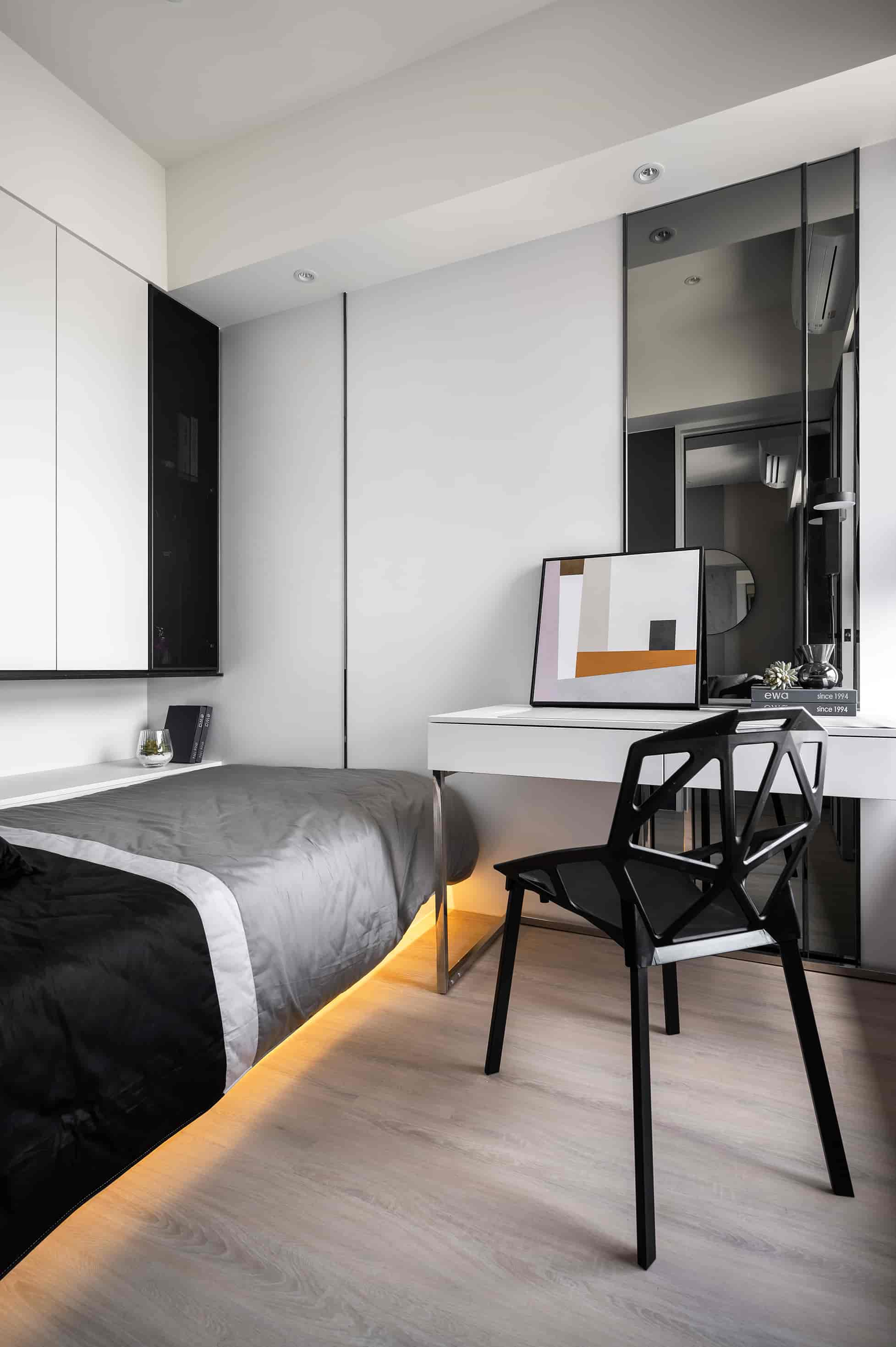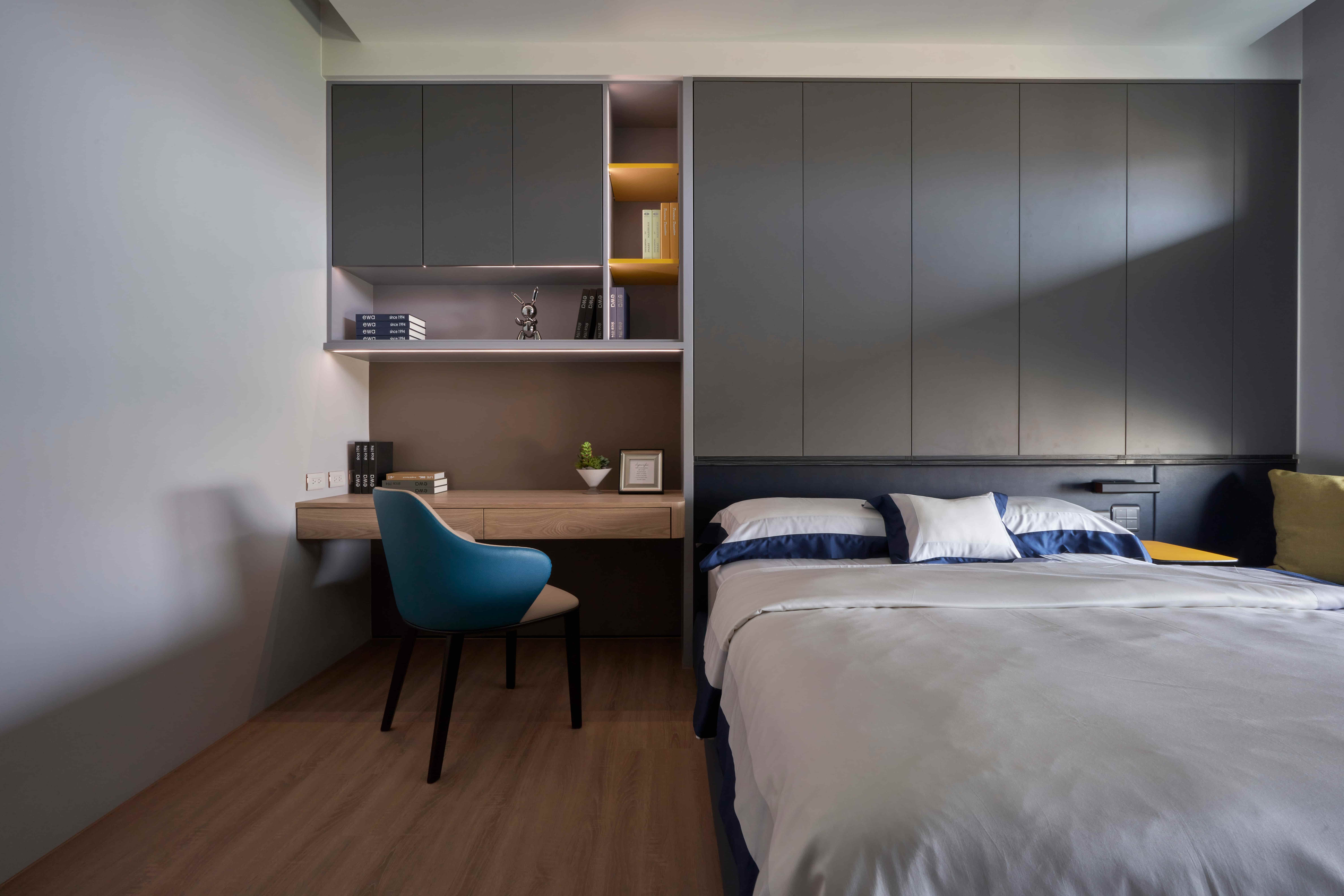 化妝桌設計桌面以木皮材質為主,除了耐用性高之外,也和整體設計十分百搭。加上其鄰窗又靠近廁所的位置,不挑環境的木皮也是不錯的選擇。