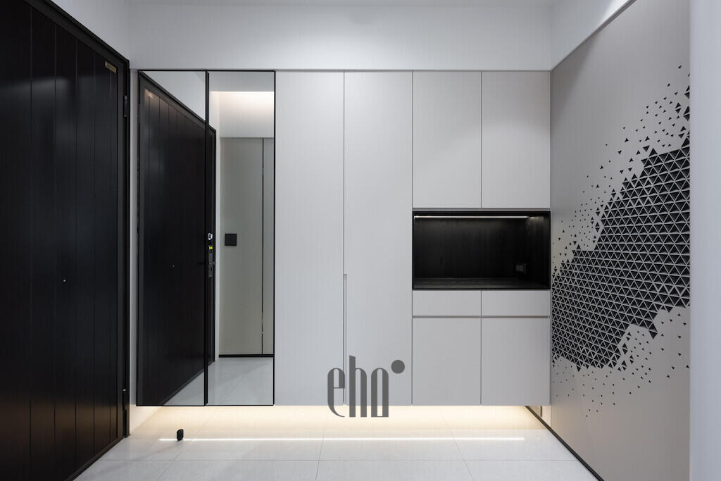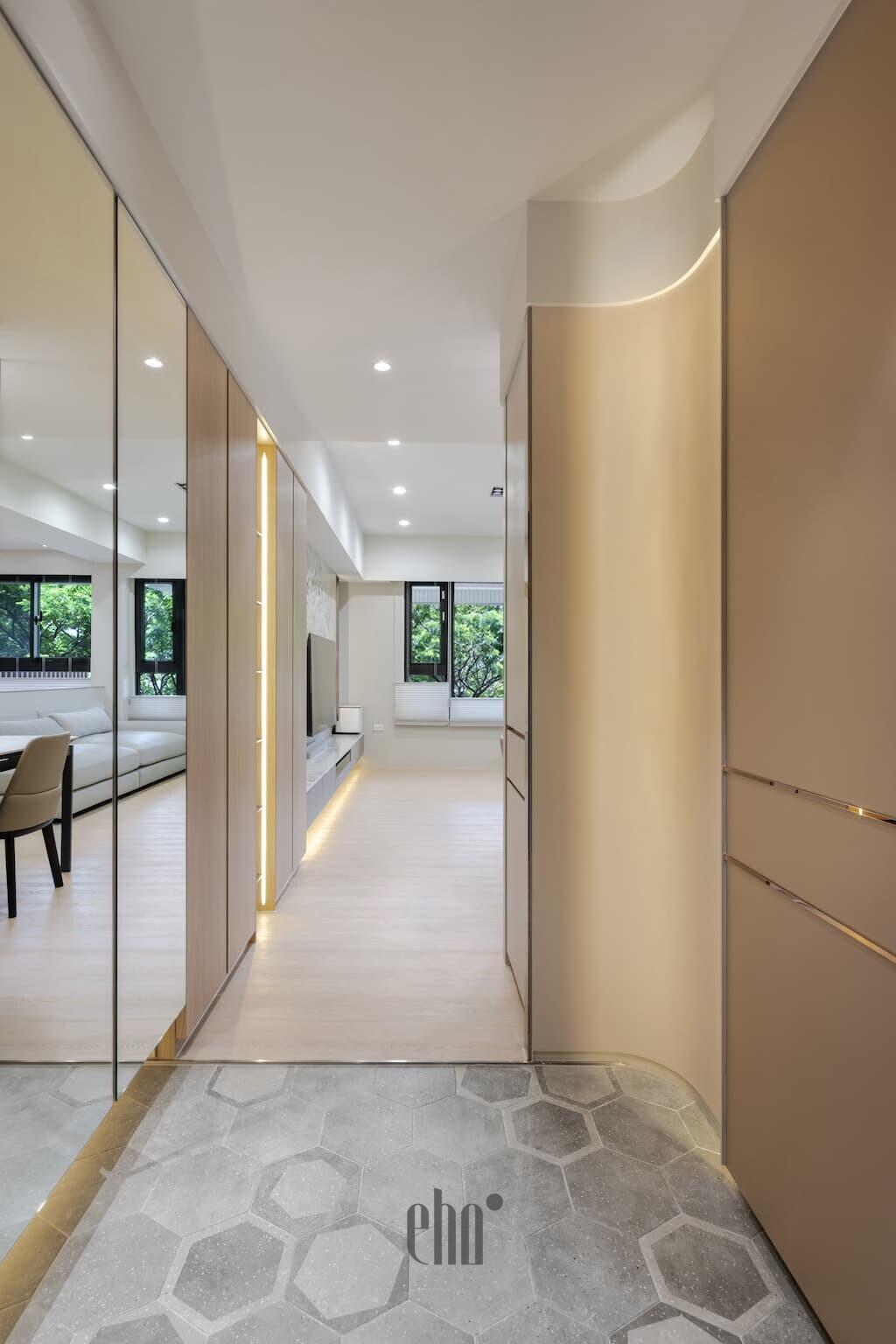 在 J MODERN 作品中,落塵區便是以六⾓磚做為主要地板材質,下降 1 公分恰到好處,在落塵區與室內空間的界線區以⾦屬條收邊,注重細節就可以讓空間更有質感。整體⽞關設計運⽤了鏡⾯、⾼櫃完整了⽞關區域,讓空間有延伸性不擁擠,也具備收納功能。