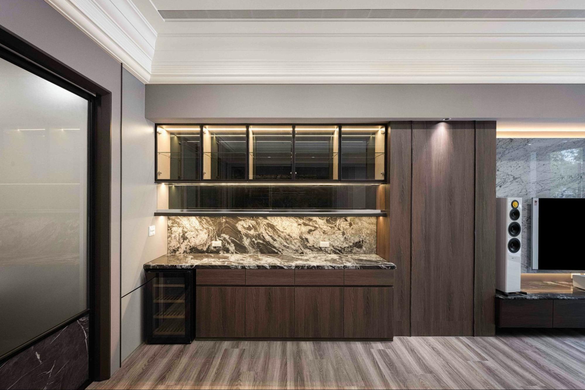像抽屜櫃和門片,這類使用率高,容易壞掉的部分,我們建議使用系統櫃材質。但在細節、邊角、壁面的部份,我們會建議使用木作來提升櫃體的質感。