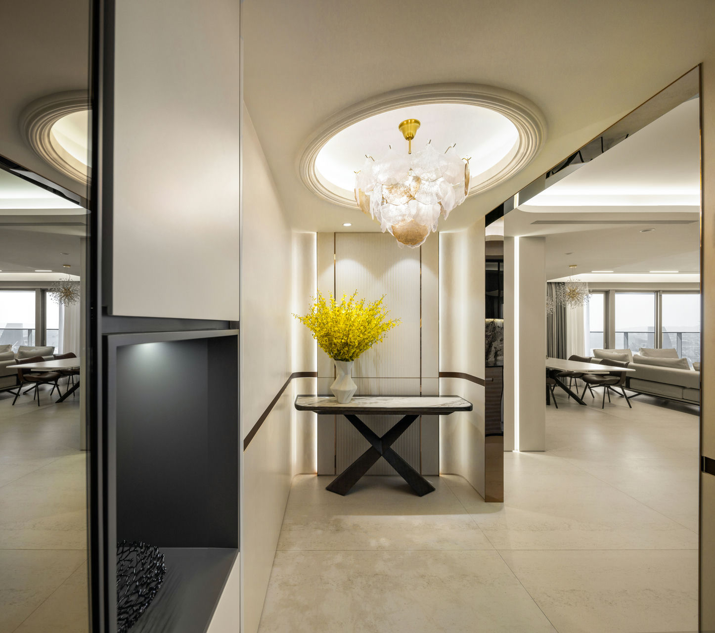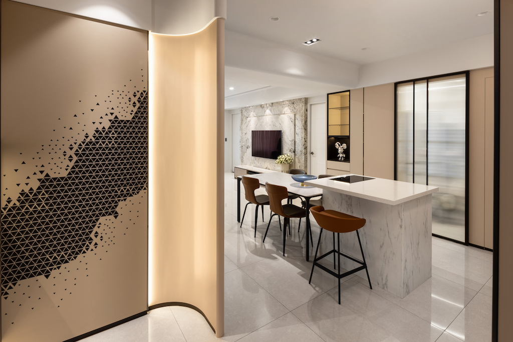 洞玻圓特 2025 在玄關與公區的區隔採用了淺色與弧型的概念,實心的落地隔屏可能略顯厚重,所以利用了長虹玻璃達到既通透又明亮的感覺,空間的開闊感仍然存在的。