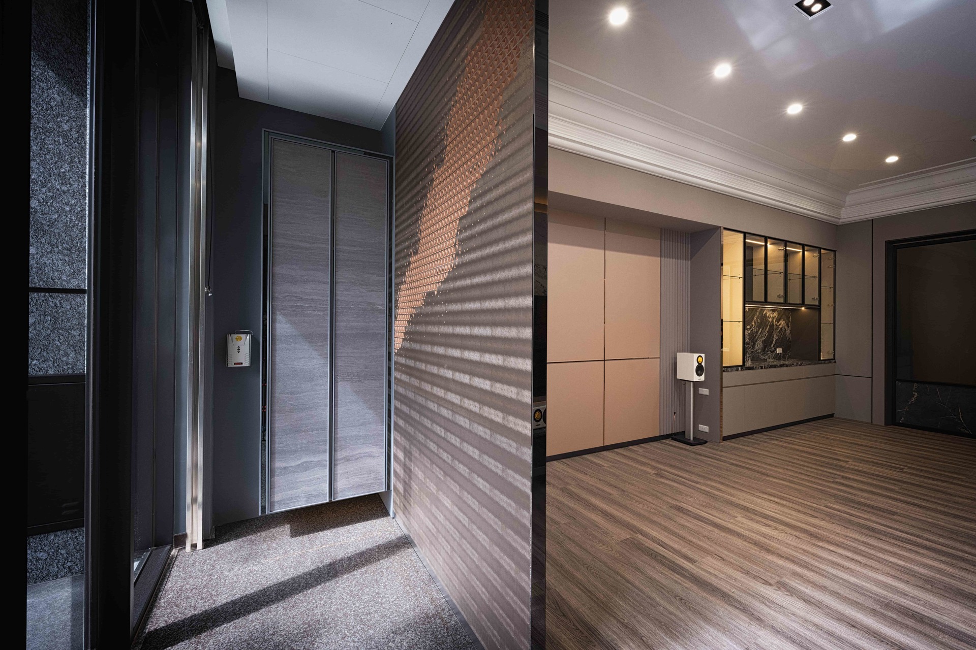 定潮作品在設計穿堂煞緩衝區時,不那麼單純的僅用隔屏,而是將牆面造型、燈光氛圍、端景區呈現一併考量。那不只是為了化解風水玄學而存在的設計,更是迎賓時的亮點區域。