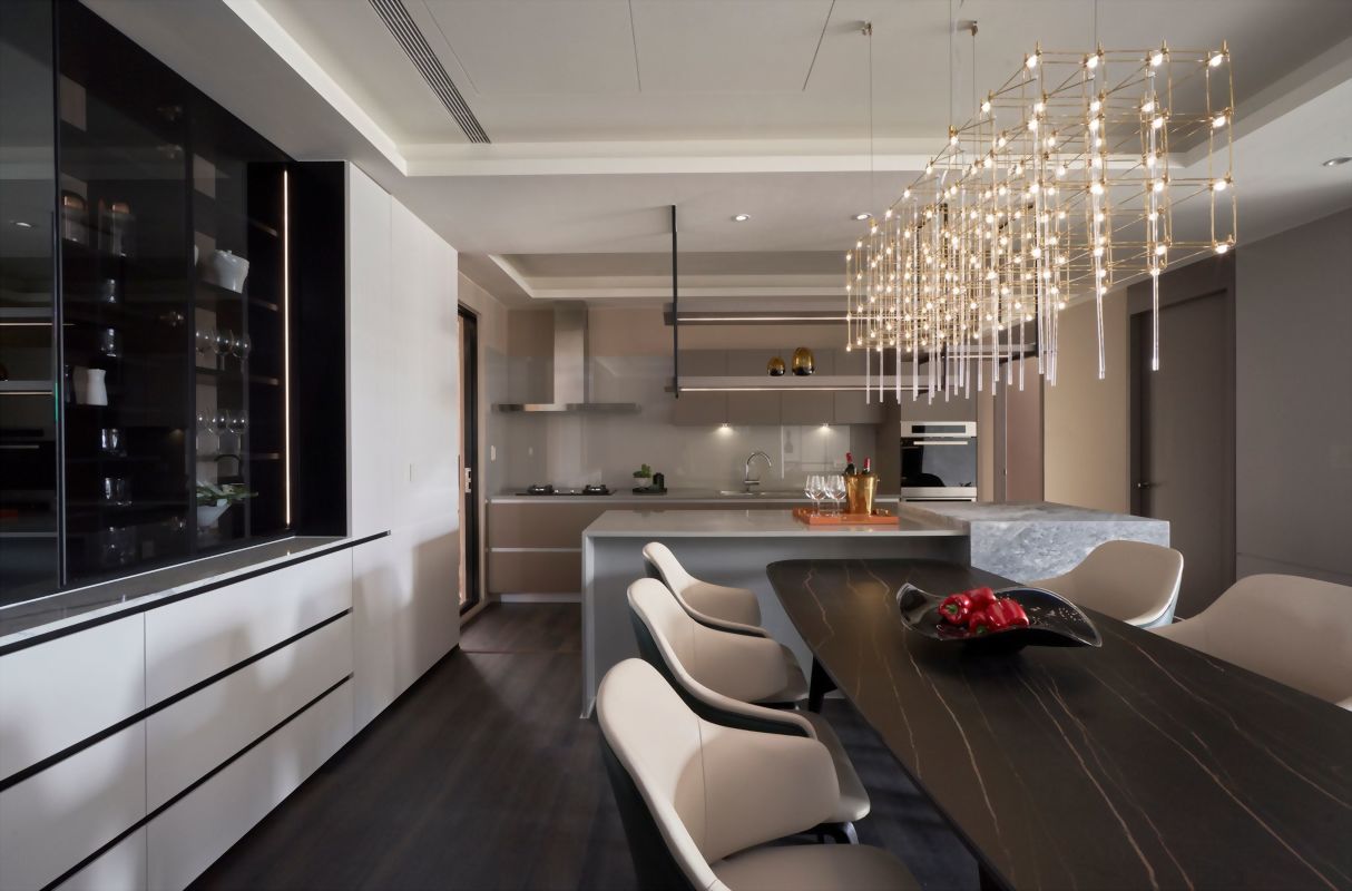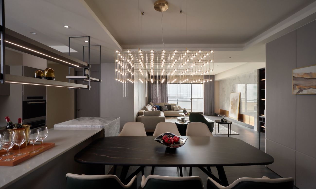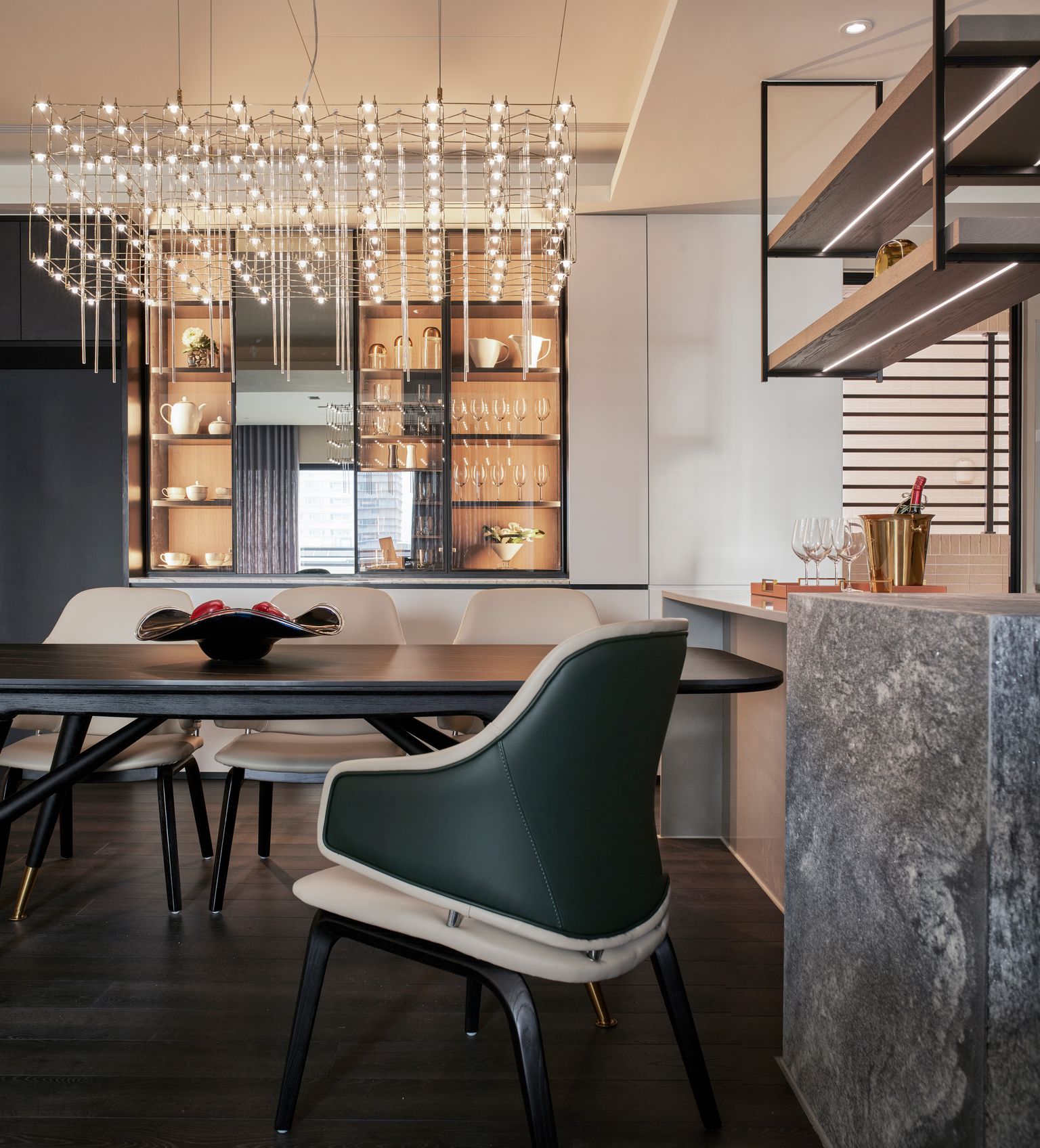 連接客廳的開放式餐廳空間設計,以上方設計感燈飾,巧妙營造室內空間不同氛圍。