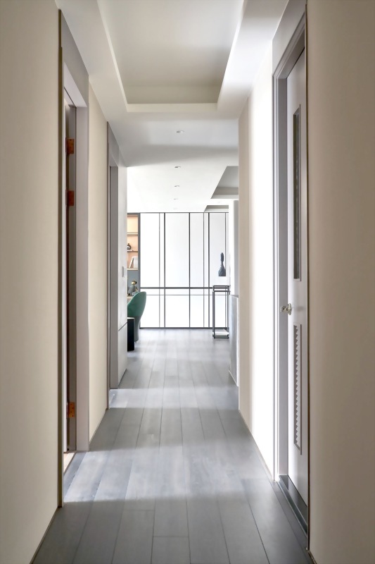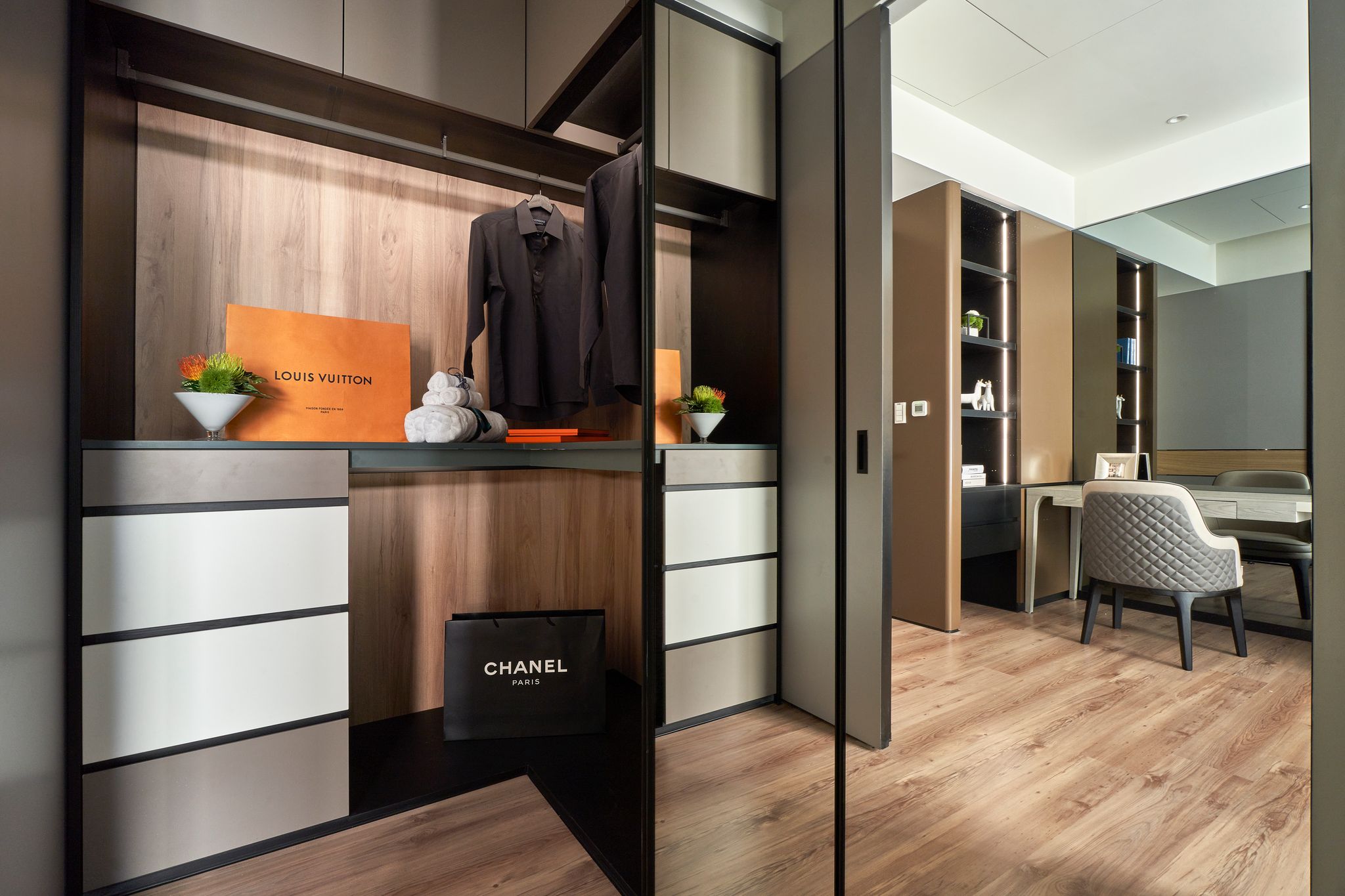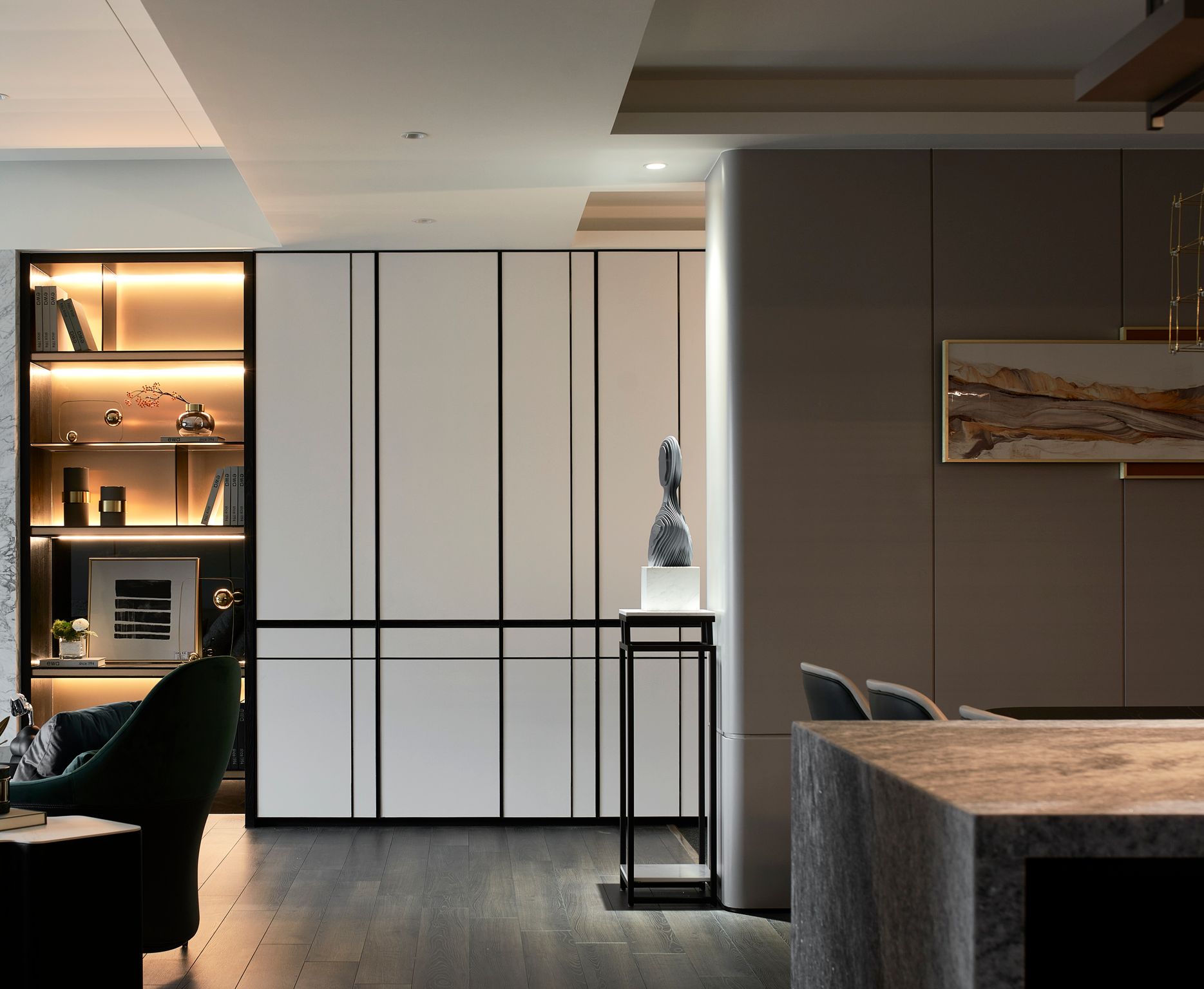 在整齊俐落的簡潔空間裡,透過設計巧妙將系統櫃隱藏於壁面,裝飾空間設計的同時,又兼具了機能收納的雙重價值,是小坪數空間不可或缺的關鍵。