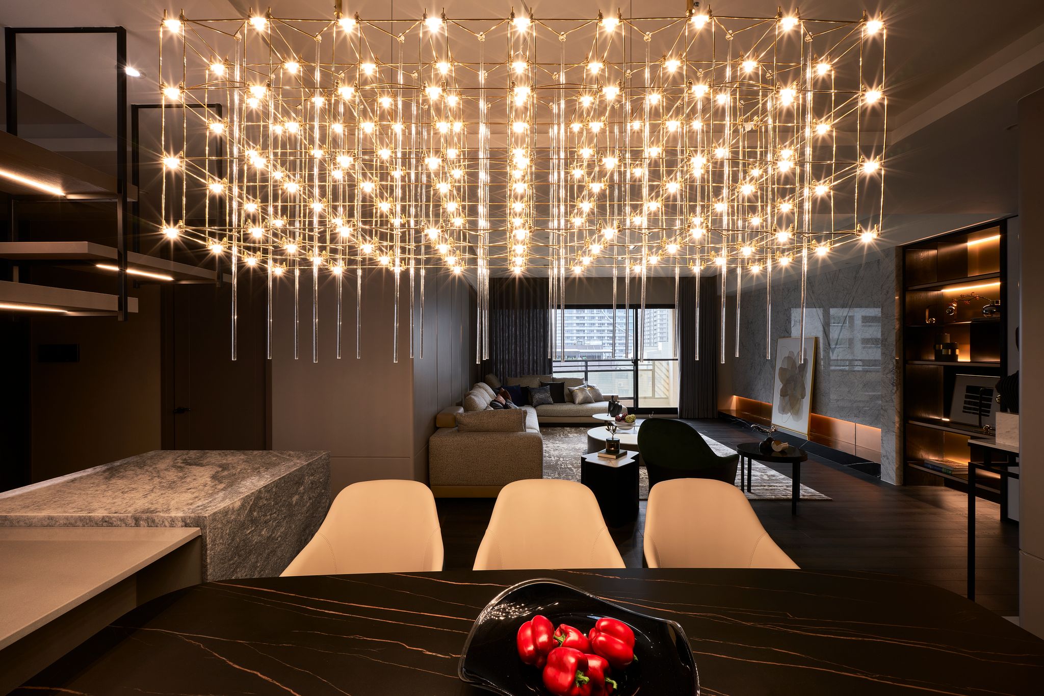 餐廳光線以凝聚感為主,客廳場域則以平均照亮的照明為主,燈光讓生活有層次。