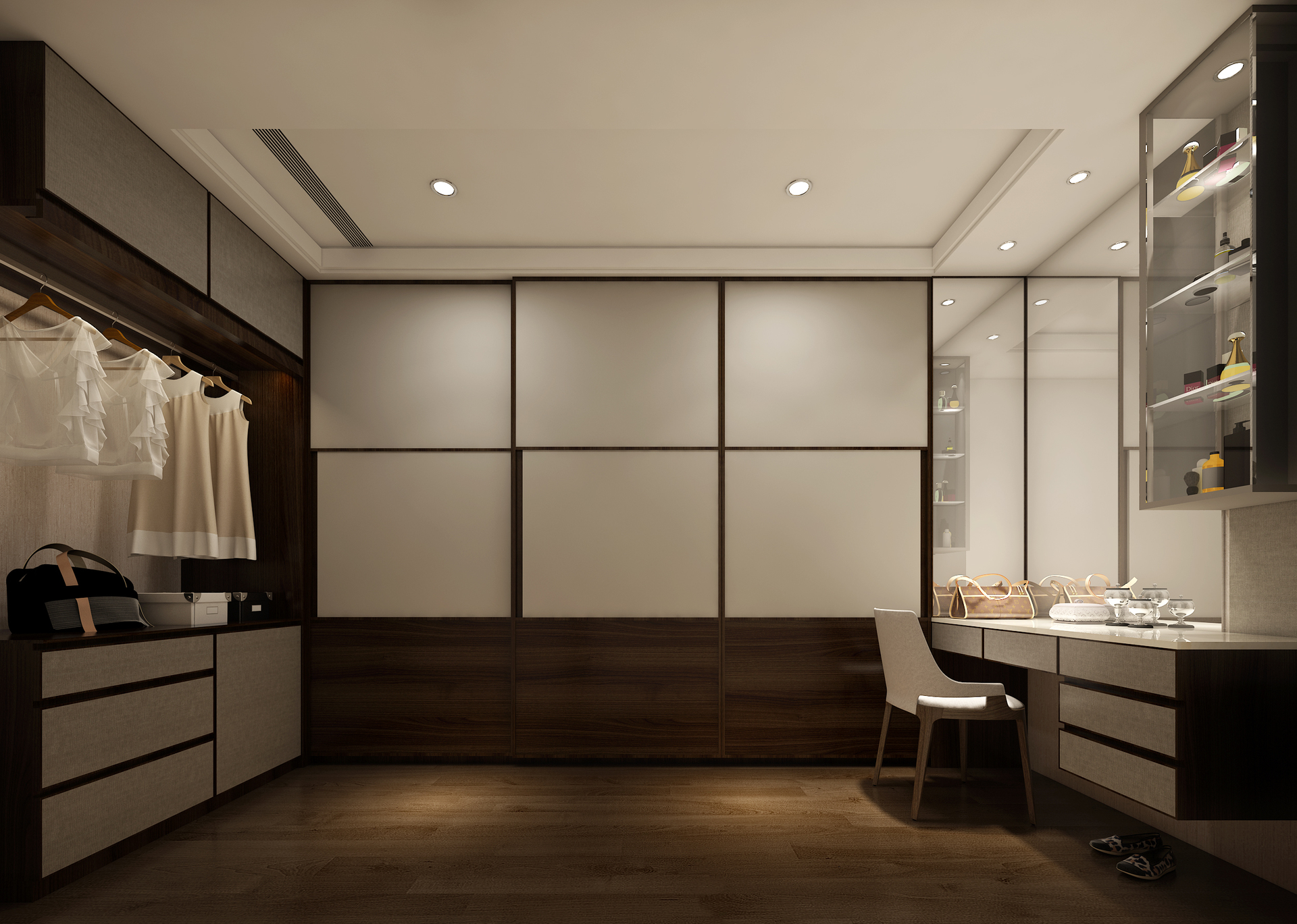 更衣室內同時也有化妝桌設計及大量的鏡面運用,讓屋主在出外時挑選衣物、化妝、打點自己,都可以一氣呵成,這裡就是屋主展示自我時尚的最佳空間。