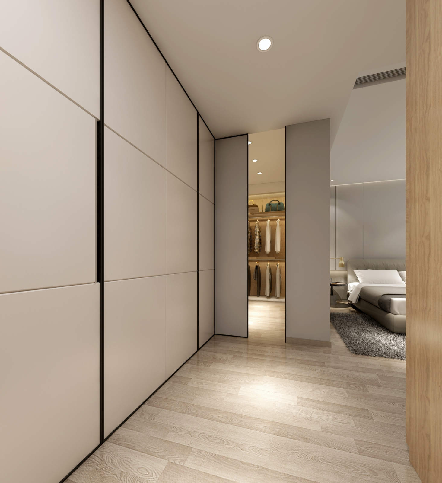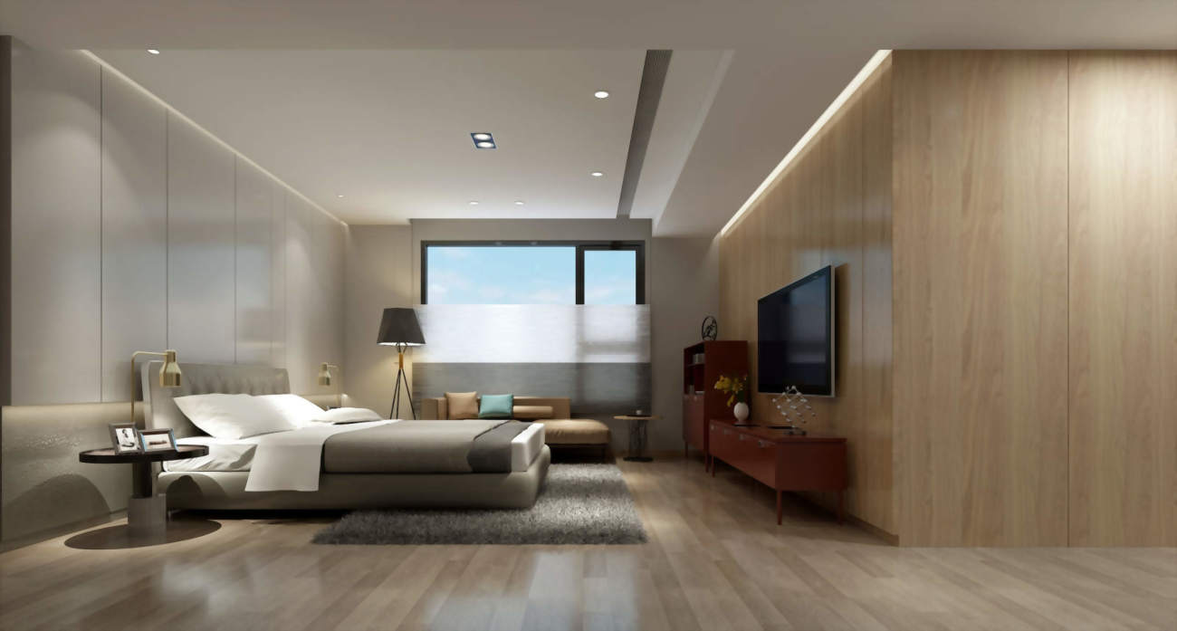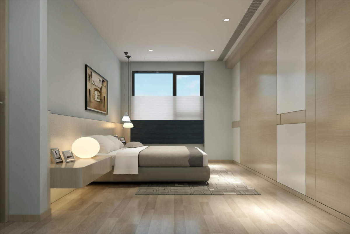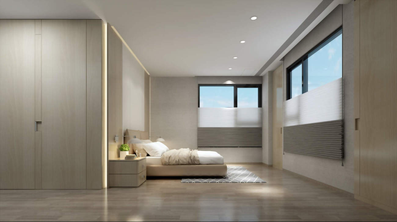將房間融入兩種風格,巧妙地做出現代感與日式清新相互融合又不衝突的裝潢風格,以簡約的設計營造最舒適的環境,天花板的設計,做出空間上隱形的場域,讓心裡感受上能讓臥房有一種隱形的場域區別。