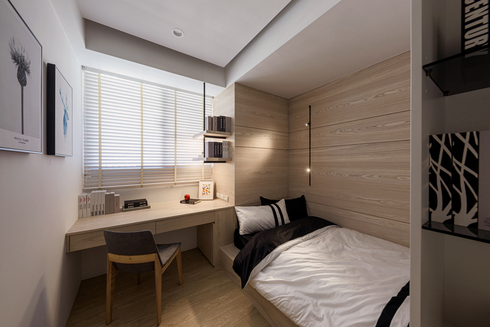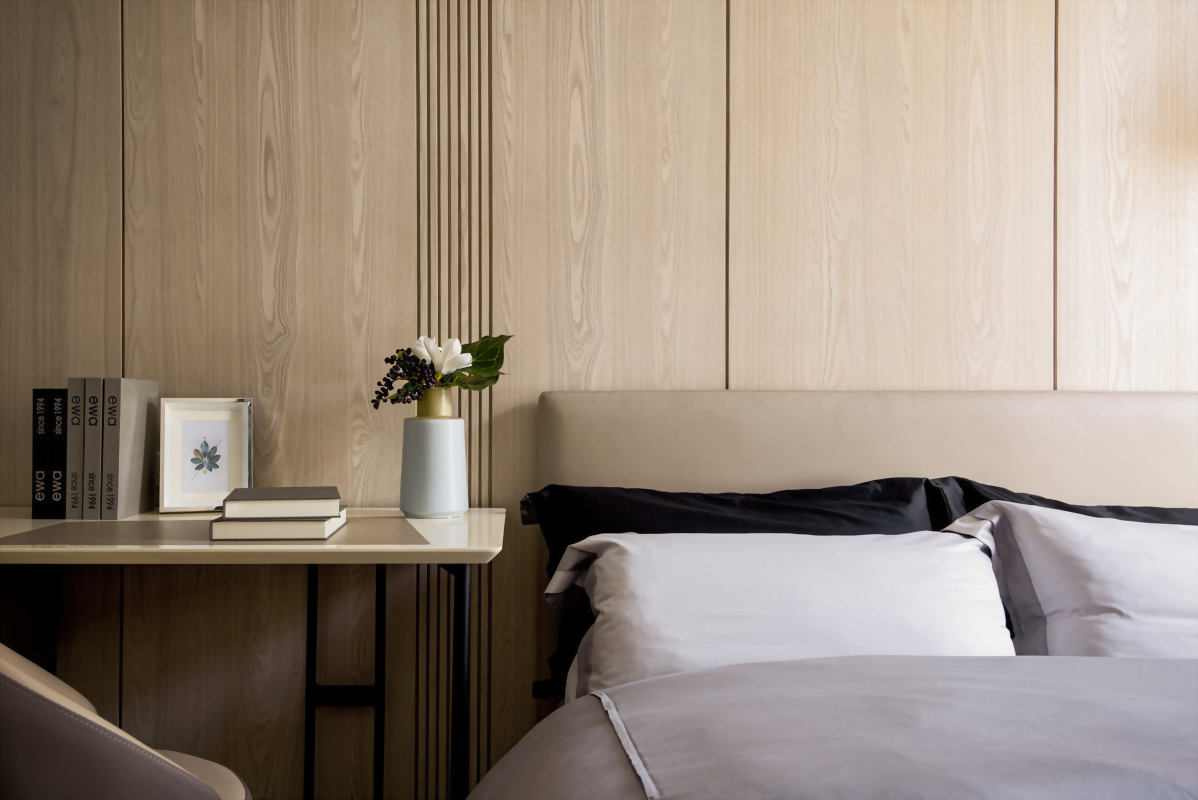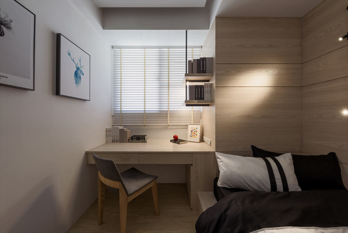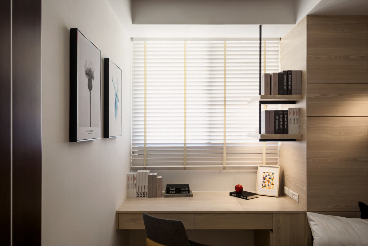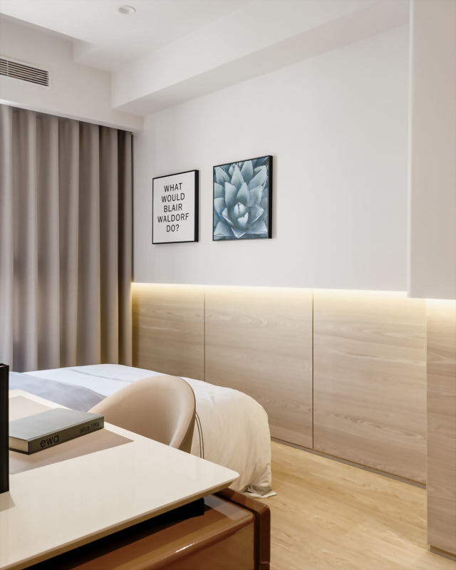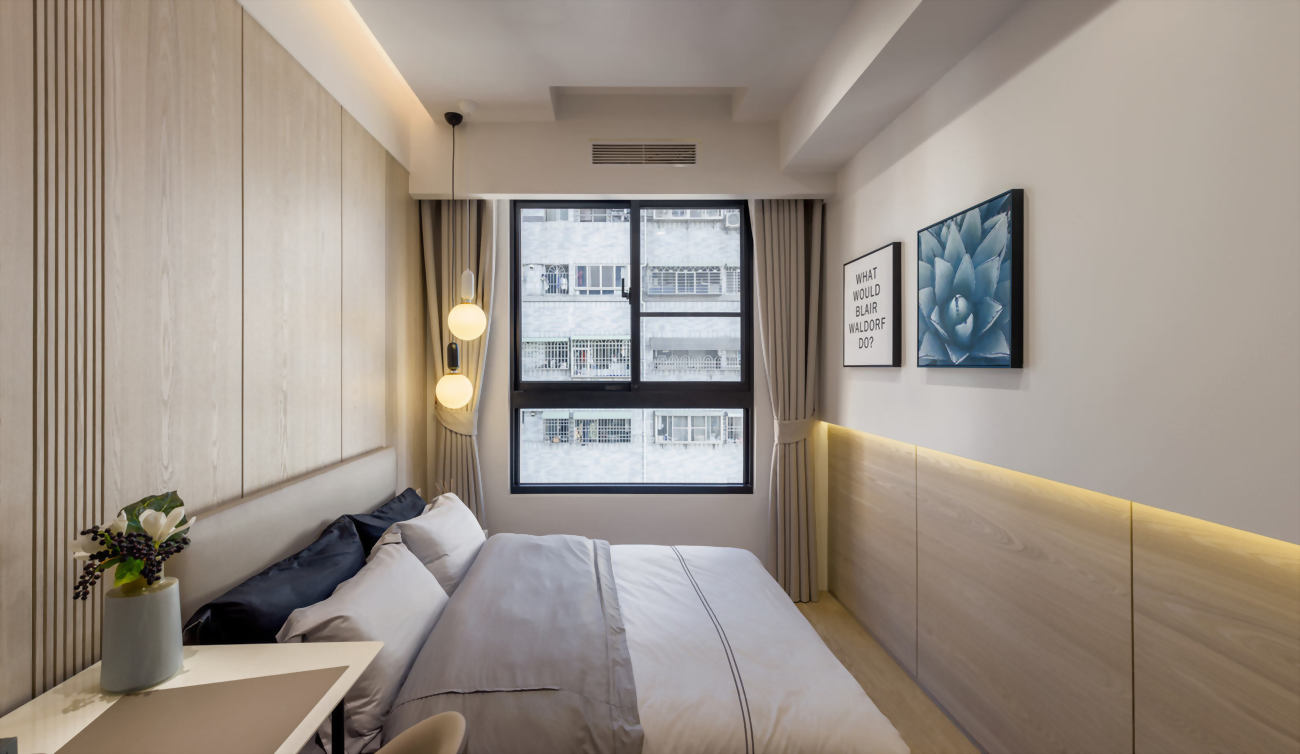 從配色到裝潢設計都散發著濃濃的日式清新感,無印風在近期的裝潢風格中廣受年輕族群及小家庭的喜愛,沒有過於沉重的配色,簡約的室內設計配上一種令人泰若自然的住家空間設計,透過紋理材質及木柵表現出與大自然融合同時具有現代感的室內設計,讓業主回到家,一走進臥室即能有自在且喘息的空間。