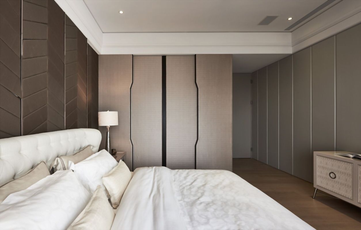 主臥設計以細膩的室內設計及裝潢風格選材,打造融合古典質感美及現代都會交織的室內空間設計。