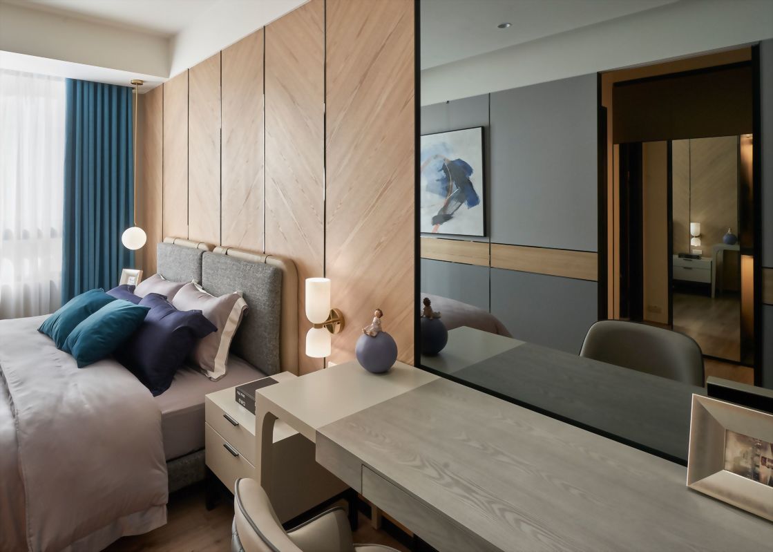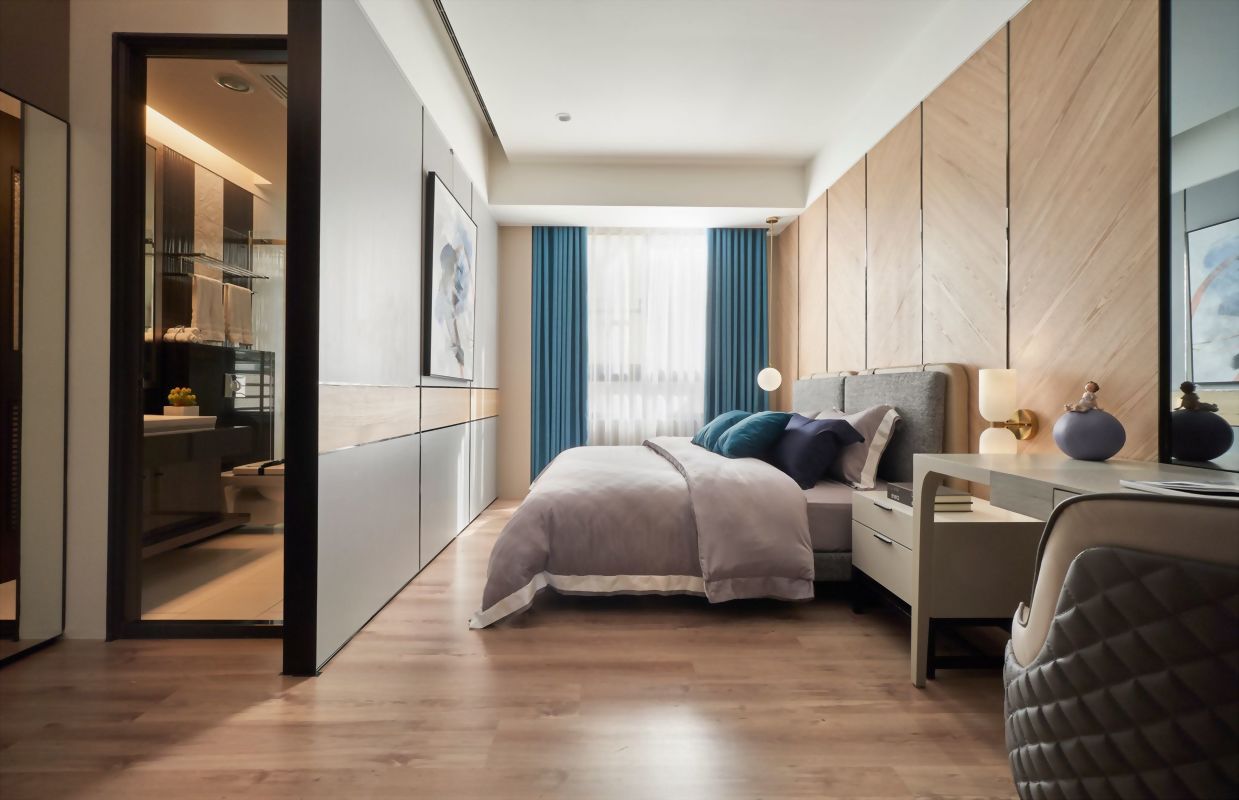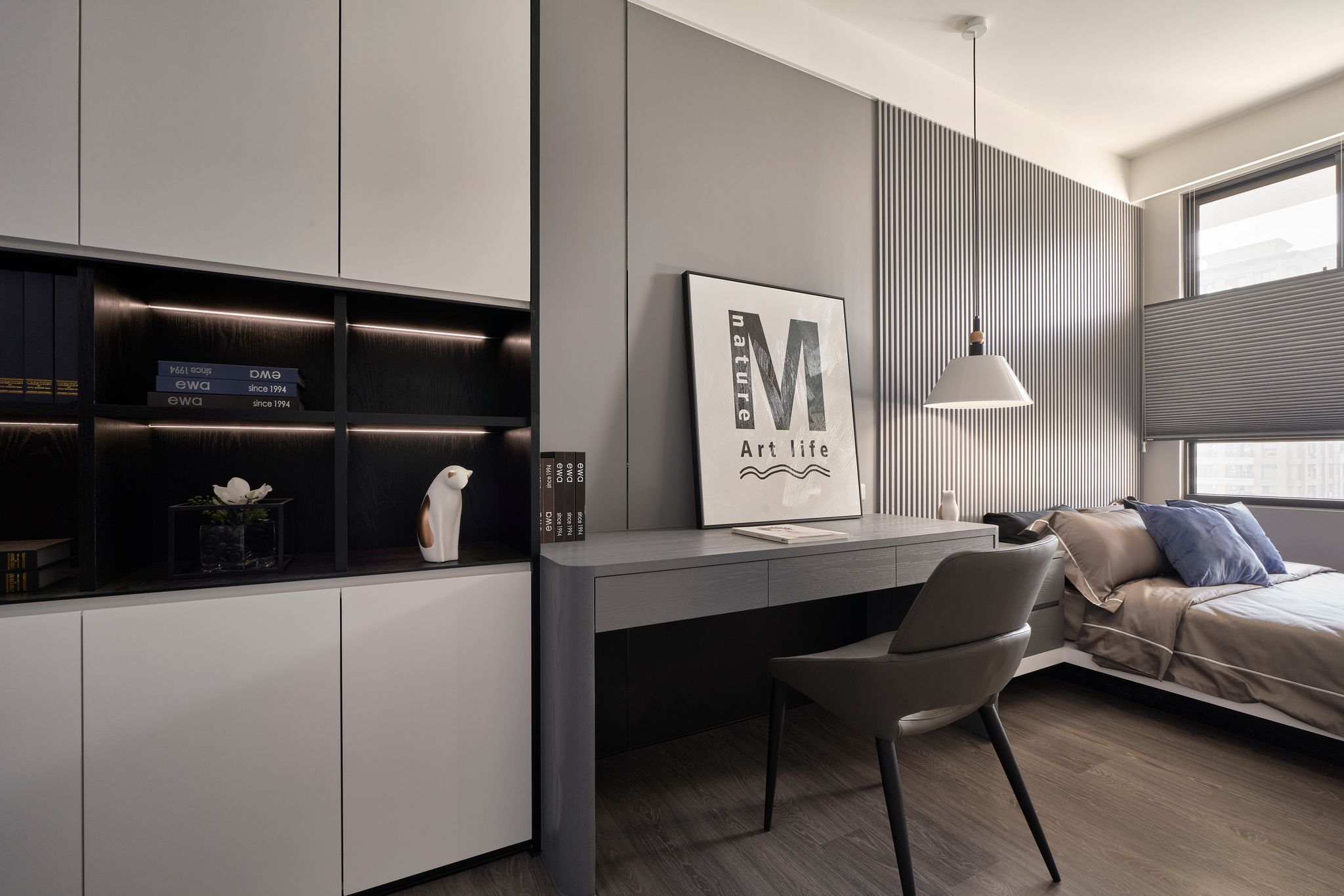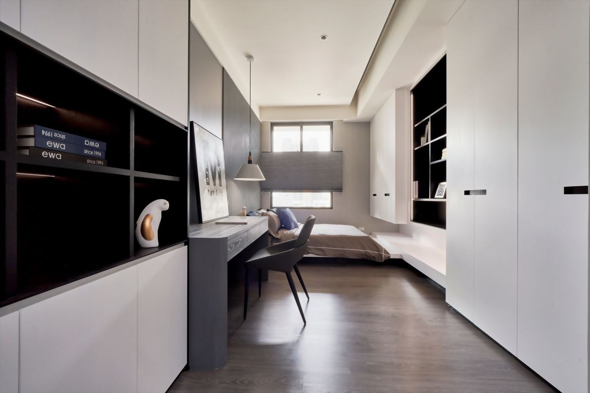 在整齊俐落的簡潔空間裡,透過設計巧妙將系統櫃隱藏於壁面,裝飾空間設計的同時,又兼具了機能收納的雙重價值,是小坪數空間不可或缺的關鍵。