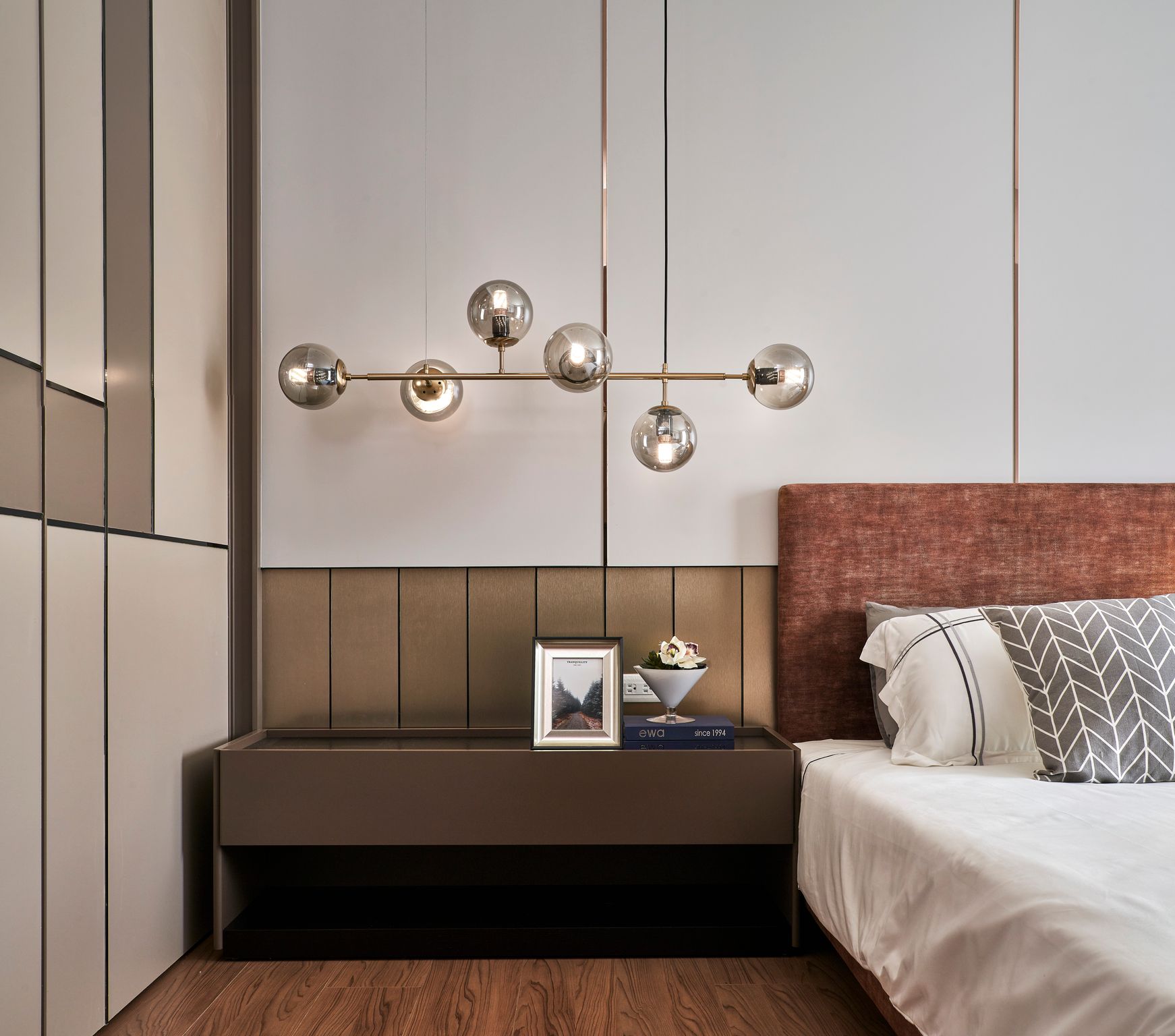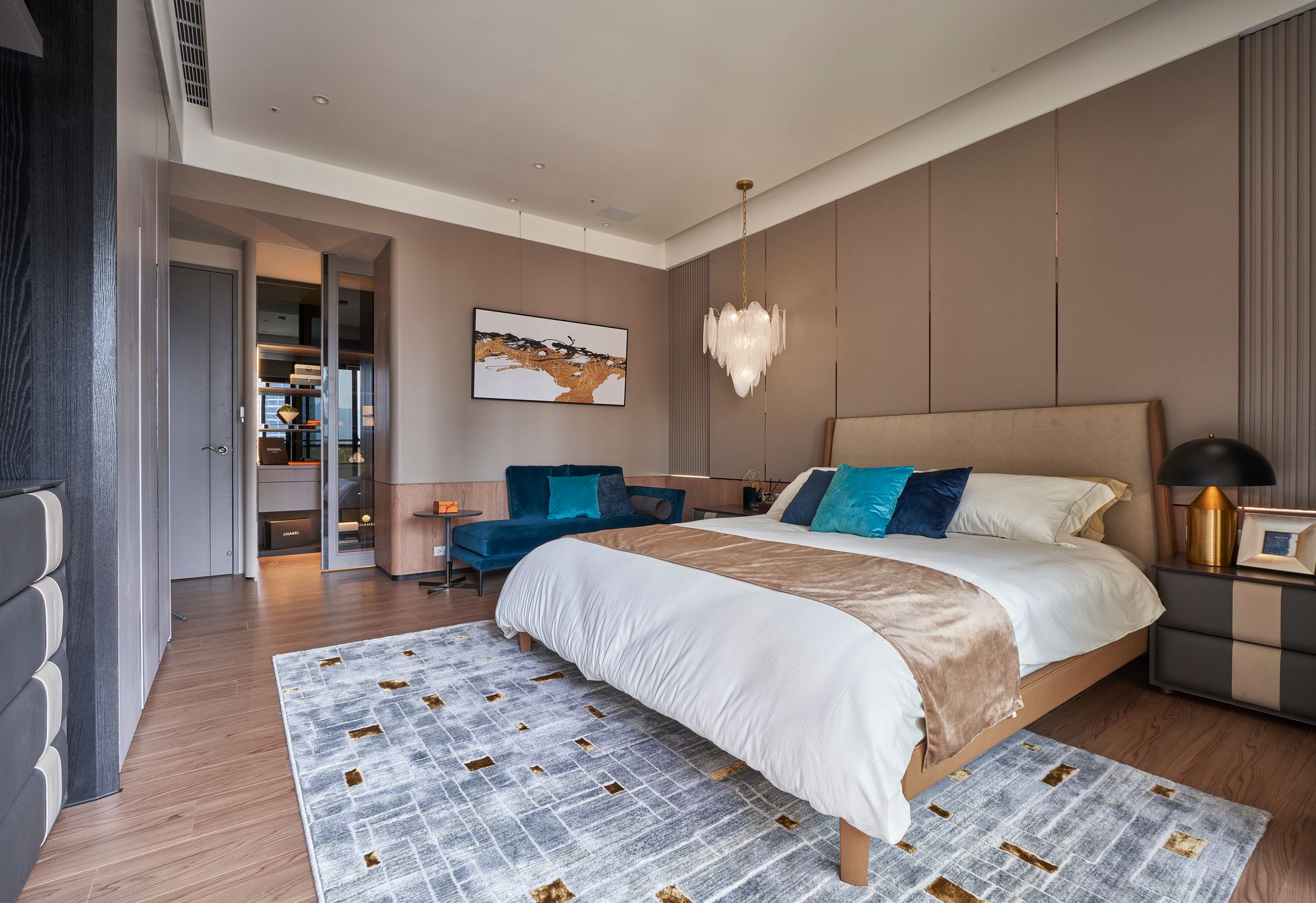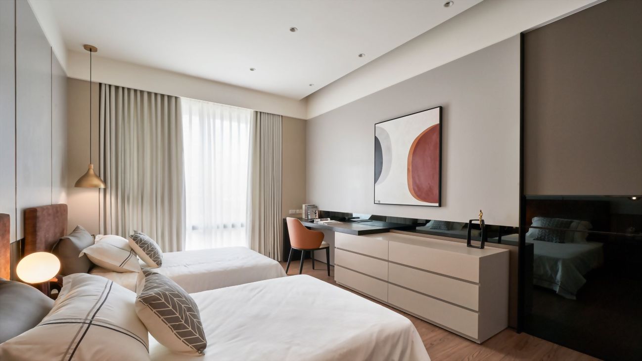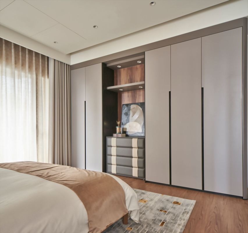 在整齊俐落的簡潔空間裡,透過設計巧妙將系統櫃隱藏於壁面,裝飾空間設計的同時,又兼具了機能收納的雙重價值,是小坪數空間不可或缺的關鍵。
