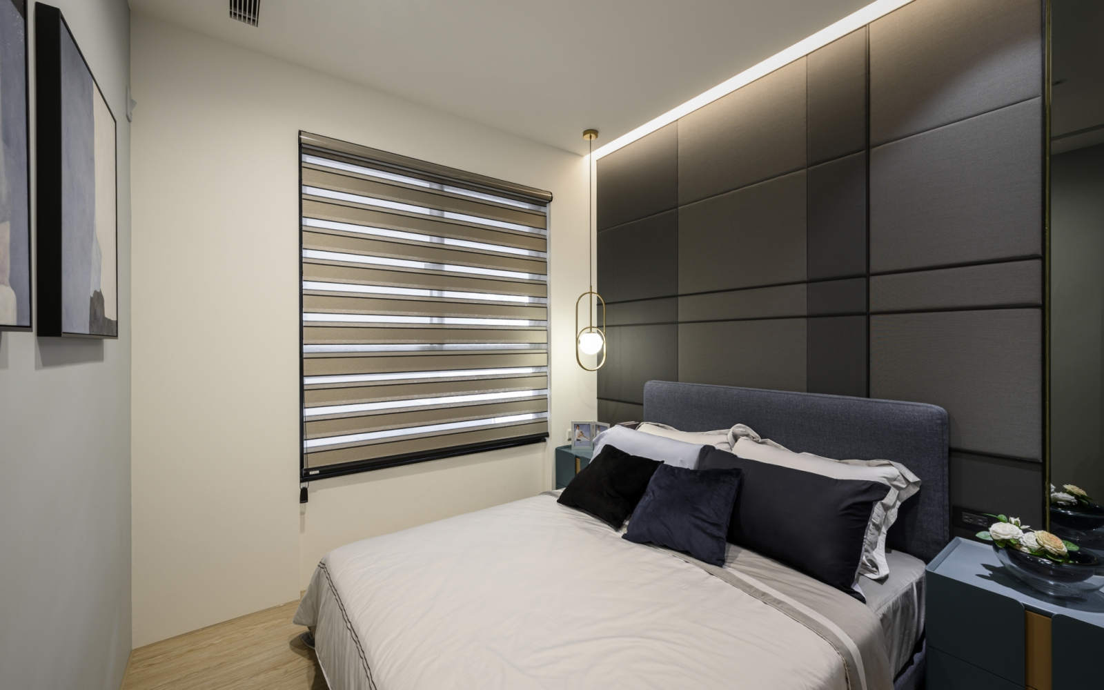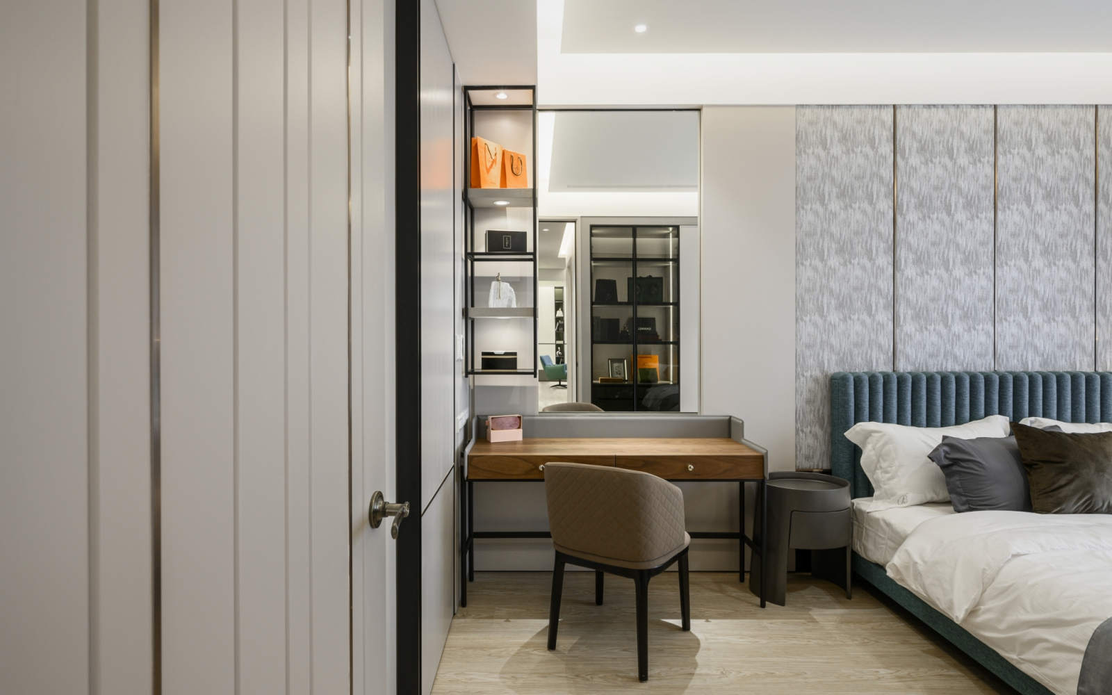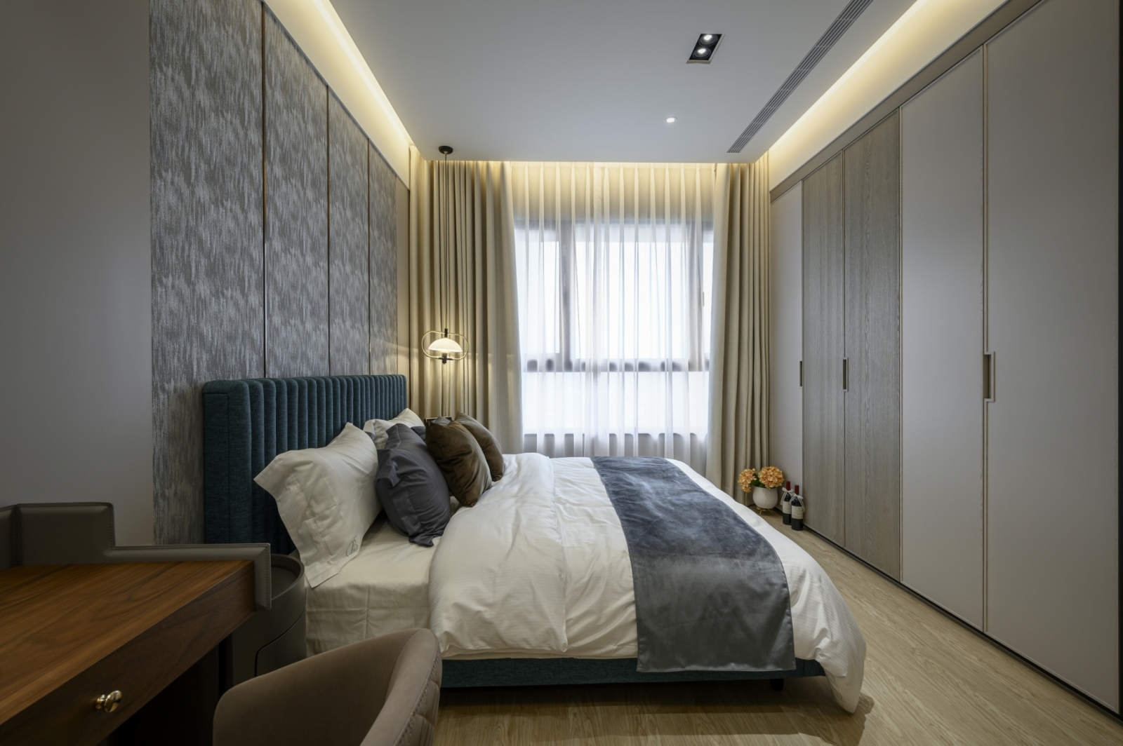 主臥空間設計上,採取寬敞及高收納機能的系統櫃設計,不但視覺上不會感到擁擠也讓活動空間能更加寬敞,並且以穩重成熟的裝潢風格設計,達到業主所想要的主臥室設計。