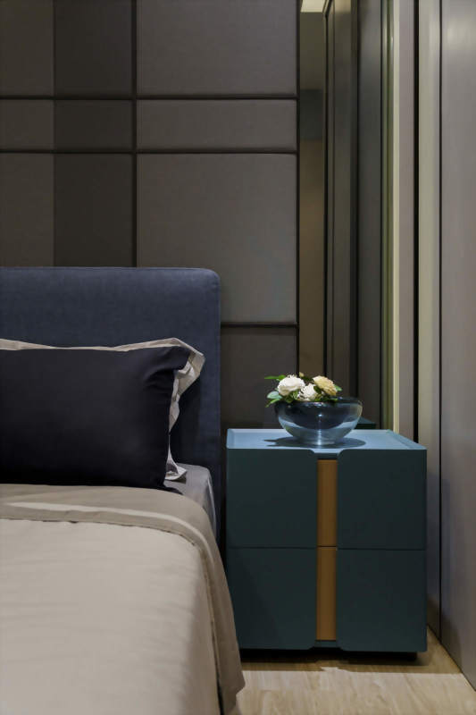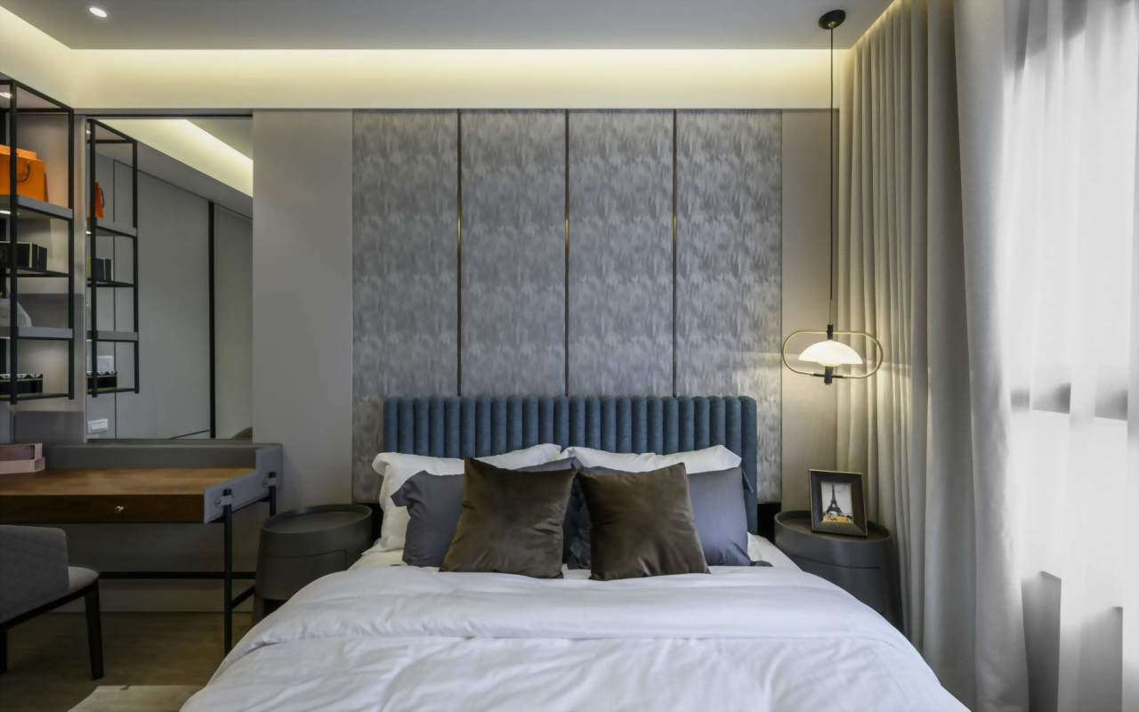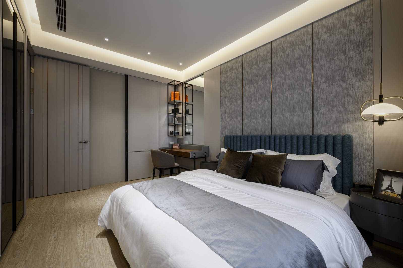 主臥空間設計上,採取寬敞及高收納機能的系統櫃設計,不但視覺上不會感到擁擠也讓活動空間能更加寬敞,並且以穩重成熟的裝潢風格設計,達到業主所想要的主臥室設計。