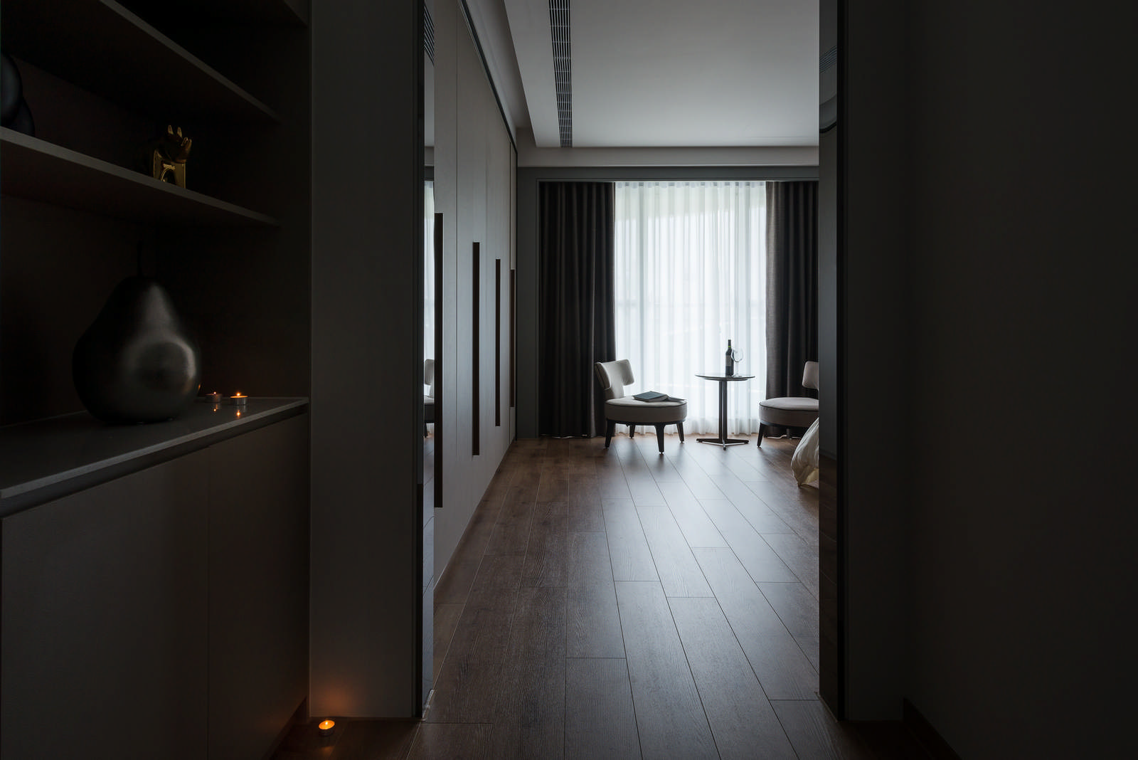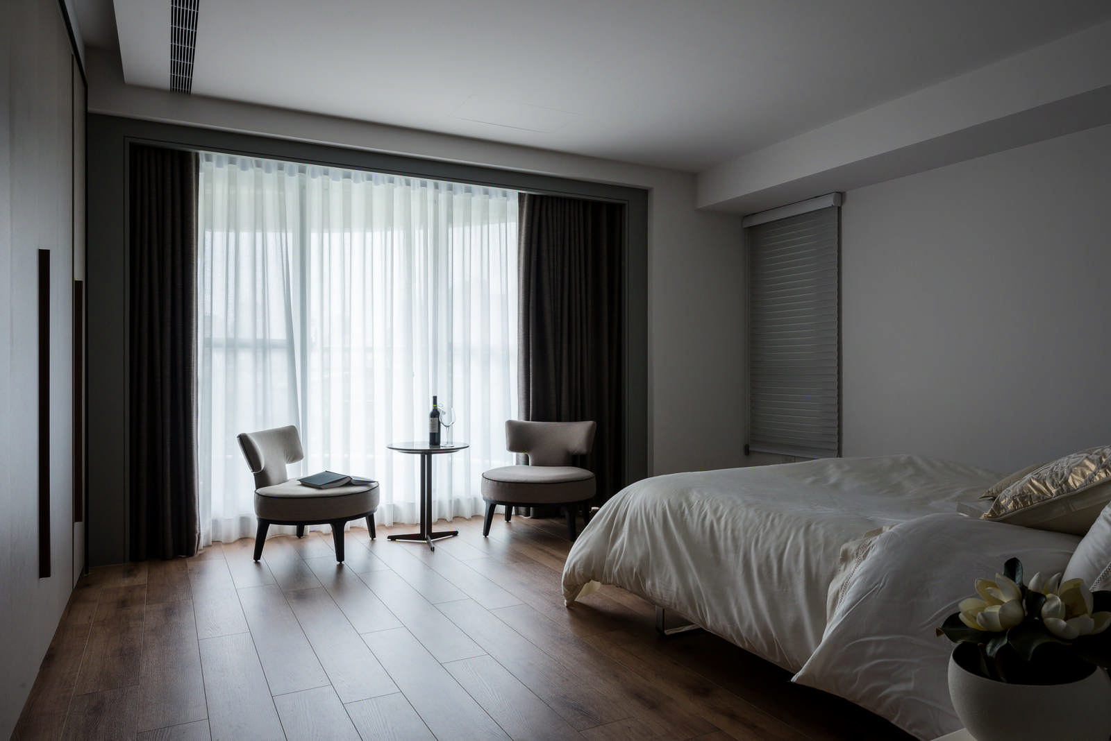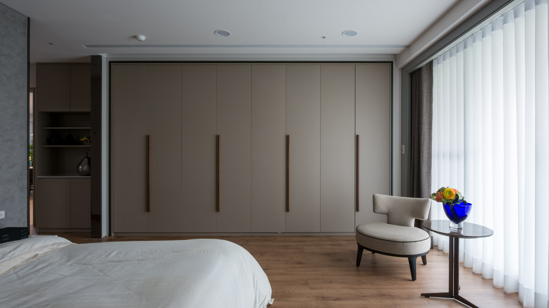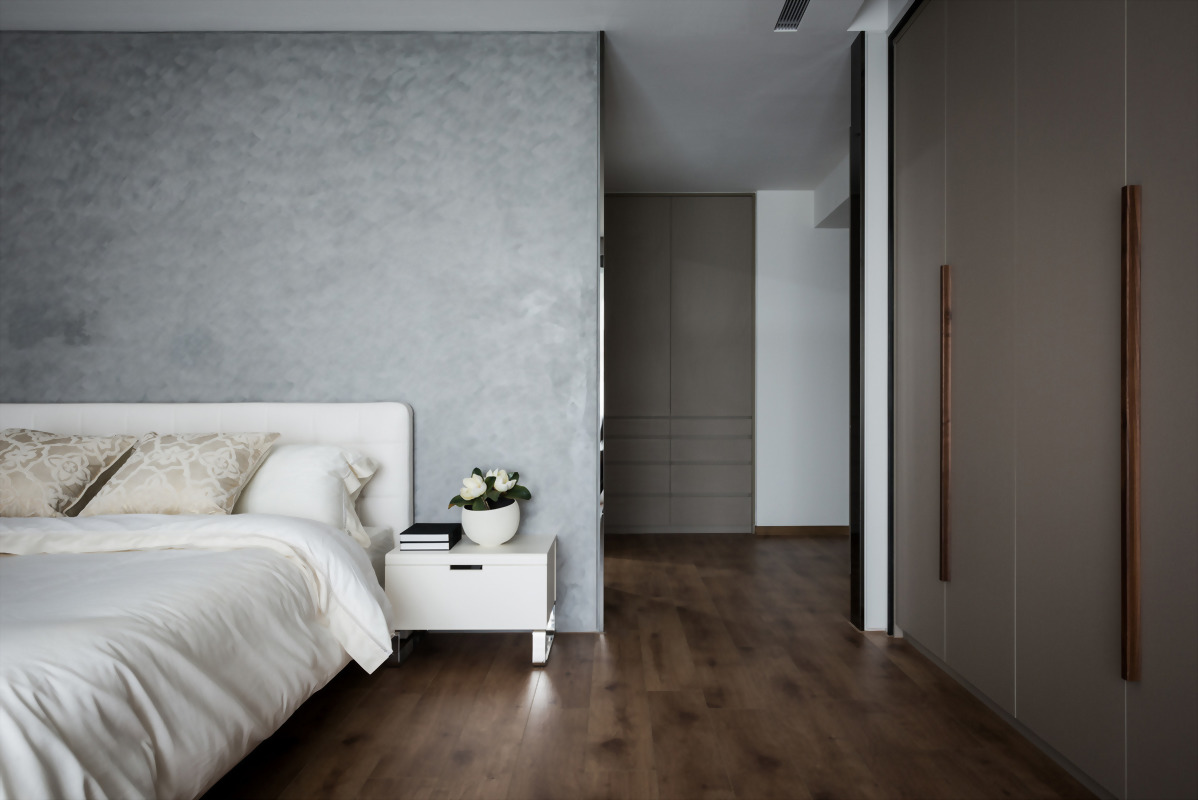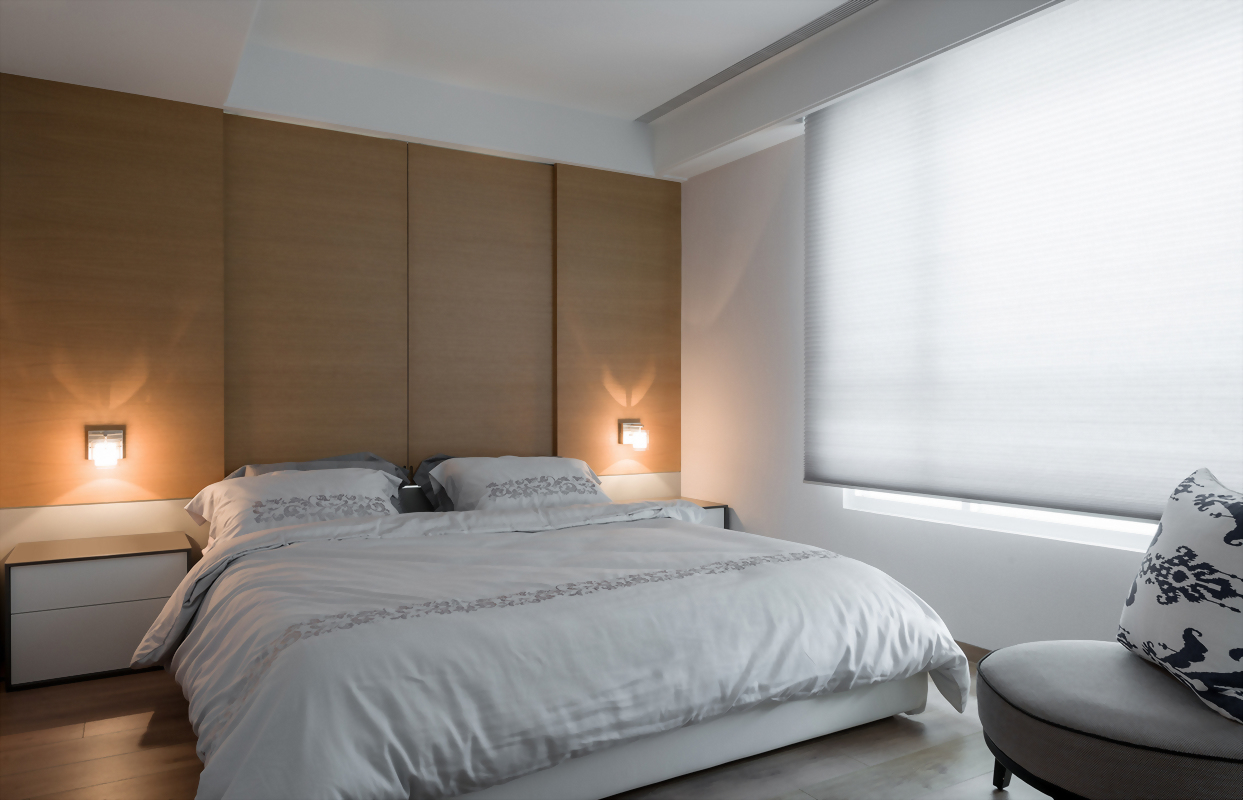 以大地色系為裝潢設計主要基調,搭配以特殊漆料呈現的臥室主牆,給人靜謐低調、寧靜浪漫優雅的深邃之感,低調優雅的裝潢風格室內設計重新定義對奢華生活的理解,處處透露出生活的溫馨。搭配一室的柔和光線,為臥室的室內裝潢氛圍完美加分。