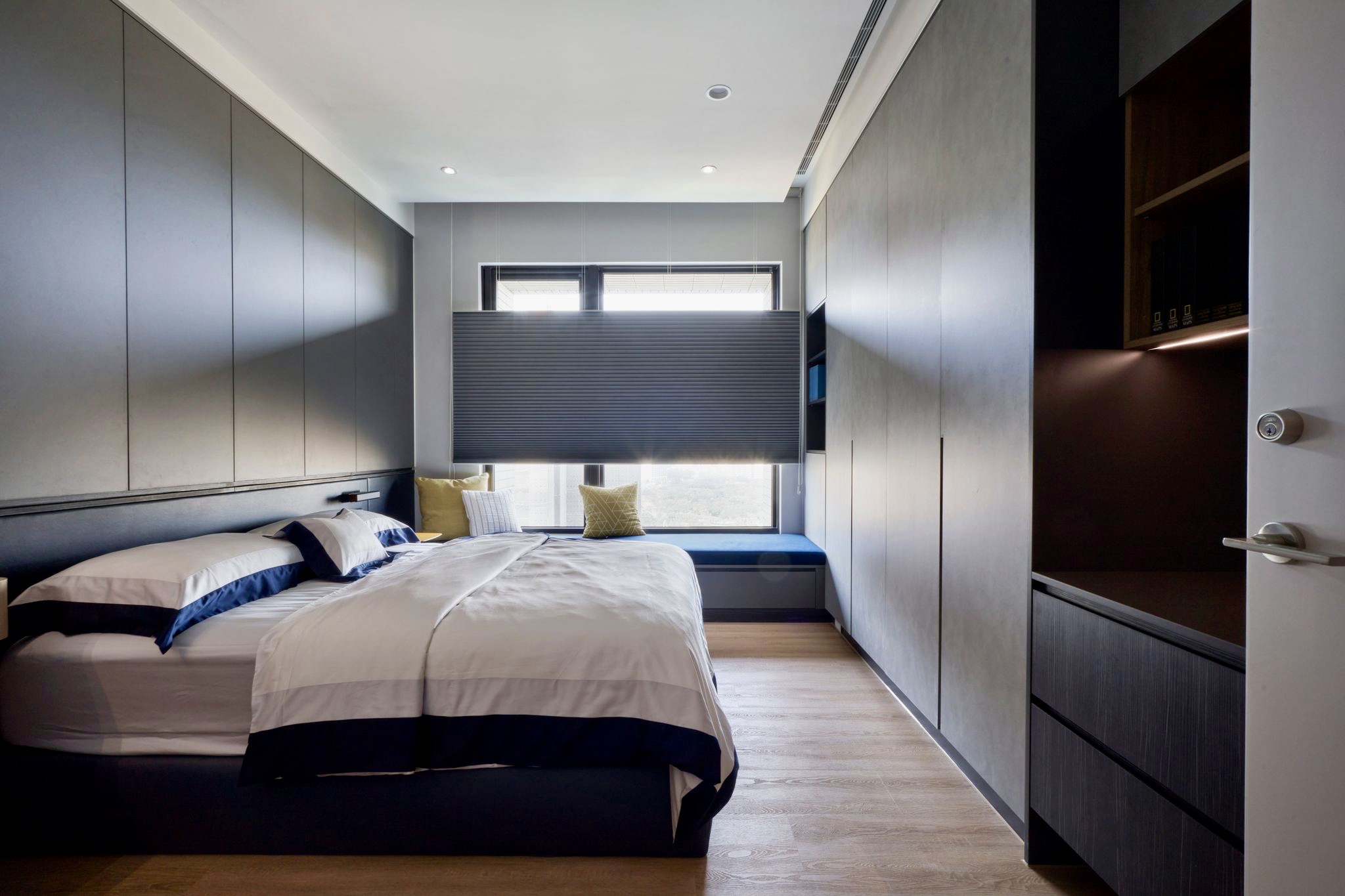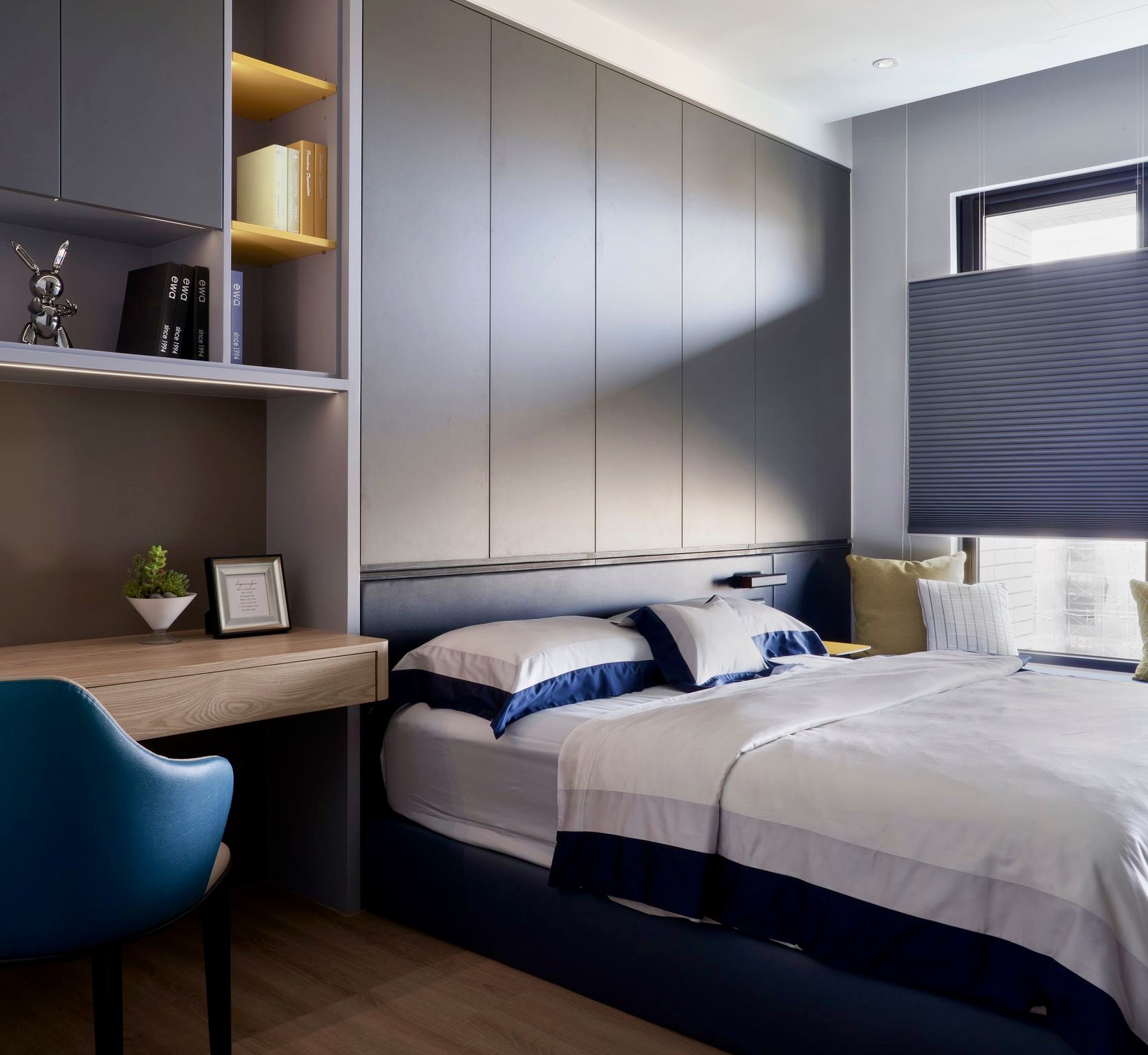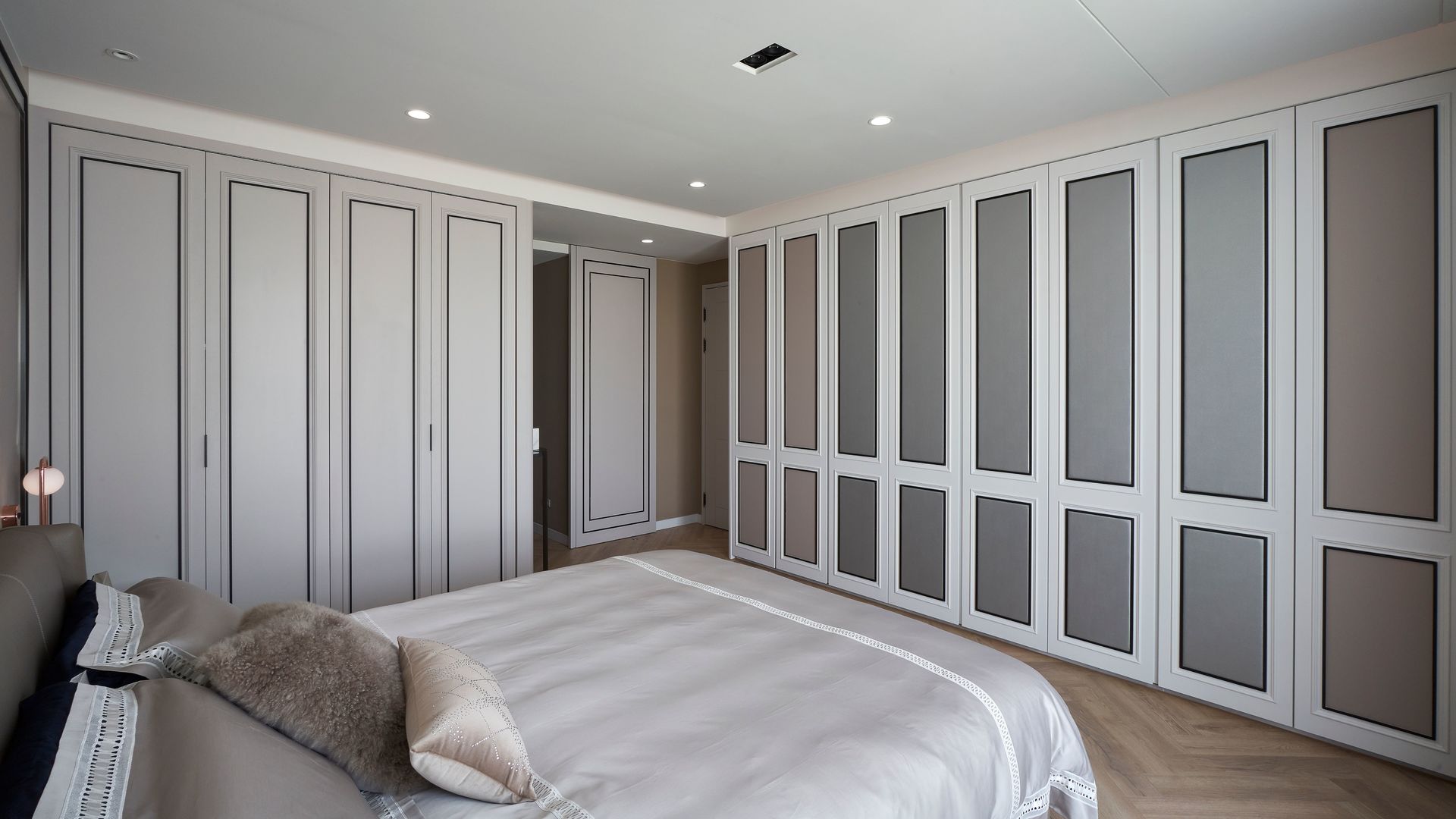 規律的直條式裝潢設計替臥室空間增加了「數大便是美」的美感呈現,同時賦予空間設計滿滿的收納機能性,在裝潢上利用顏色,跳脫傳統室內設計對於古典裝潢風格一成不變的制式型態,在整體室內空間設計做出微微的改變。