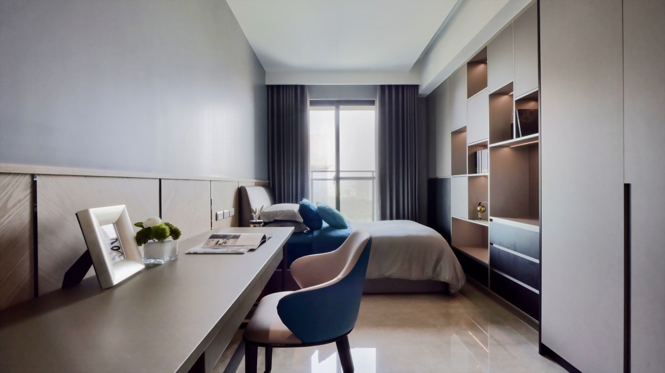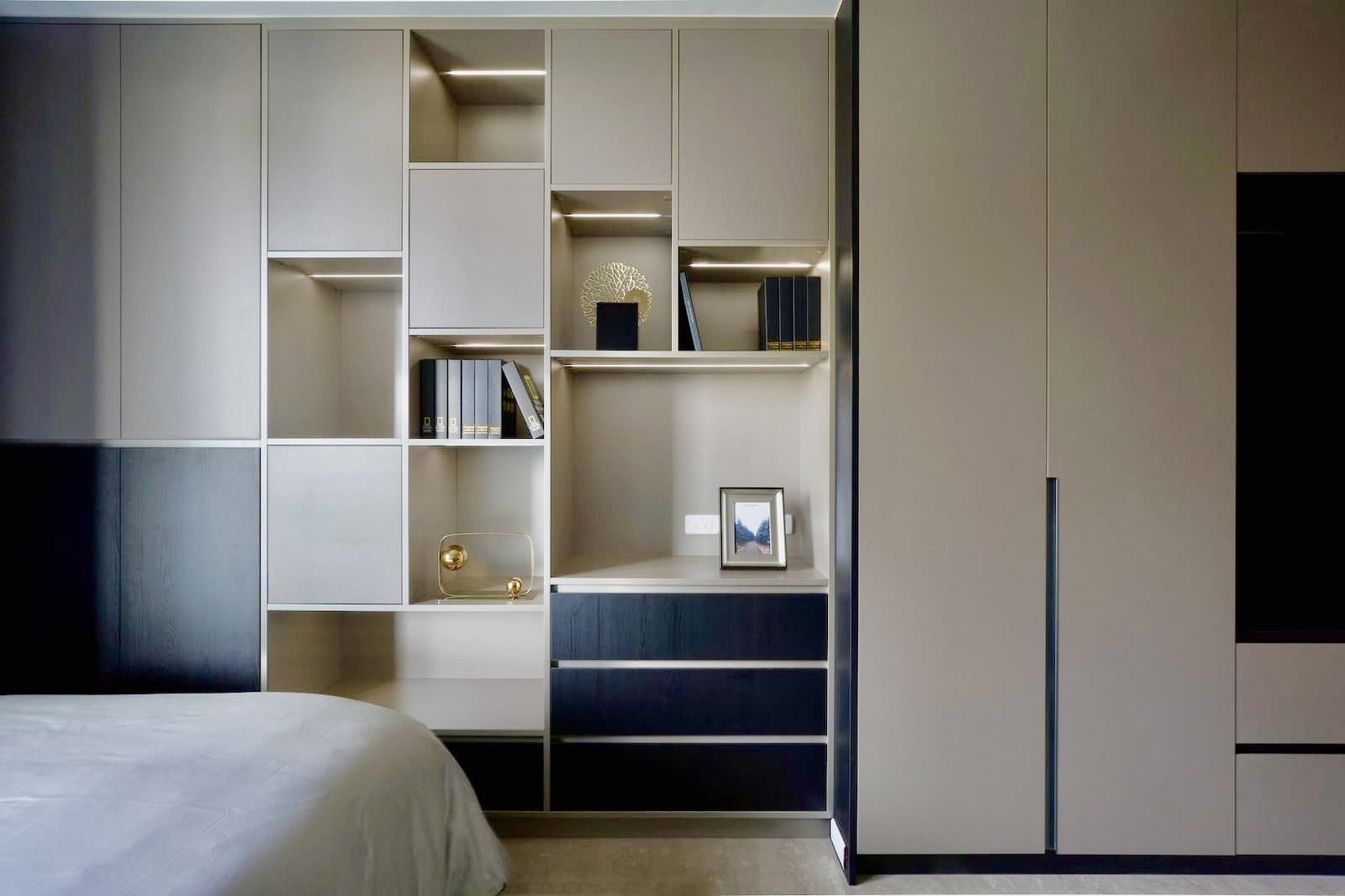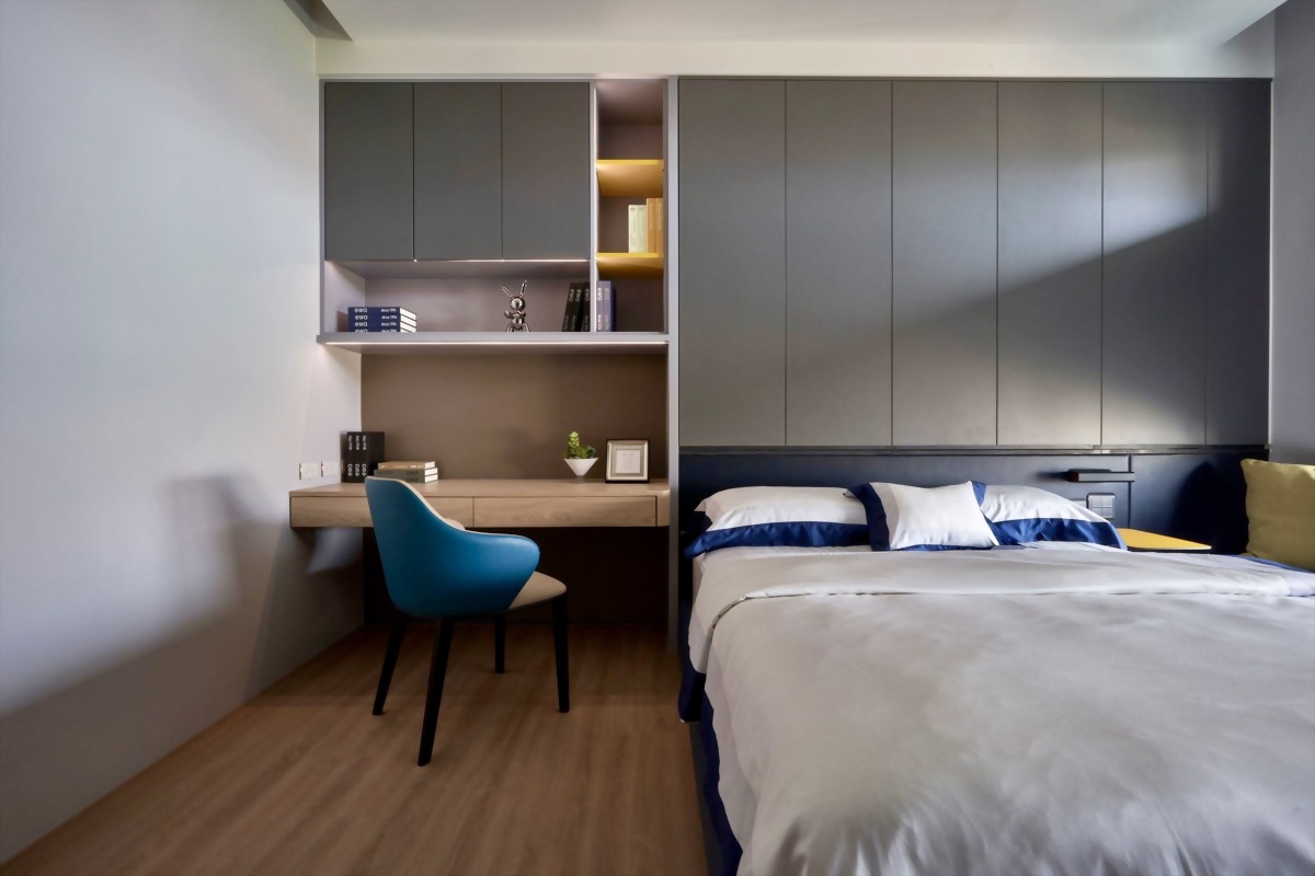 規律的直條式裝潢設計替臥室空間增加了「數大便是美」的美感呈現,同時賦予空間設計滿滿的收納機能性,在裝潢上利用顏色,跳脫傳統室內設計對於古典裝潢風格一成不變的制式型態,在整體室內空間設計做出微微的改變。