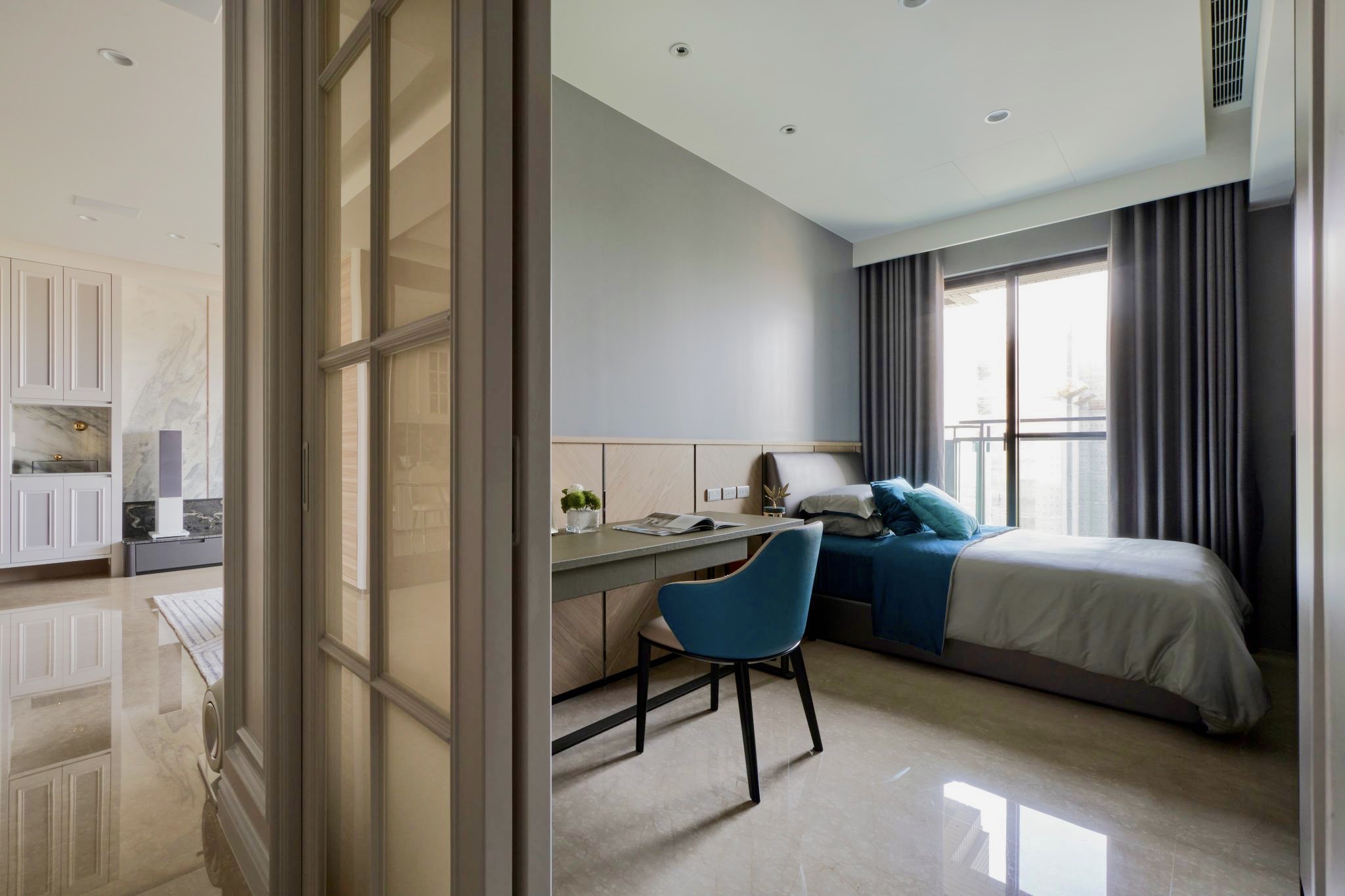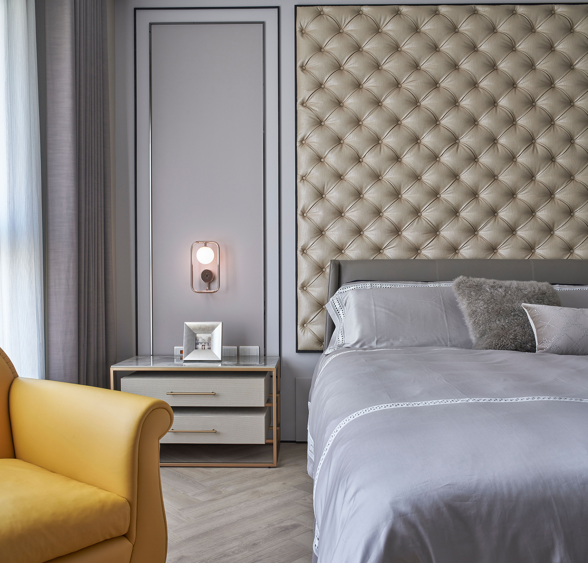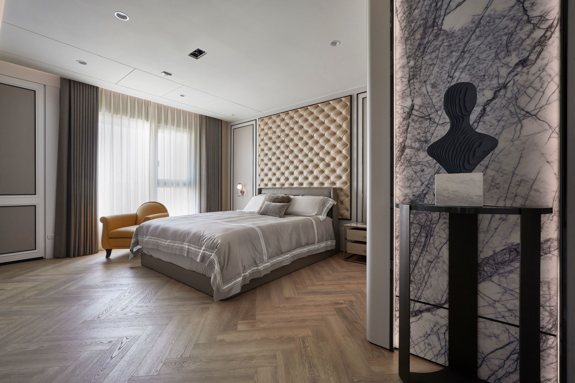 古典素雅的裝潢設計襯托出主臥室的大方優雅,在室內設計中大量使用相近色系的元素營造室內設計的裝潢風格協調性,以檸檬黃的跳色家具選擇,讓整體裝潢設計更加突出,大理石壁板替室內空間設計,增加了藝術知性美,大面積採光讓主臥室設計的亮度大幅提升。