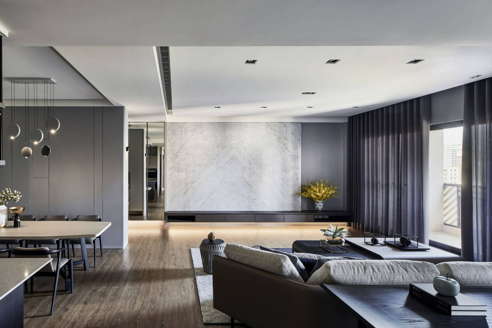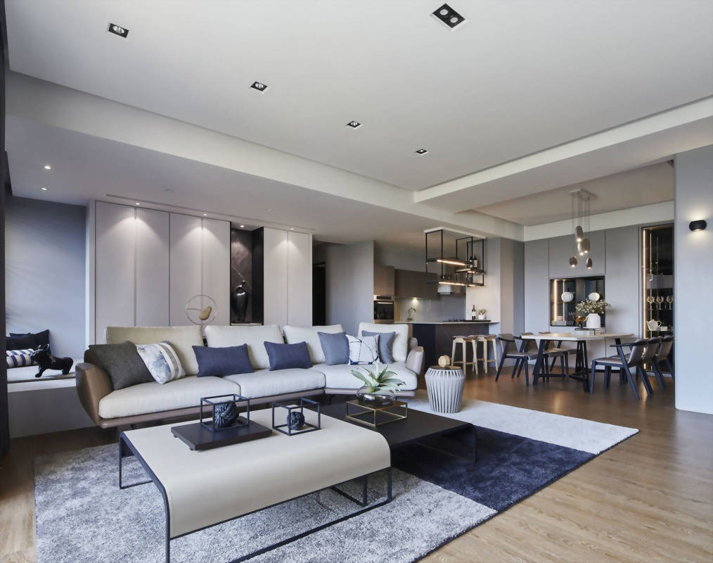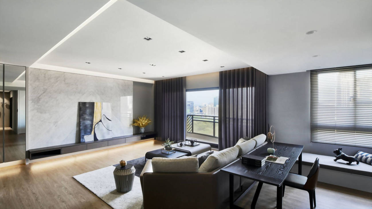公領域開放式規劃,開啟了大宅無邊際的視野,拉開窗邊落地簾幕,陽台外充沛的自然採光溜進生活領域。