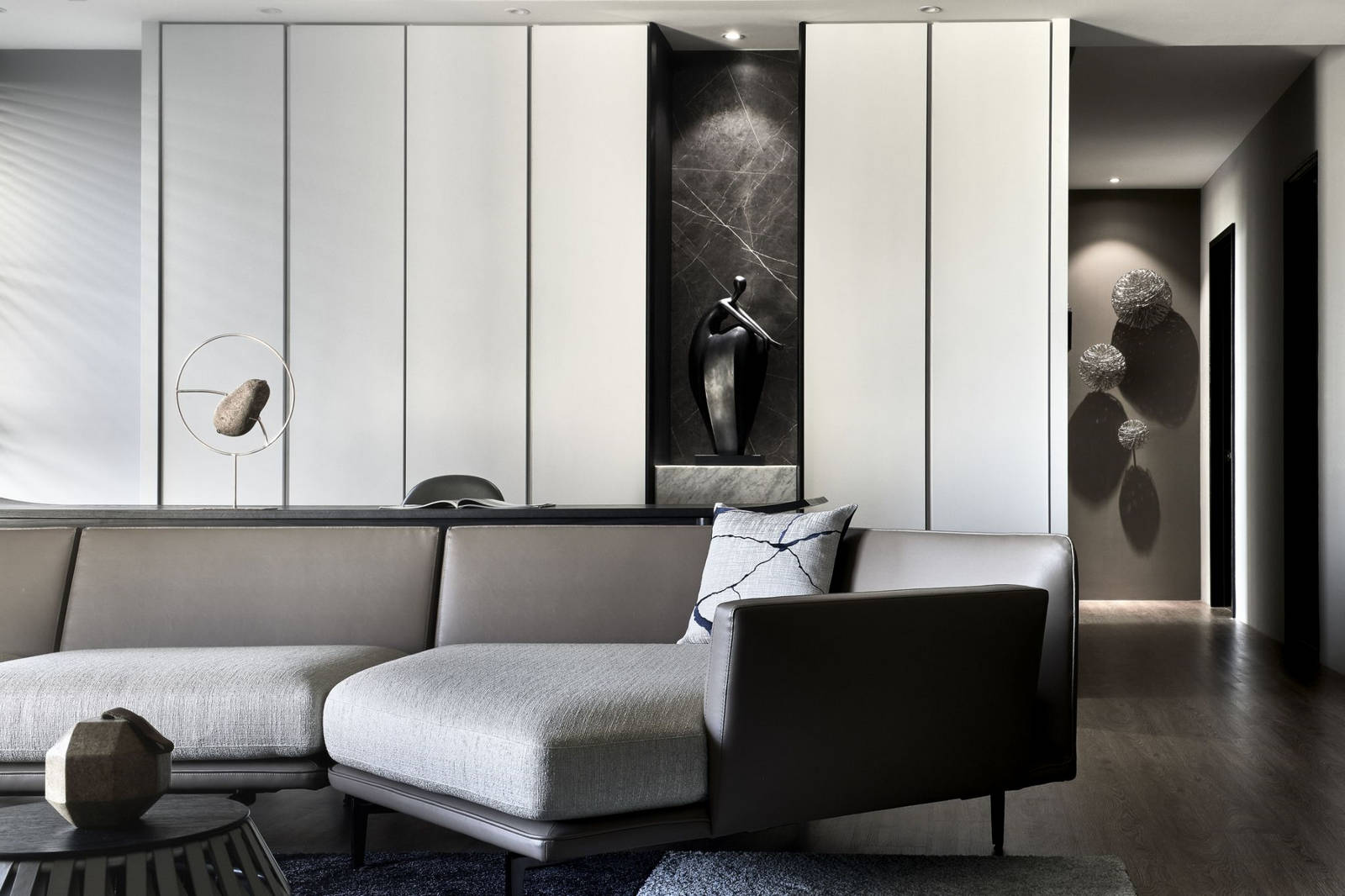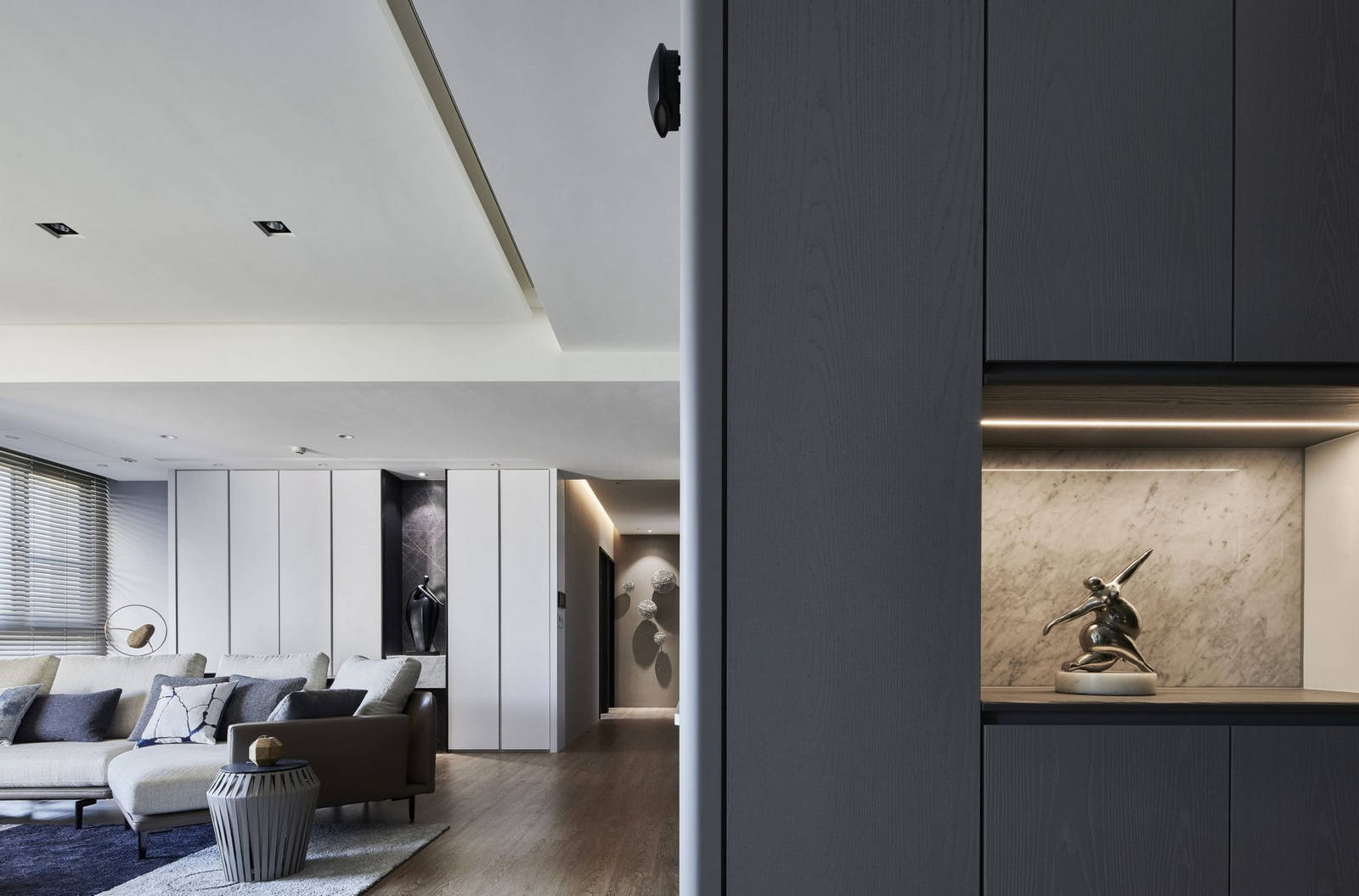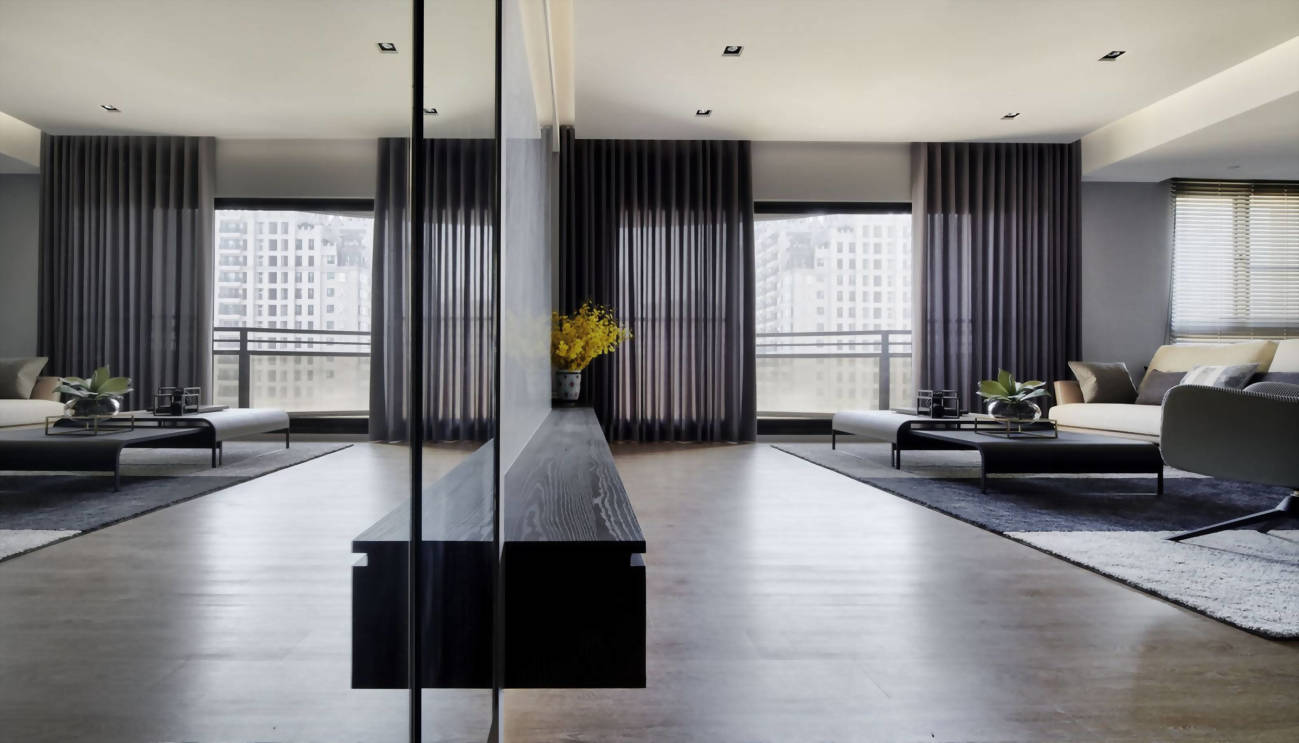 公領域開放式規劃,開啟了大宅無邊際的視野,拉開窗邊落地簾幕,陽台外充沛的自然採光溜進生活領域。