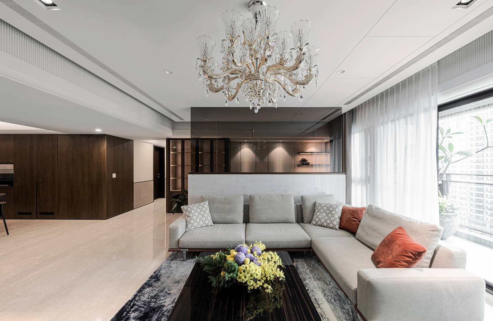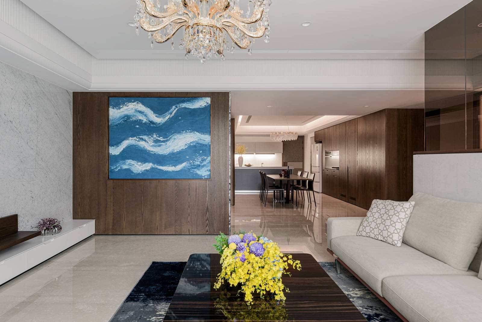 開放式客餐廚室內設計格局,透過低天花板作為空間設計領域分界,具有獨立分隔感,又能隨時與各領域交流,活絡大宅住家設計的生活互動性。