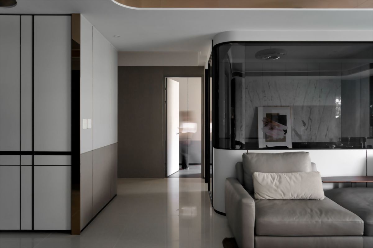 在客廳的空間設計上,可以很明顯的感受到無隔間的流通感,但卻仍能感受到空間設計的心思,細膩的照明設計,時尚內斂的配色,軟裝家具的相互襯托,打造出充滿時尚感的輕奢裝潢風格住家設計。