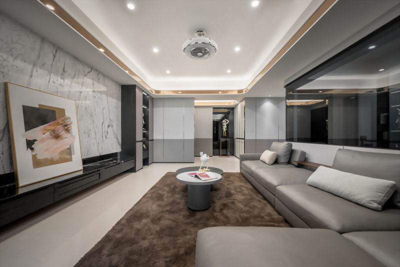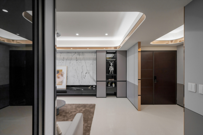 在少即是多的設計下,打造出了充滿簡約風格的室內空間設計,透過材質表現出輕奢的裝潢風格,石材牆壁的運用,金邊的點綴,系統櫃的設計配置,都襯托出了客廳設計的不平凡之處。