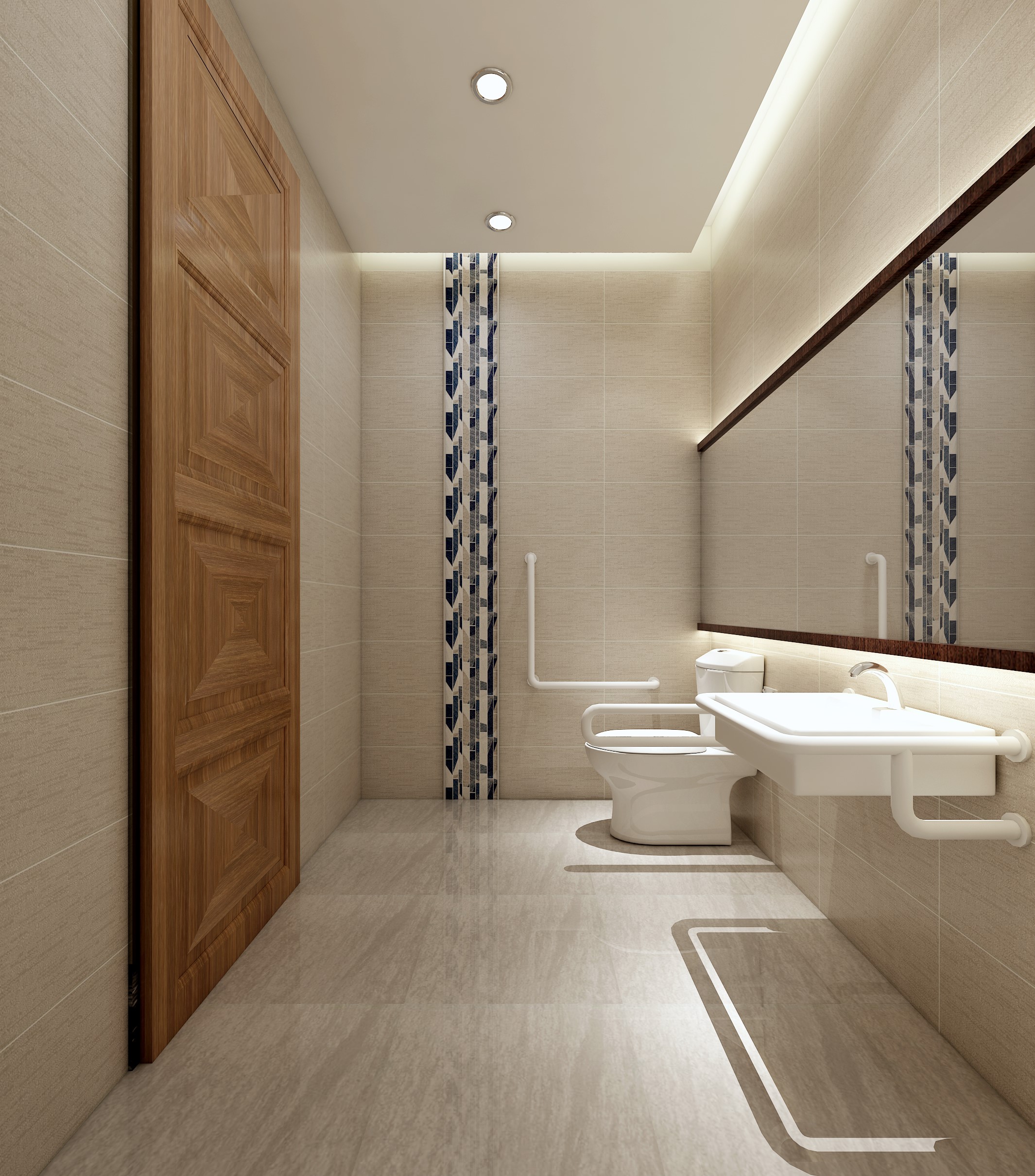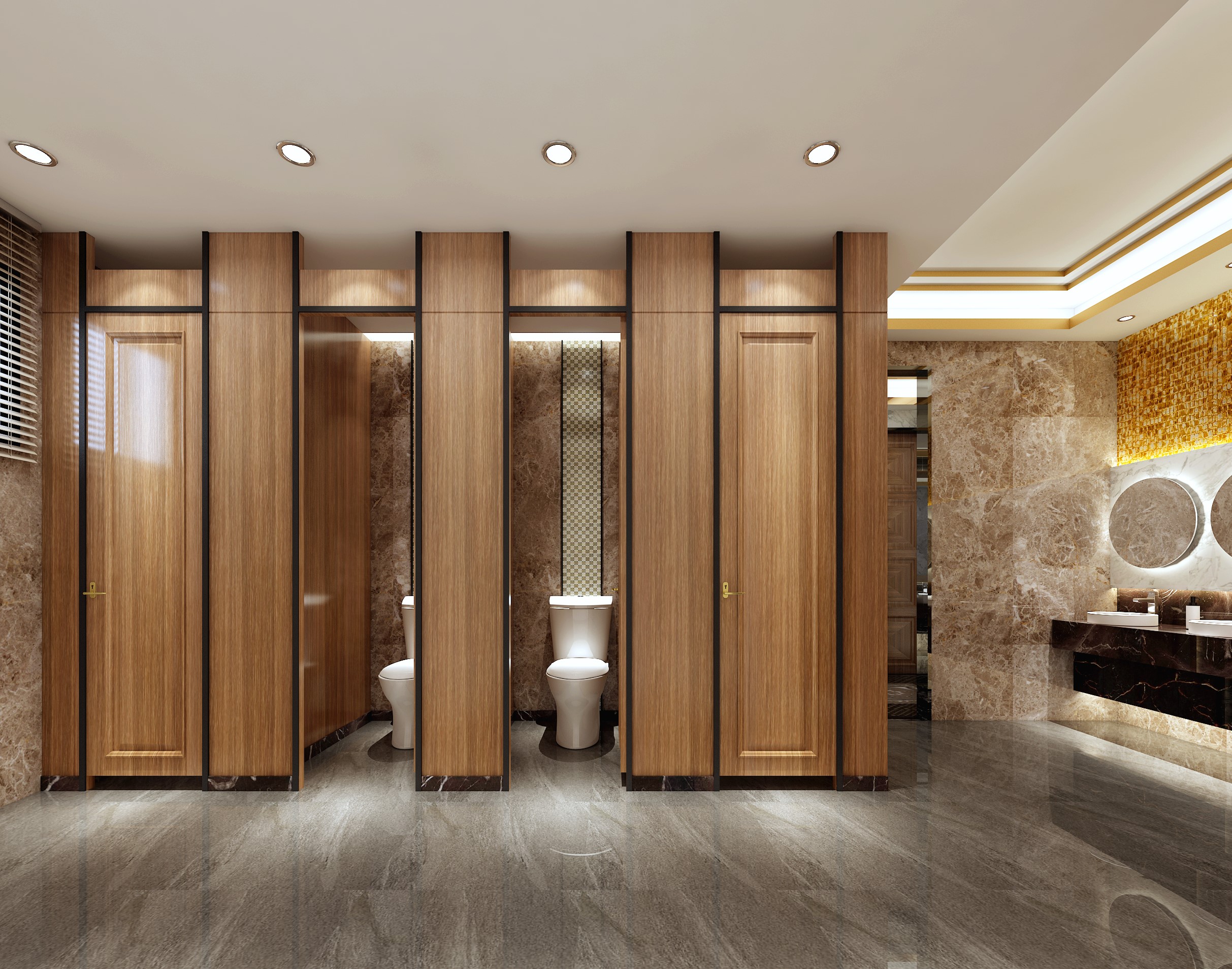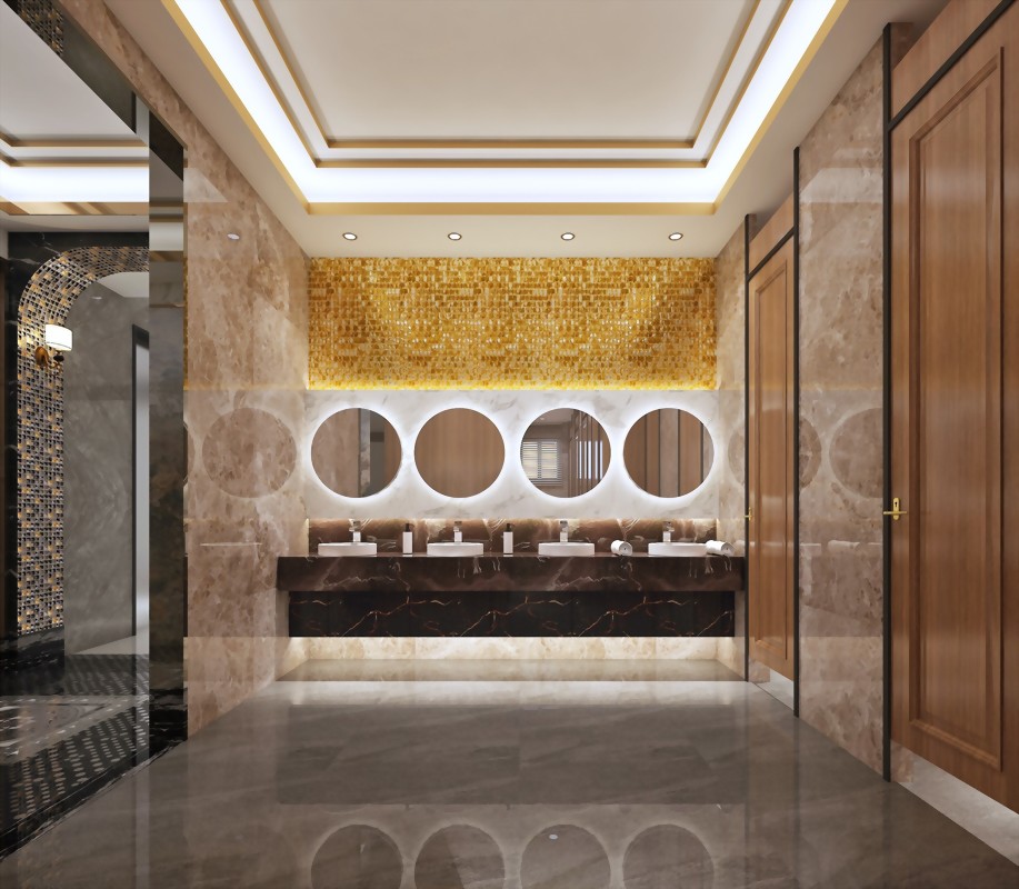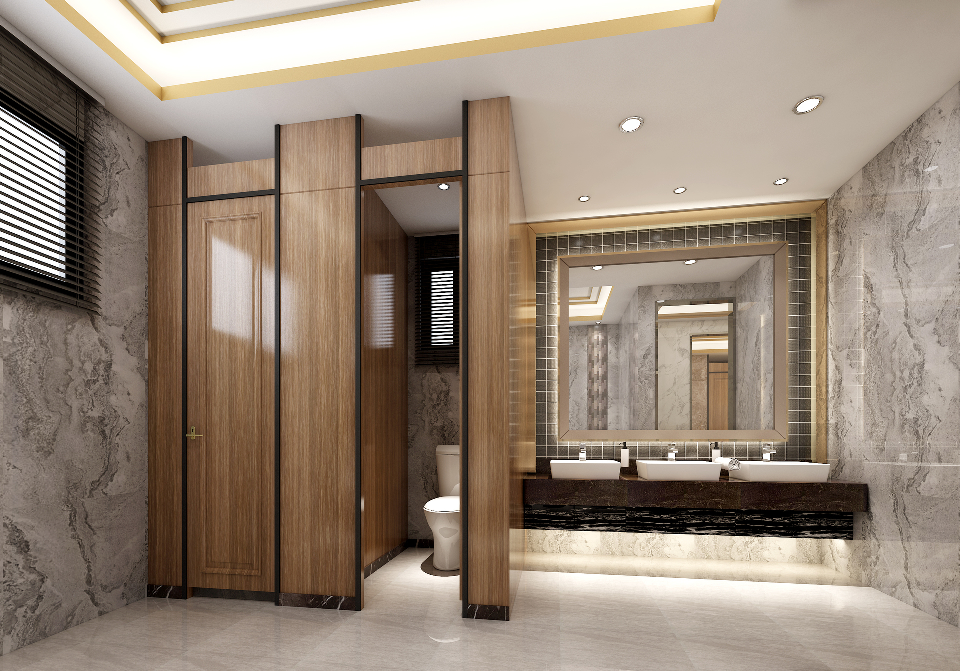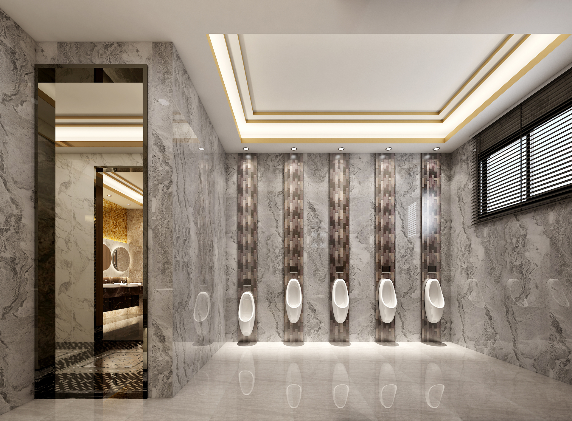 廁所整體設計採用大量的大理石材質,其堅硬、沉穩又富有變化的特性,讓整體不僅是乾淨具有設計感,而是完全打造出七星級飯店的高檔水準;再平凡不過的廁所空間,也能因而成為焦點,讓每個人都使用舒適,不再排斥公廁空間。