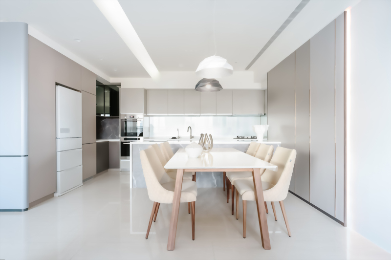 特別是其中一台為嵌入式冰箱,這樣的設計,不但發揮擺放收納的機能,也不因海量收納而使廚房看起來有壓迫感。