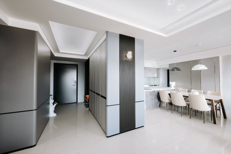 在玄關設計上,我們在原有格局上打造玄關設計的空間,將其拉長,迎賓氣勢及空間轉換的氛圍感更加強烈。