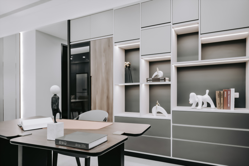客廳後方,也有局部開放式的書房書櫃設計。 簡單大器的空間,以多達六種配色的書櫃作為多功能展示櫃,讓一向走實用派的系統櫃變身為精品時尚書櫃。