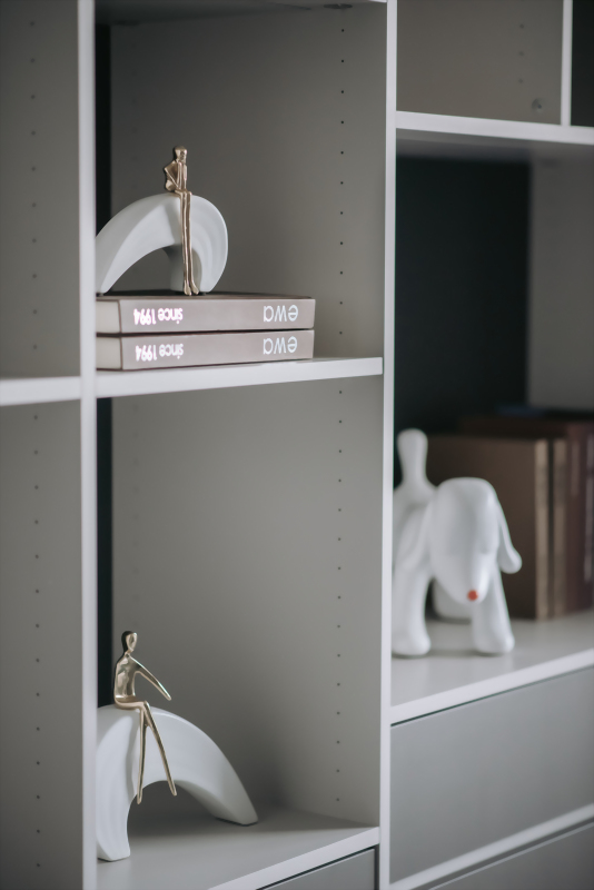 電視牆的設計也同樣吸睛,不只是單純的牆面設計,右手邊也多設計了展示櫃的功能加以點綴,有了展示及藝術品的陪伴,電視牆面看起來更活潑有趣。