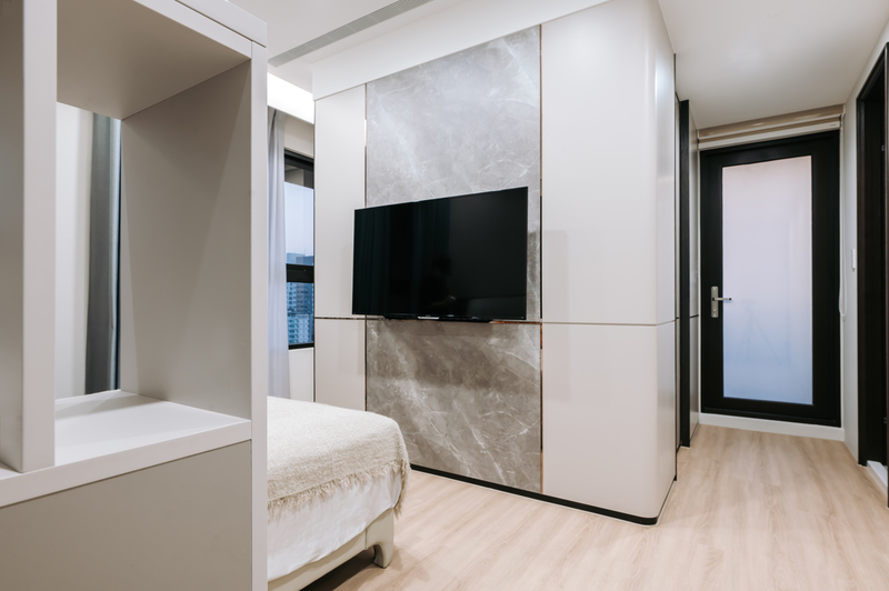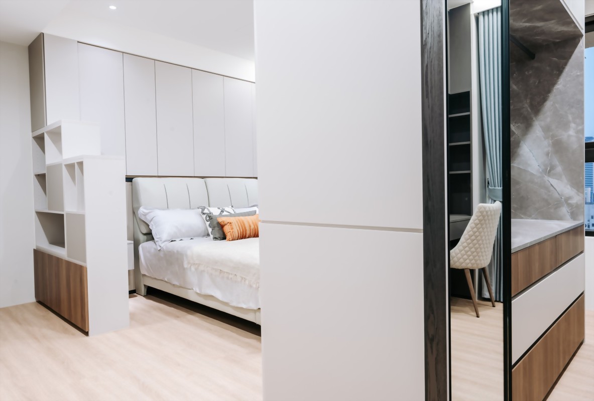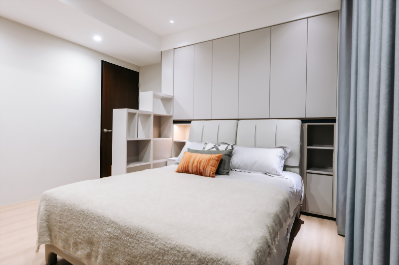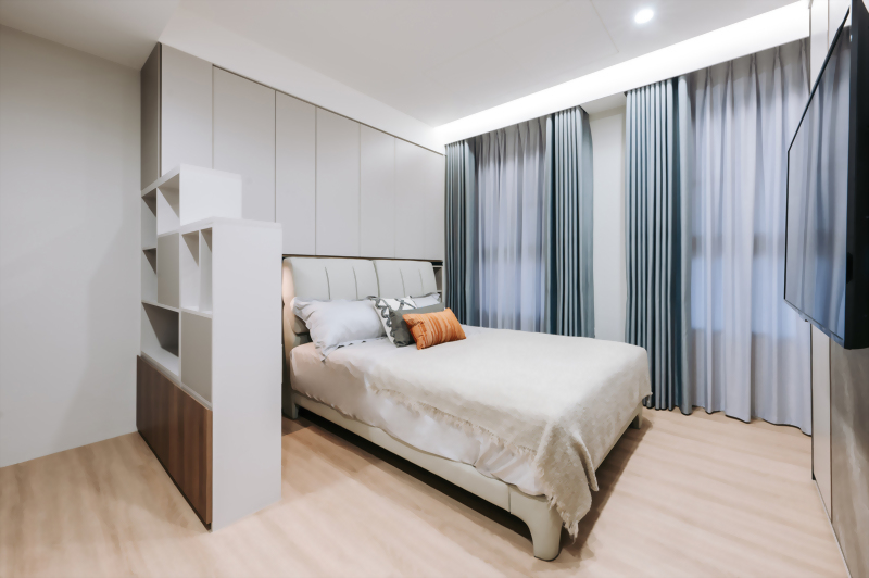 床組兩側的開放空間及櫃體插座、睡前的床頭燈及所需的充電設備等細節缺一不可,在這設計中皆一一被滿足了。
