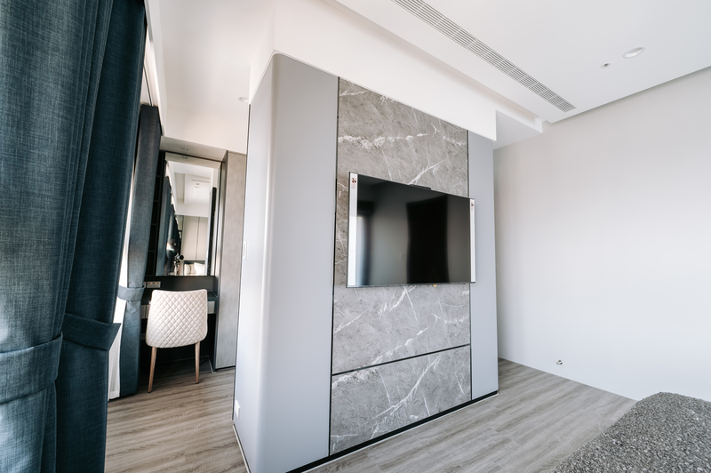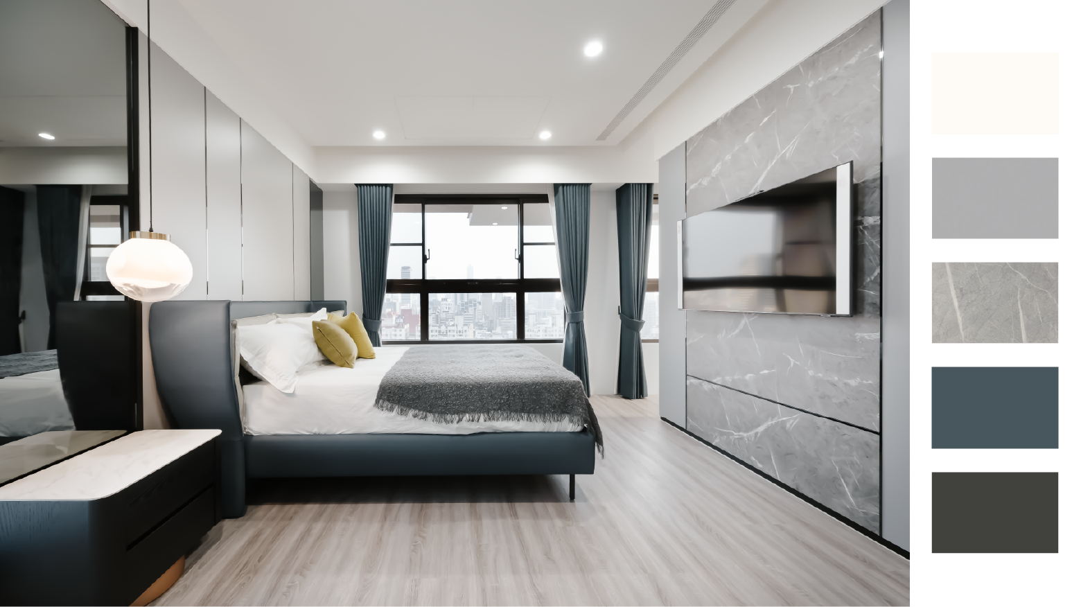 以造形板石紋電視牆搭配藍綠色的軟裝,所有的衣櫃都是選用系統櫃材料,這樣面面俱到的搭配,充份展現硬裝設計及軟裝設計的重要性,兩者是如此密不可分。