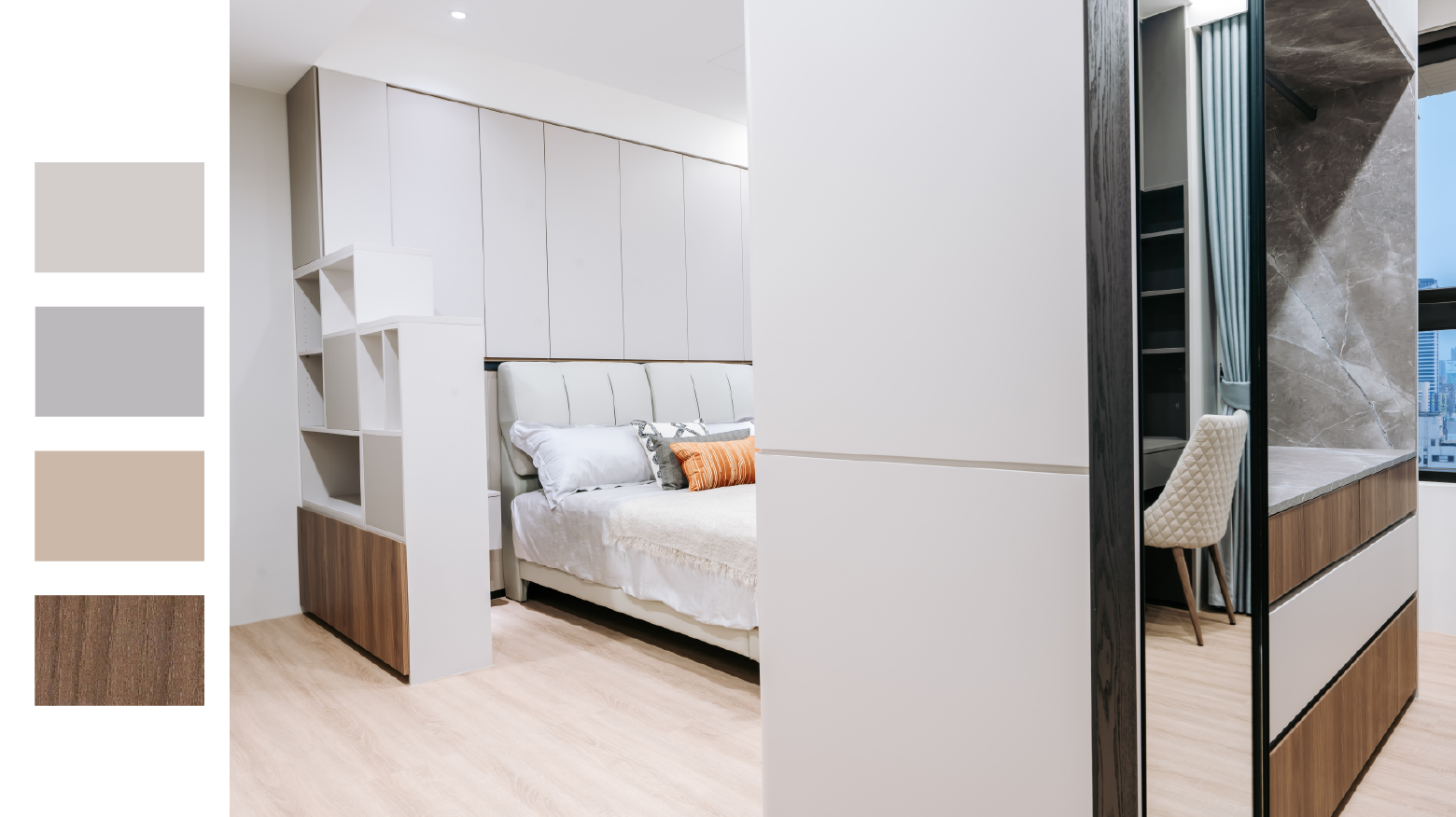 整體以淺色木質地板打造溫馨感,色調再搭配米色及灰褐,暖暖的色系舒適感受立即加滿分。