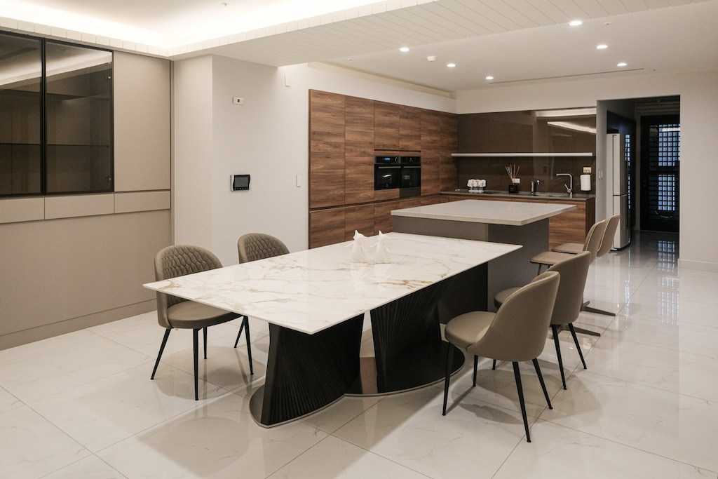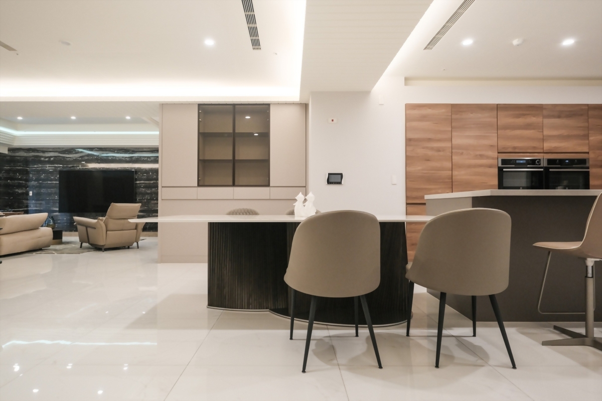 不僅新增餐點、設備的擺放位置,中島設計也為空間做出了黃金切割,讓公區域各自獨立卻又不顯擁擠。