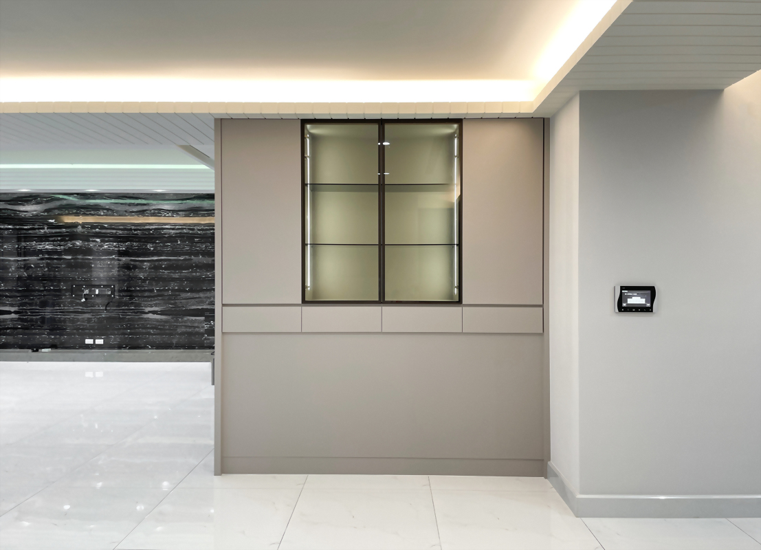 原本的餐櫃是以深色櫃體搭配亮黃色的透光板佈置而成,在Allen總監的巧思下,將原本的櫃體換成了灰色系,並搭配門板變成精緻又時尚的展示櫃。