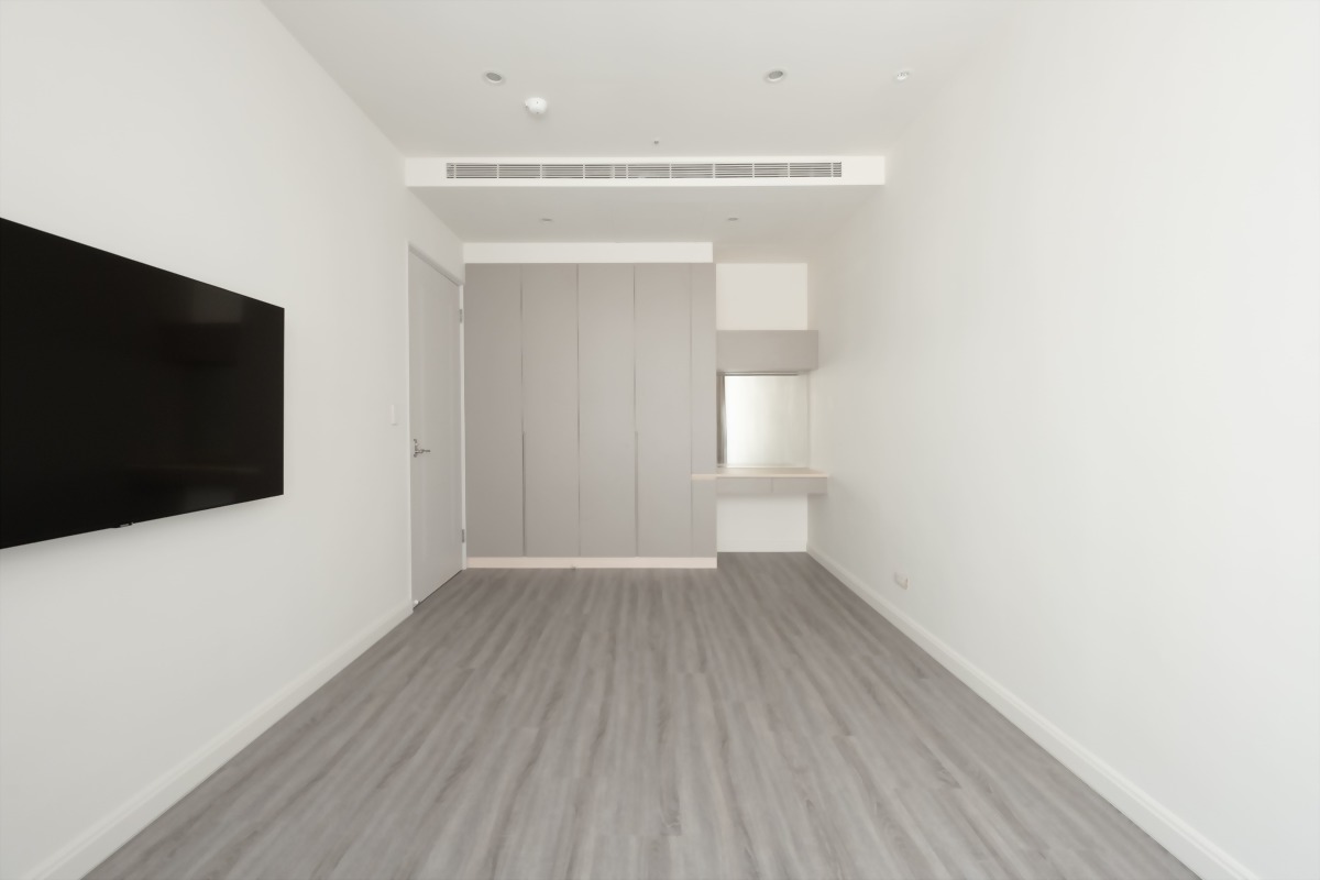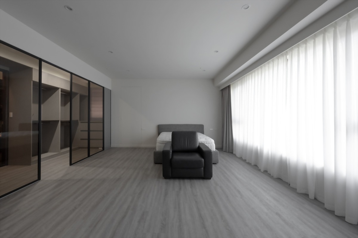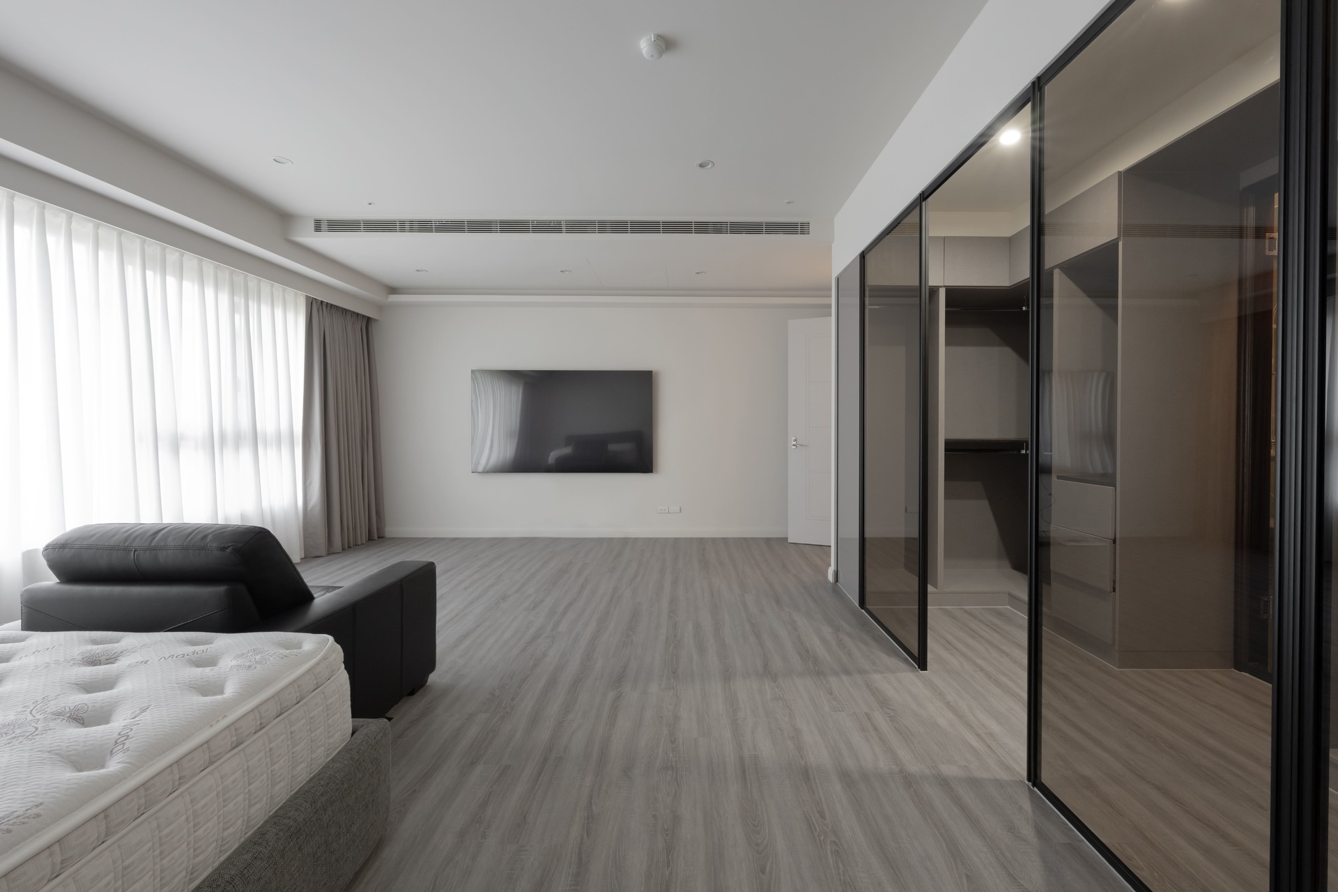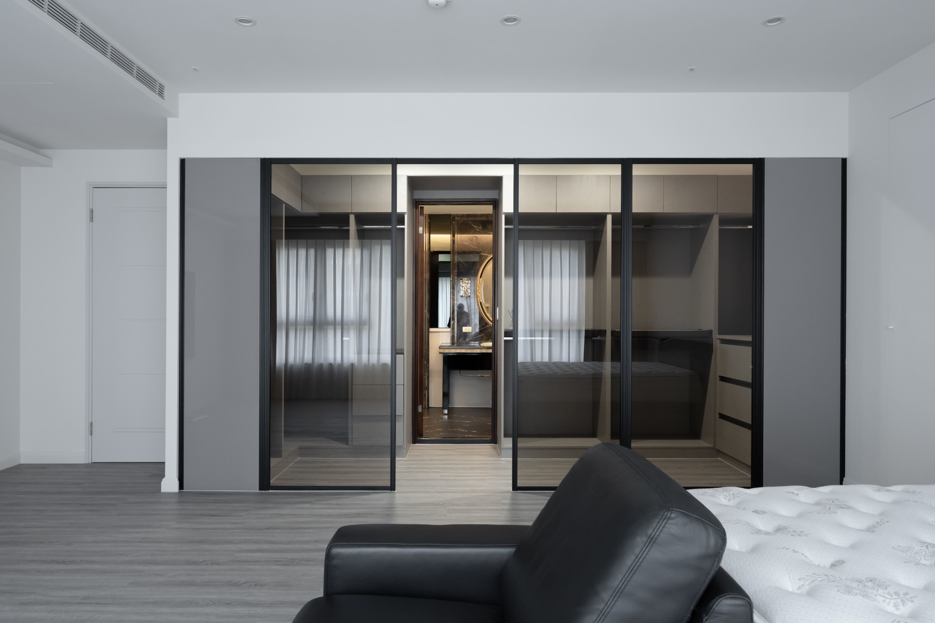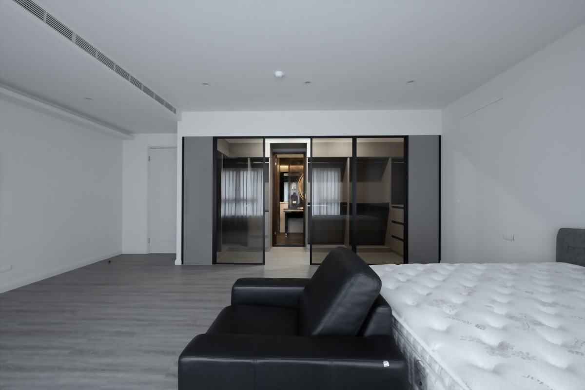 在主臥室設計部份,整體也做了全新的色彩規劃,亮色已經不復見,取而代之的是現代簡約的低調灰,並搭配烤漆玻璃做出清爽時尚的質感。