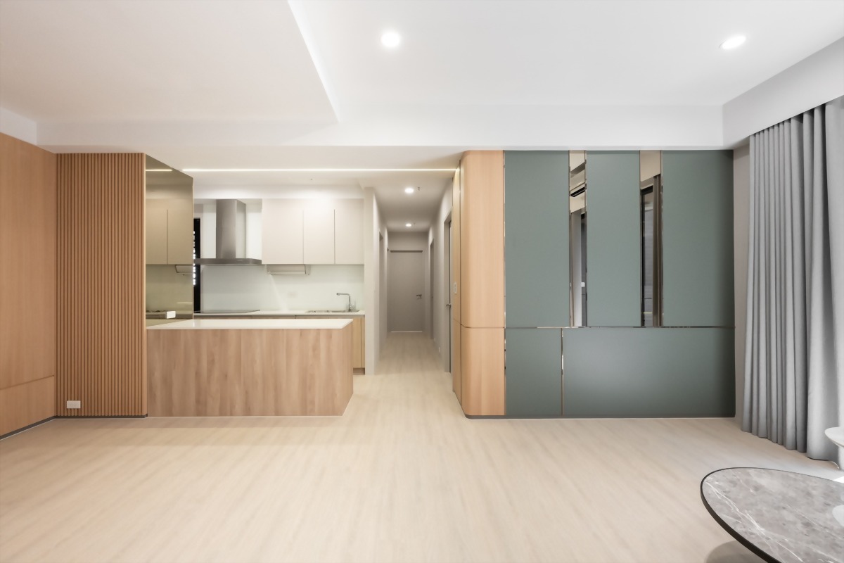 在設計上運用了多元素的結合,包括線條的運用、復古綠美耐板的巧思,還有原木、金屬及鏡面的多重材質結合,打造了活潑氛圍且讓整體具有層次感。