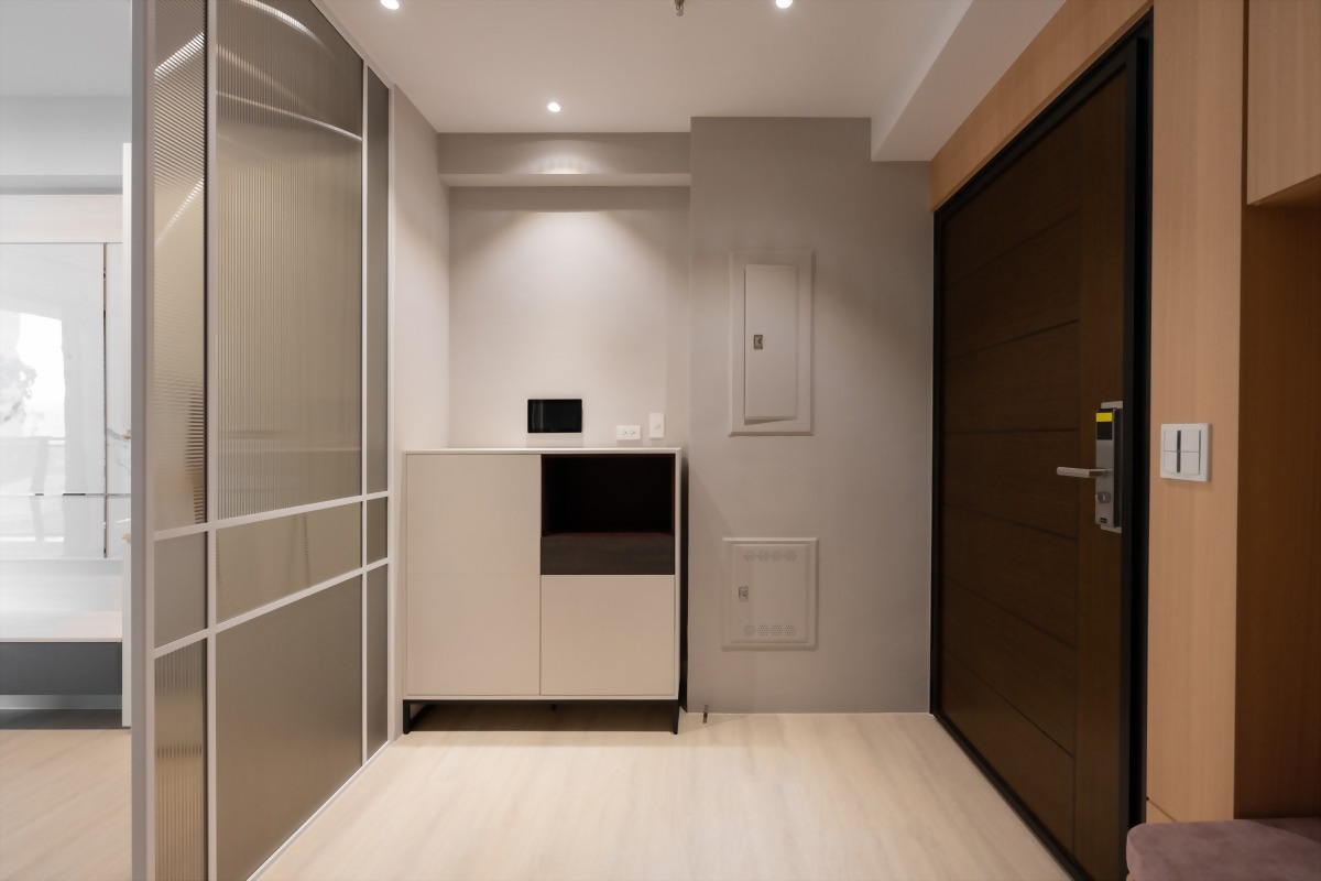 為了讓玄關整體空間看起來較輕盈,玄關鞋櫃便以現品訂製半高櫃並備有穿鞋椅。