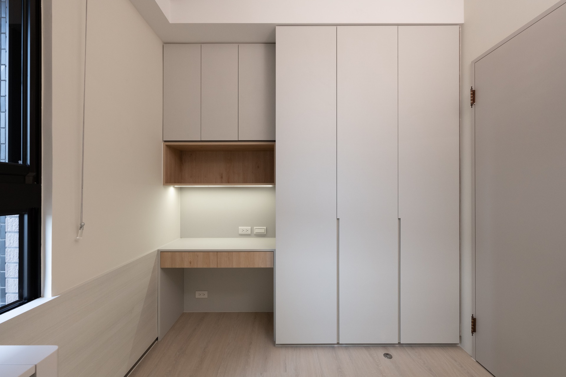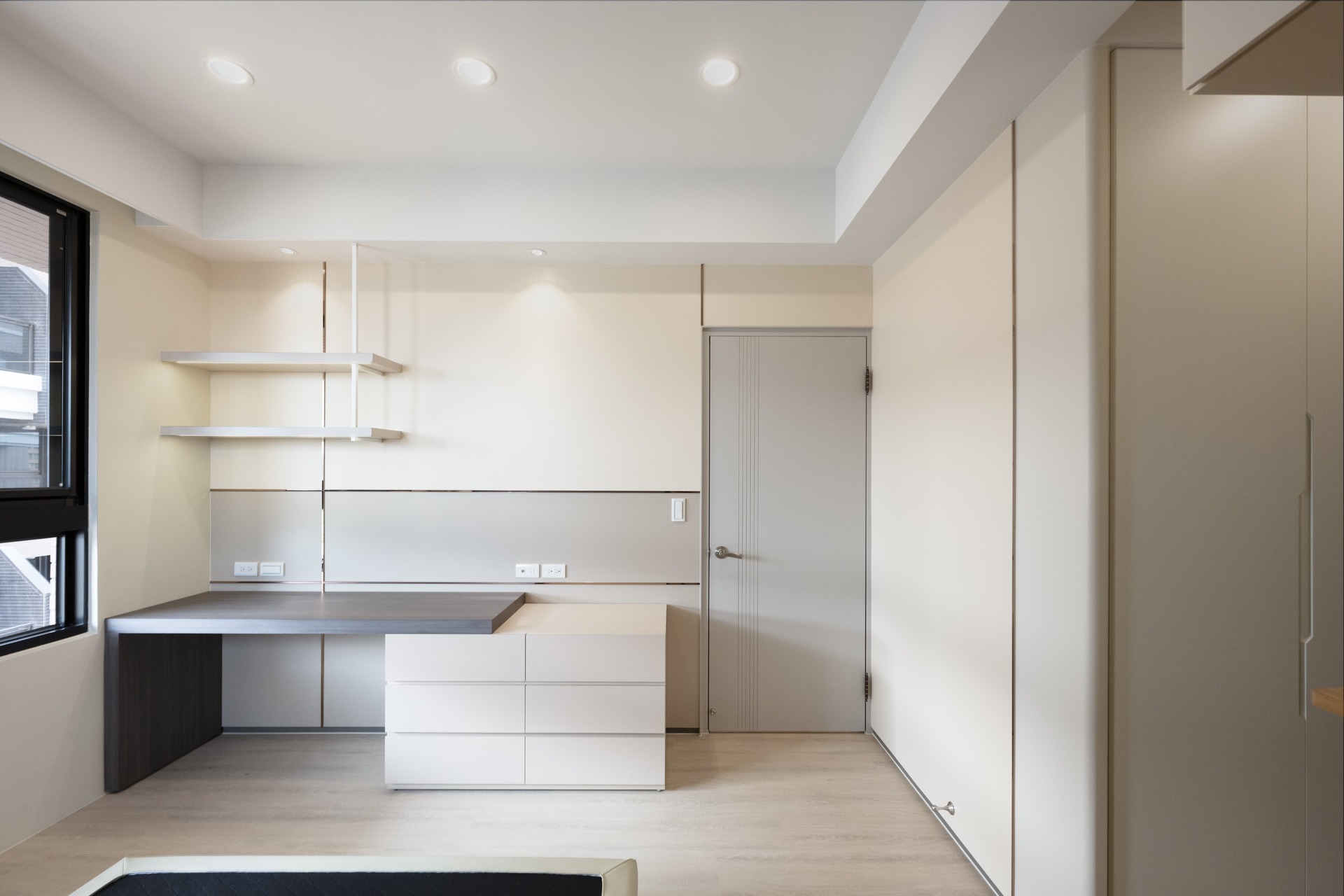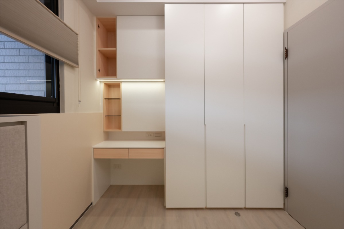 不管是系統櫃衣櫃、吊櫃、書桌等,皆使用米色、灰色等素色為各自的空間配色;為空間創造輕盈感,並讓空間感受更寬敞。
